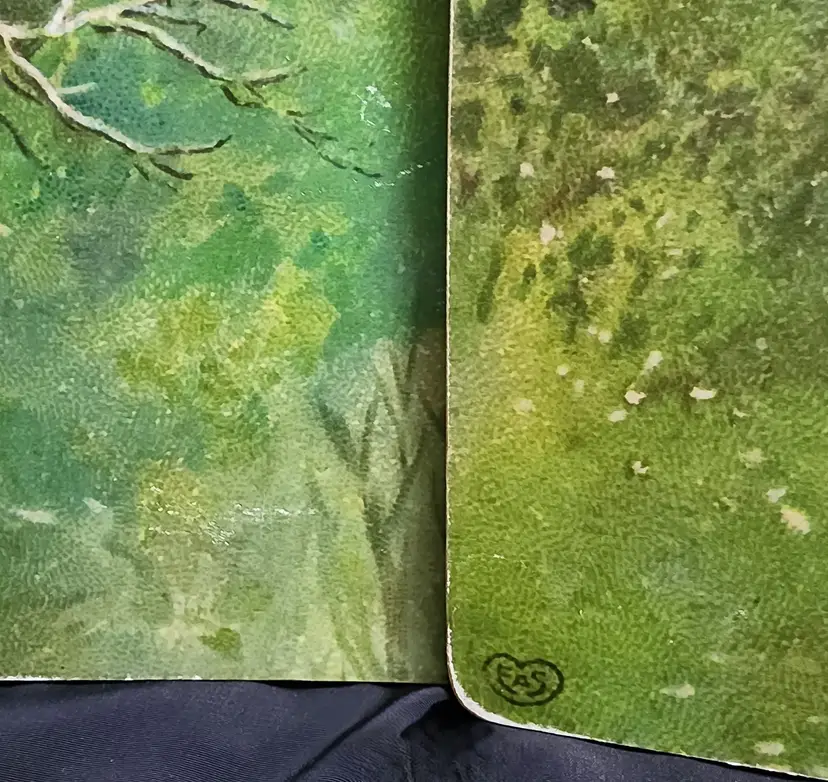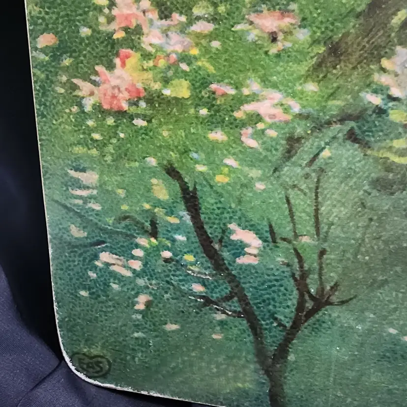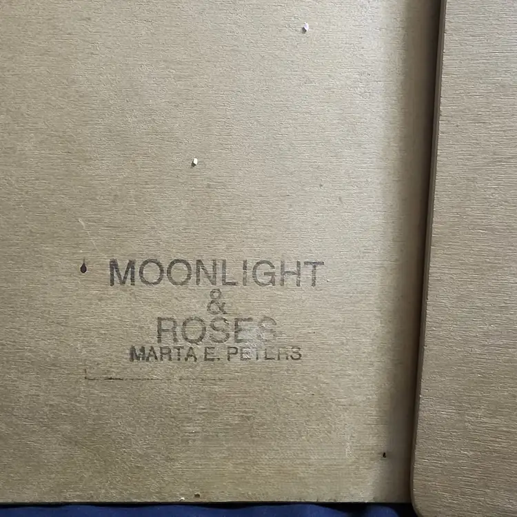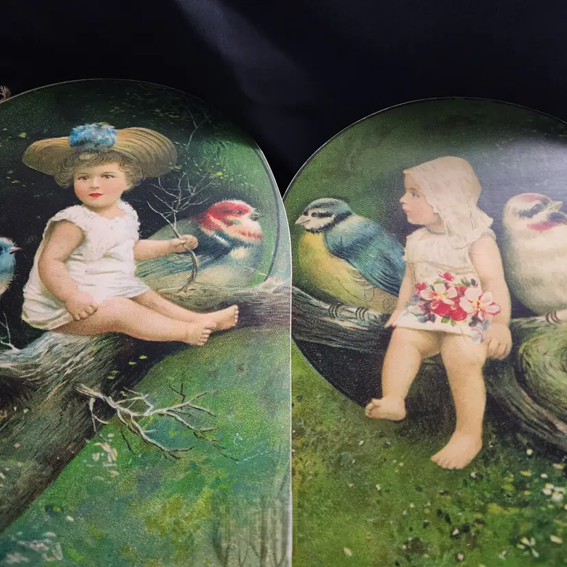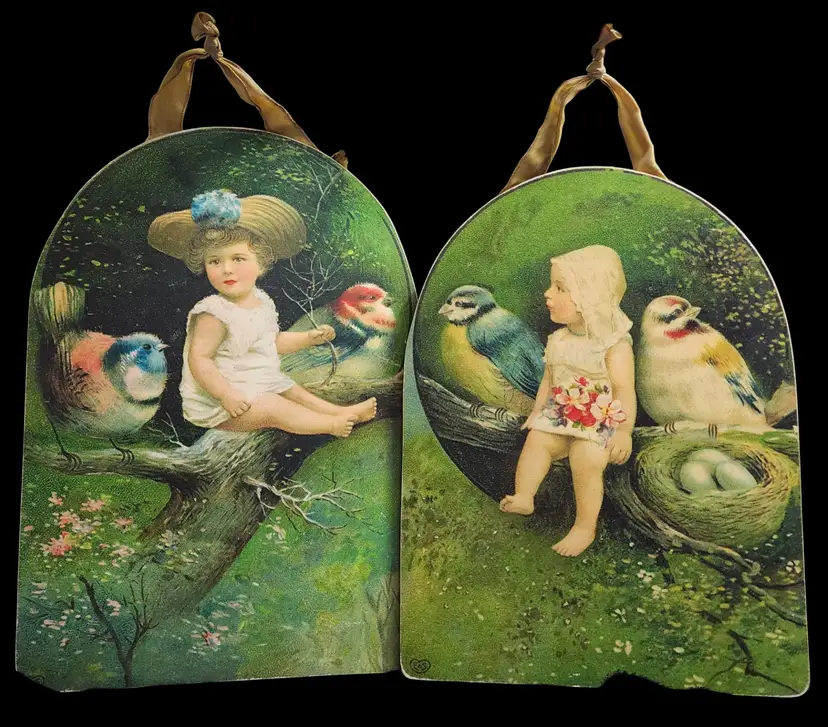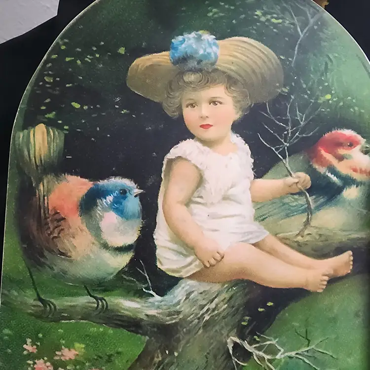 Darling Moonlight & Roses plaques by Marta E Peters. Both have a young girl sitting on a tree branch with birds. A lot of these pieces are taken from antique advertising.