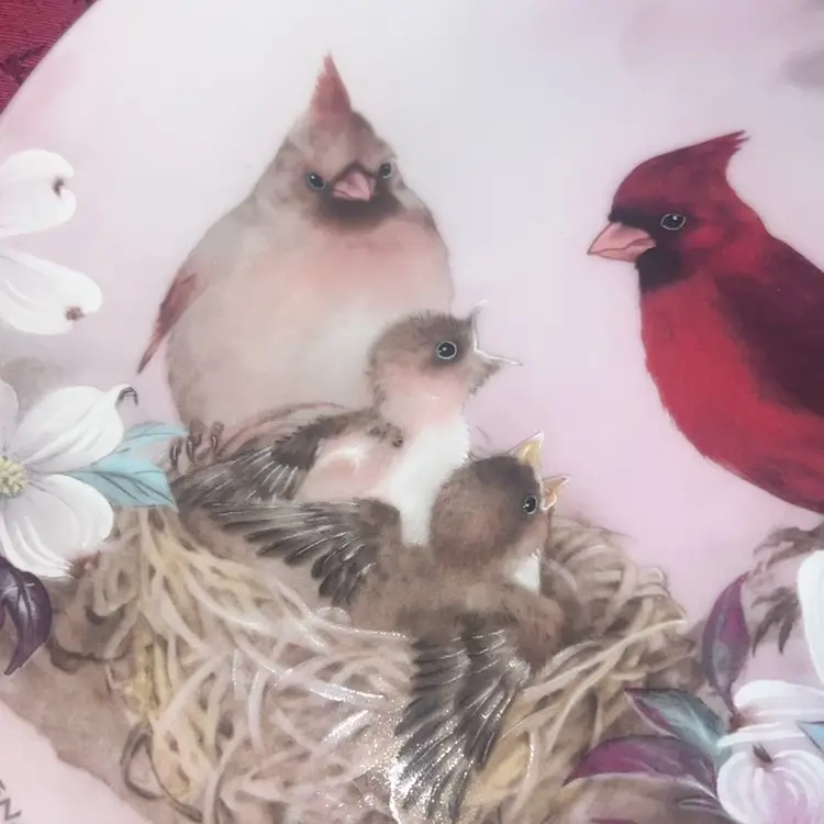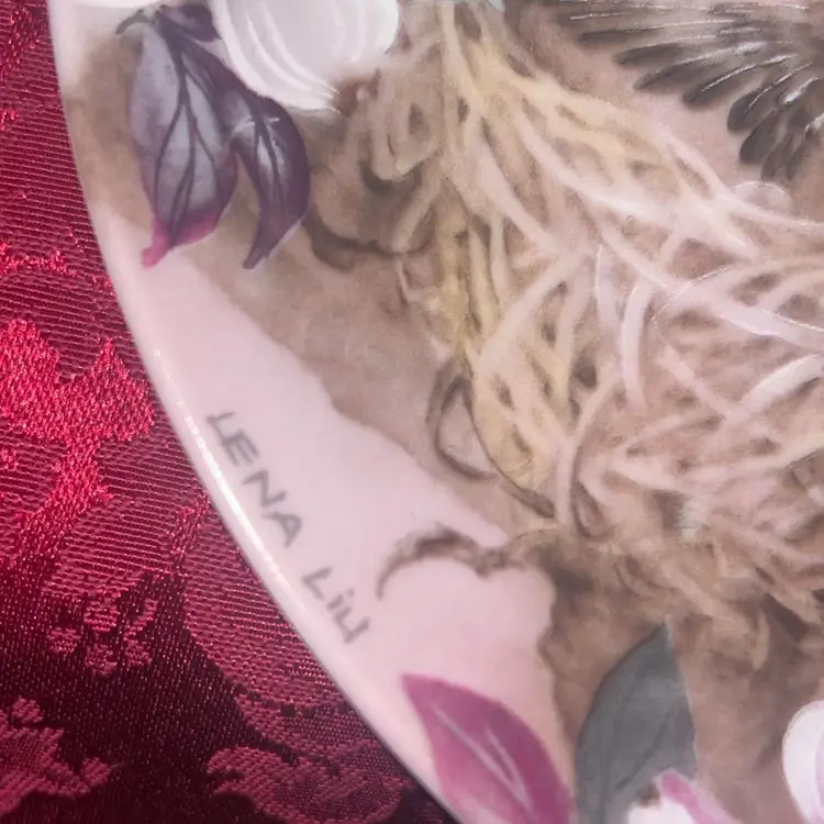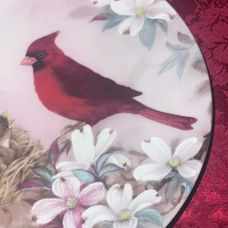 This is a "Morning Serenade" collector plate from the Nature's Poetry collection by artist Lena Liu, crafted in 1989 by W.L. George Fine China.