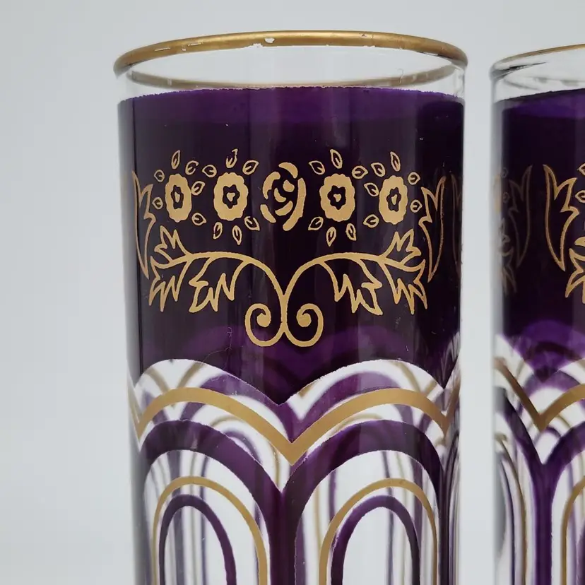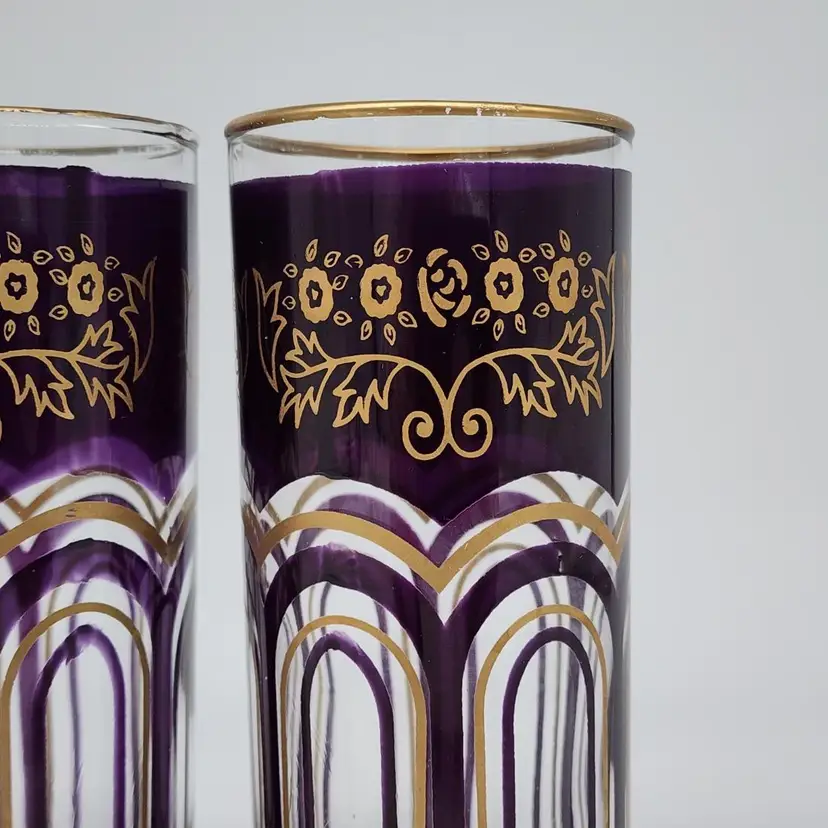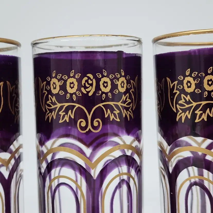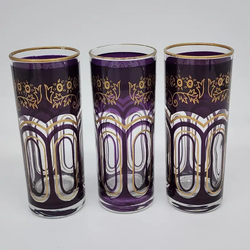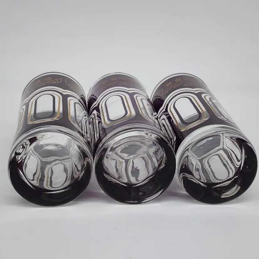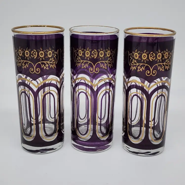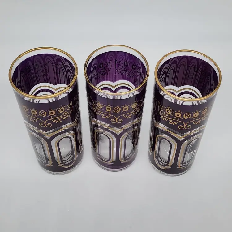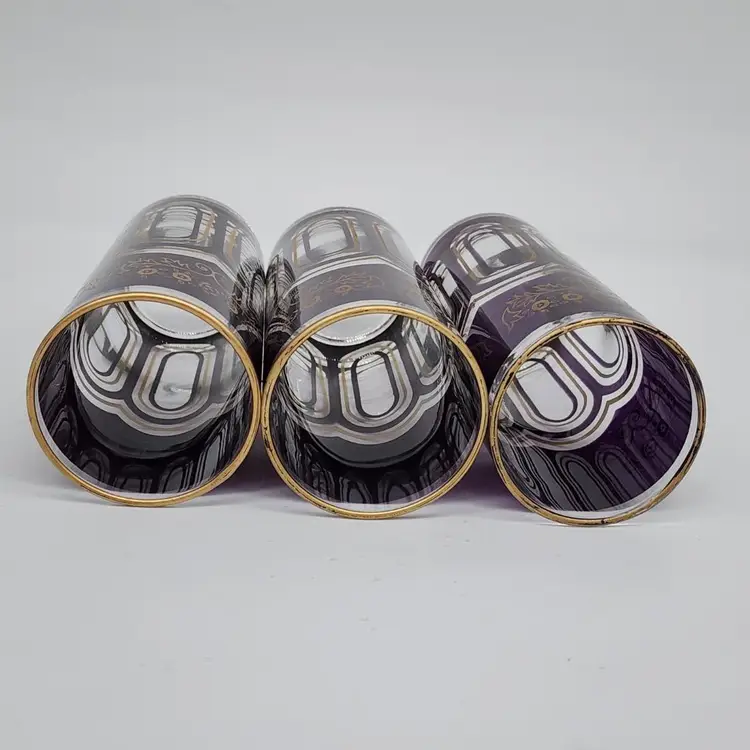 Exquisite set of 3 Moroccan tall tea glasses in dark purple with gold accents, vintage MCM style. With their unique design and high-quality material, they are perfect for serving your favorite hot or cold beverages. 6" Tall