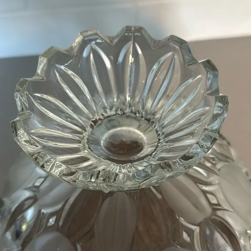 The bowl features alternating clear and frosted crystal sections resembling tulip petals, forming a scalloped edge. It is a pressed glass centerpiece bowl on a pedestal