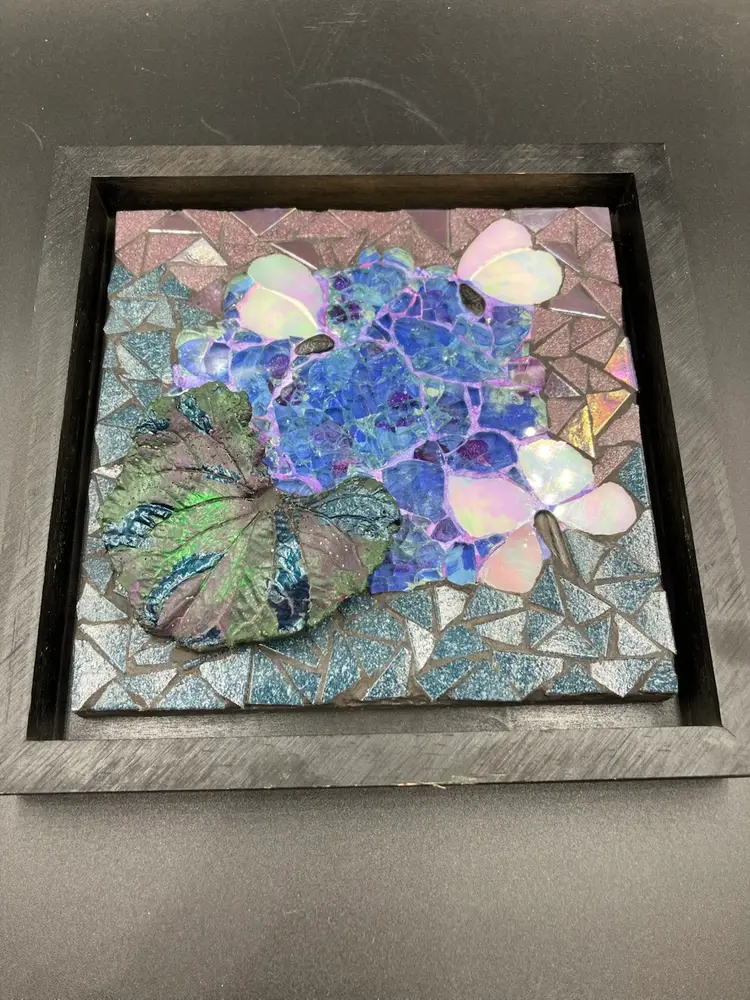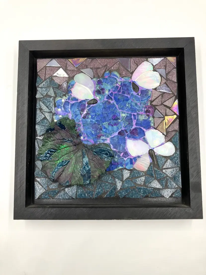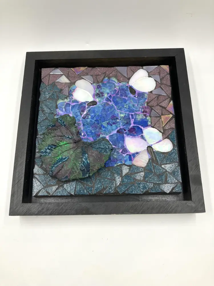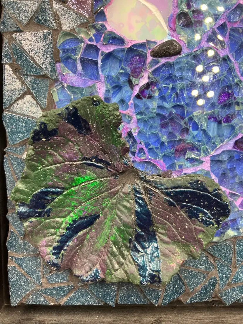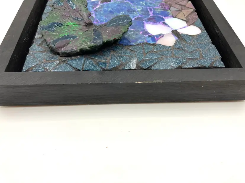 Pat is a member of the Blue Ridge Mosaic Artists in Virginia. Note there is a small chip on the bottom of the leaf that could be touched up with paint, and a small area of paint wear on the bottom edge of the frame. Measures 8” square and 1” deep.