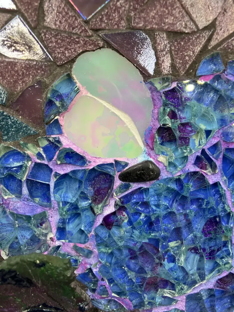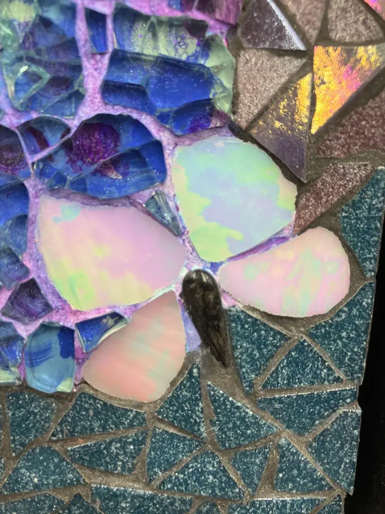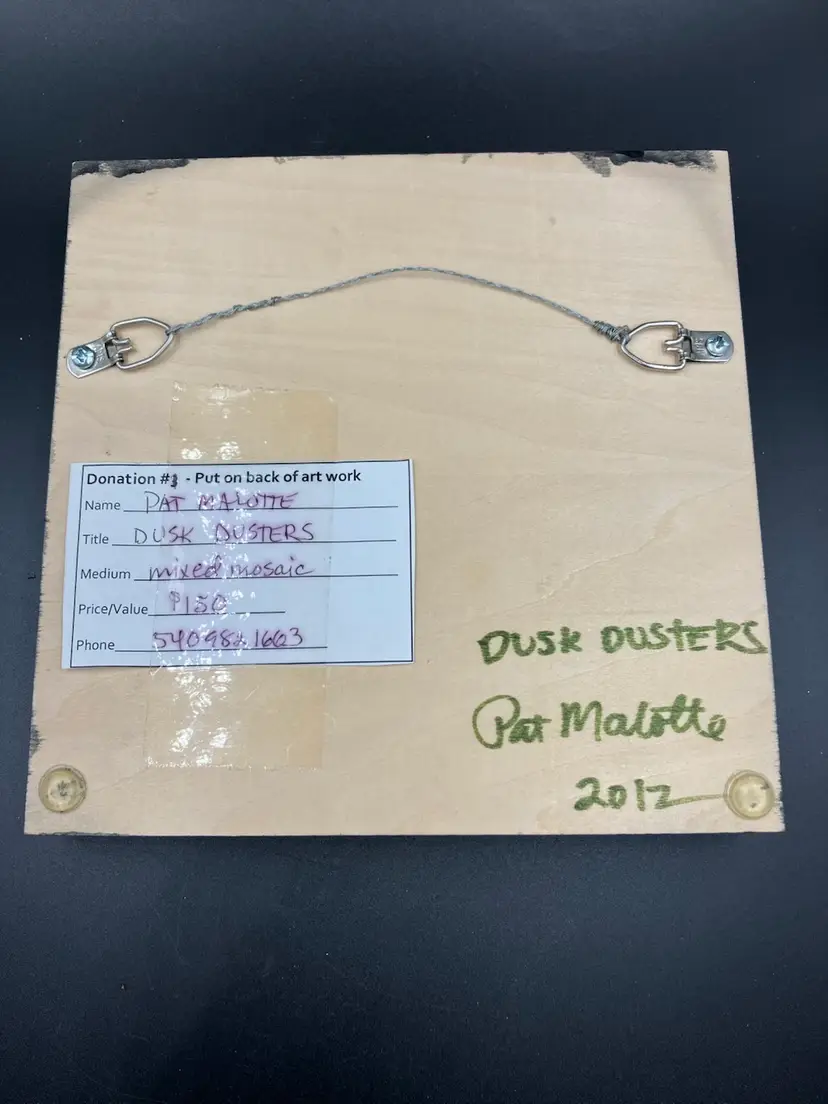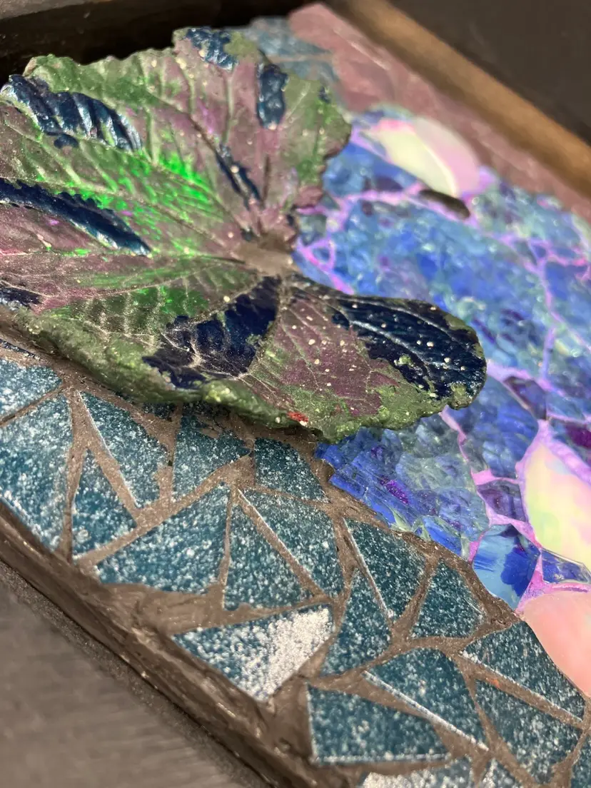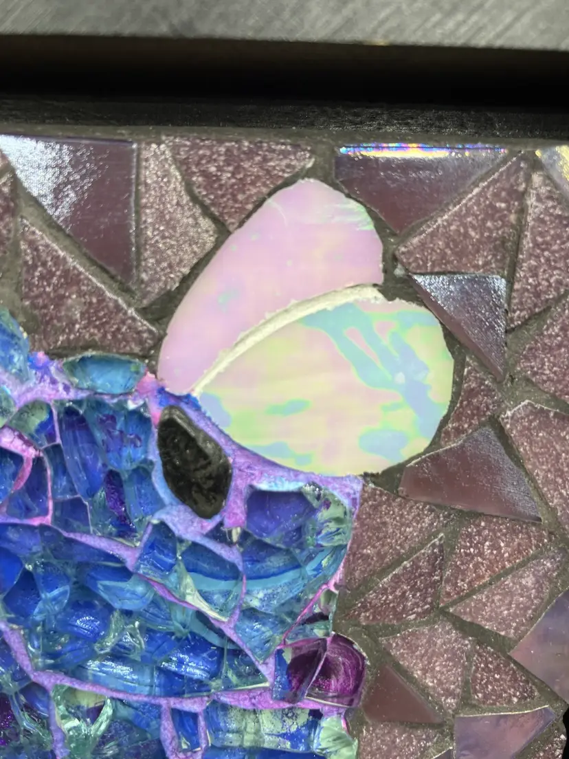 Pat is a member of the Blue Ridge Mosaic Artists in Virginia. Note there is a small chip on the bottom of the leaf that could be touched up with paint, and a small area of paint wear on the bottom edge of the frame. Measures 8” square and 1” deep.