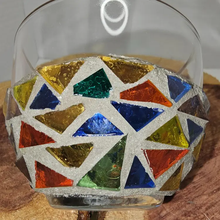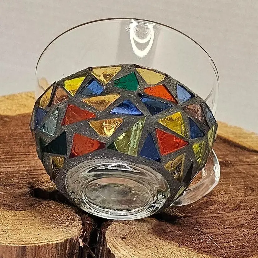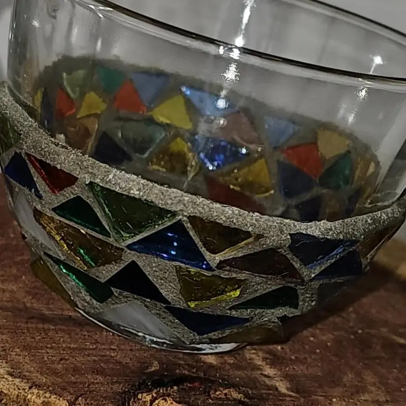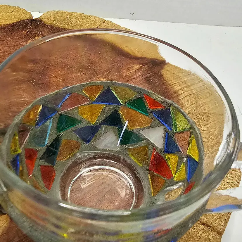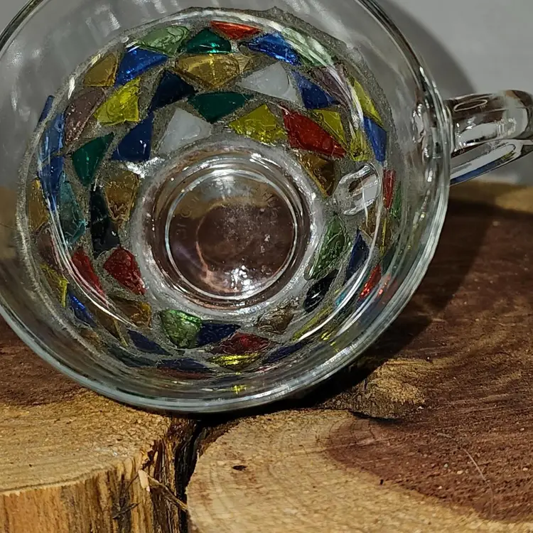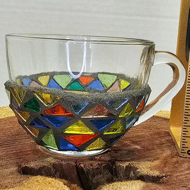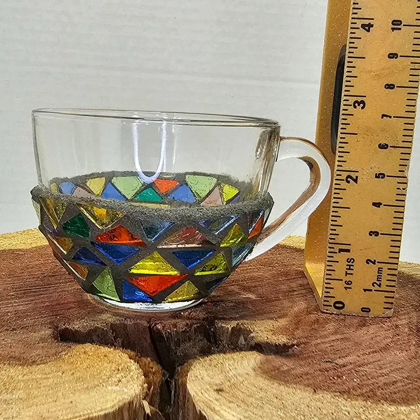 This is a glass mug with applied stained glass effect on the outer side. It looks leaded but I am far from an expert. Please refer to the photos. This certainly looks handmade. I am unable to tell if it was manufactured this way. I could not find any like it online. This piece is heavy and it held hot liquid fine. I did not test it in a microwave or dishwasher. It seems to warrant hand washing. I picked it up due to its beautiful coloring and uniqueness. Please refer to the photos for exact condition. I is in great used condition and I do not feel any flea bites or chips. Thank you for shopping with Beetle's Rucksack.