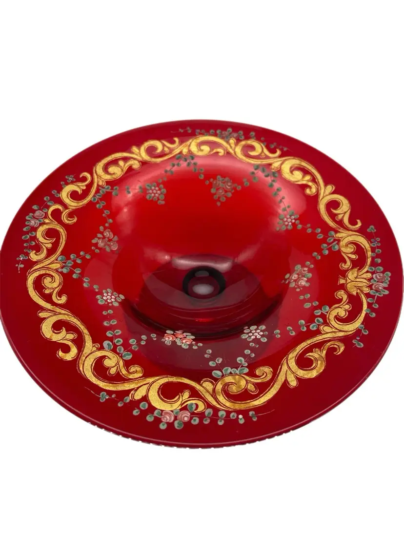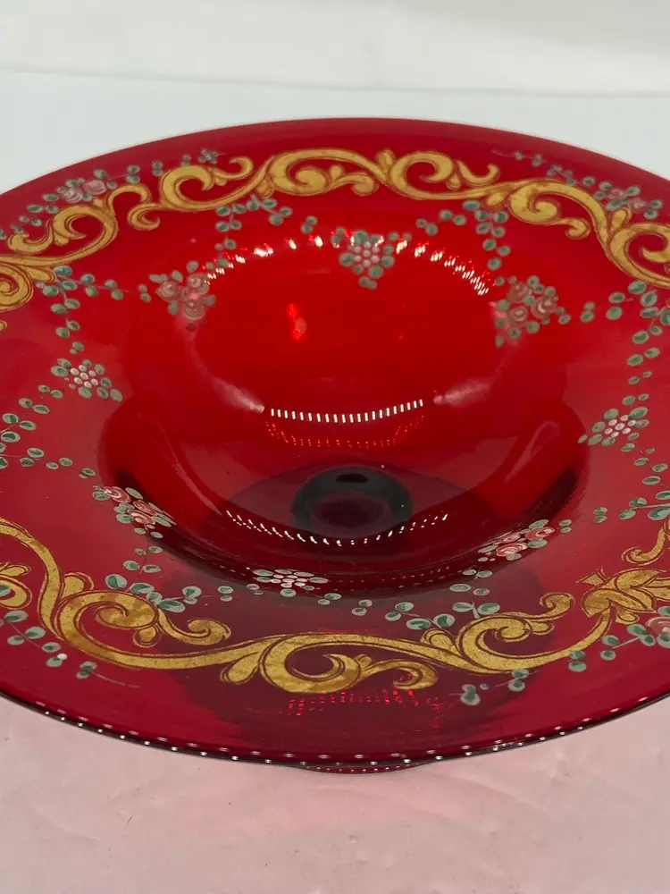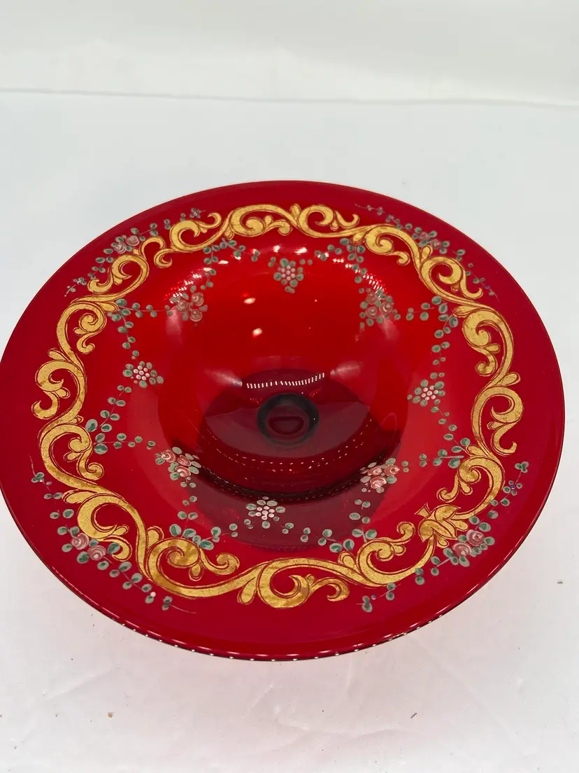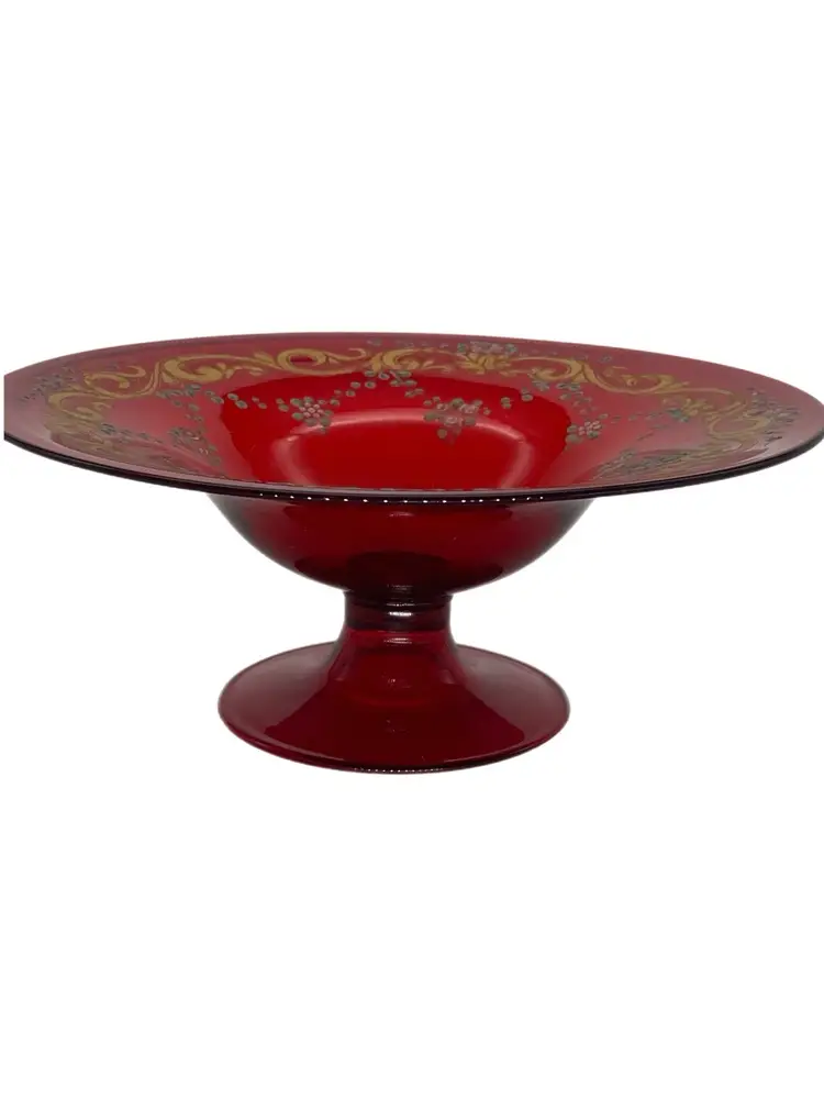 Believed to be Moser Salviati Venetian Murano Ruby Red Hand Painted pedestal 1940’s Compote bowl. 7” wide x 3” tall.