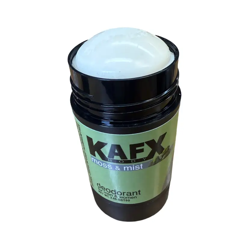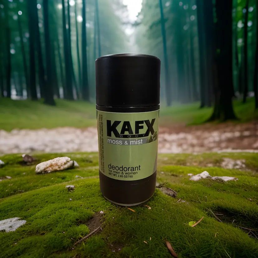 KAFX BODY Moss and Mist NATURAL COFFEE INFUSED DEODORANT SMELLS LIKE: a fresh and clean smell that will remind you of walking through the wet soaked woodlands early in the morning CONTAINS ZERO: ALUMINUM, PARABENS, PHTHALATES, SULFATES, OR DYES Introducing our revolutionary coffee-infused natural deodorant, meticulously crafted to provide unparalleled odor control while prioritizing your health and wellness. What sets our deodorant apart is the transformative power of coffee oil, an exceptional ingredient known for its remarkable ability to eliminate body odor without relying on harmful chemicals. Coffee oil, with its potent antioxidant properties, not only enhances skin health by combating free radicals but also acts as a formidable odor eliminator when incorporated into our deodorant. By harnessing the benefits of this unique ingredient, we have created a deodorant that goes beyond conventional solutions, providing a truly exceptional and natural odor-controlling experience. As dedicated parents to triplet sons, we intimately understand the significance of using safe and natural products. That's why we developed this deodorant specifically for our own family. We wanted a reliable solution that would safeguard our sons' delicate skin during their active days without exposing them to harsh chemicals. Our gentle yet powerful natural deodorant effectively curbs odor throughout the day, ensuring you feel fresh and confident in any situation. Its enduring formula provides all-day protection, allowing you to embrace each moment without worries. With meticulously chosen natural ingredients and the infusion of coffee oil, our deodorant presents the ideal choice for those seeking a wholesome and efficacious alternative for odor control and skin health. Bid farewell to harmful chemicals and welcome a deodorant that genuinely cares for your skin. Embrace the transformative power of nature with our coffee-infused natural deodorant, and experience a new level of freshness and vitality. Trust us to deliver a product that not only meets your expectations but exceeds them, revolutionizing your daily routine with the power of natural ingredients. INGREDIENTS: organic arrowroot powder, coffee infused coconut oil,organic coconut oil, organic beeswax, organic shea butter, cornstarch, magnesium hydroxide powder, fragrance oil HOW TO USE: Remove cap, twist bottom, and apply 2-3 swipes to armpits or anywhere the body that you are looking to decrease body odor. Use daily for you and everyone around you. Our deodorant can withstand outside temperature of up to 90 degrees. If you live in an area that exceeds this temperature, your deodorant that may arrive melted. If that happens, place the deodorant in the refrigerator until it solidifies.
