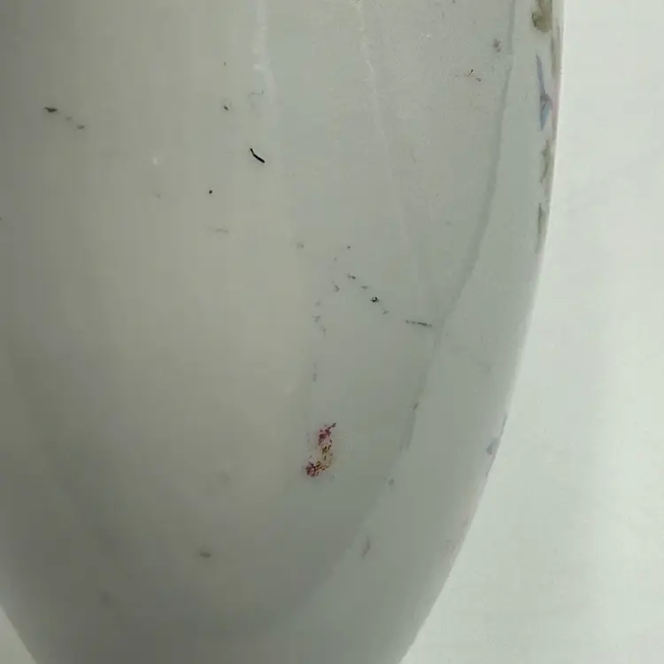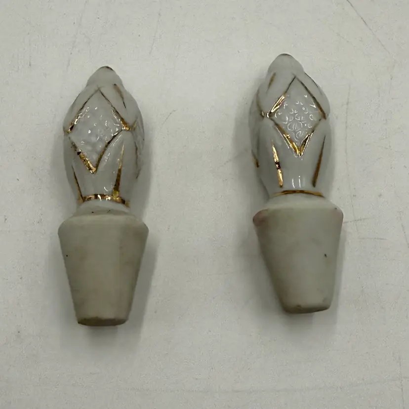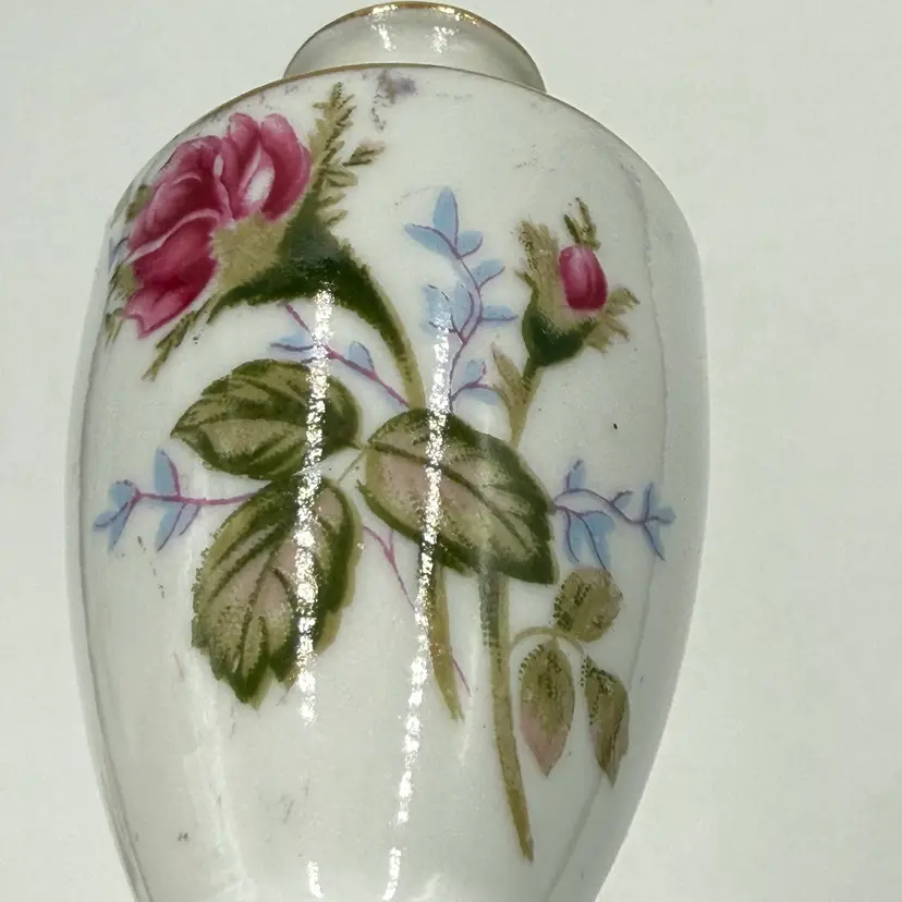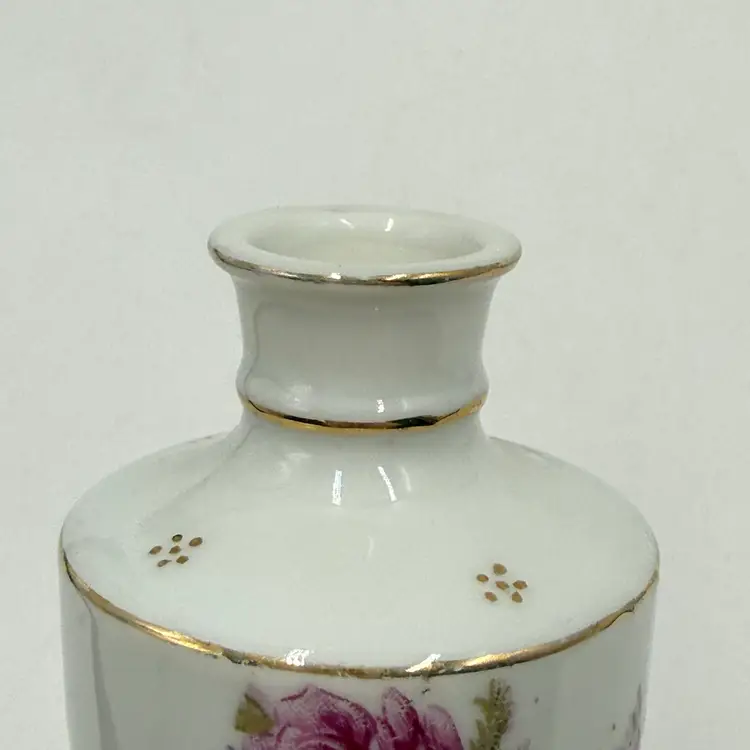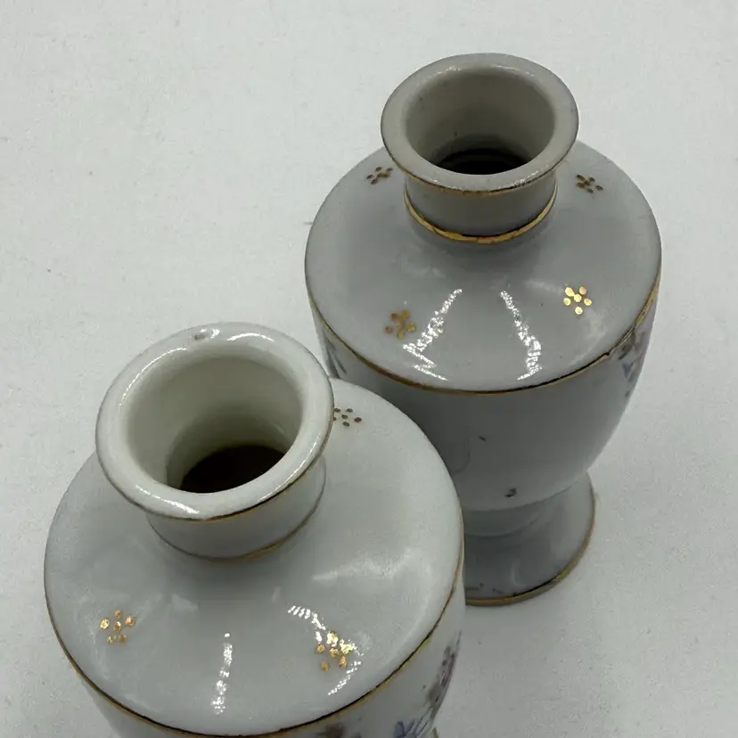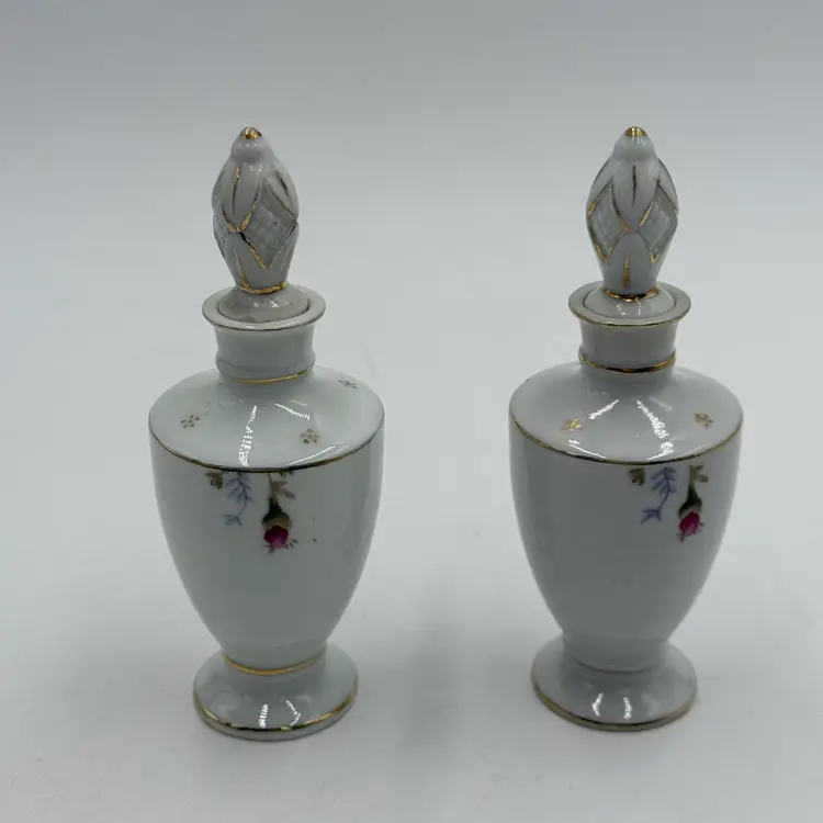 In good condition. Does not have any chips or cracks. There is some marks from when the transfer ware was applied on the side of the bottles. There is slight wear on the gold on the stoppers. Measures 5 inches tall and 1 3/4 inches wide.