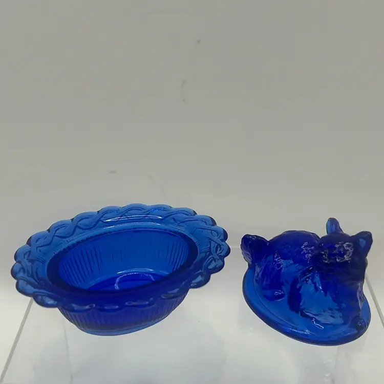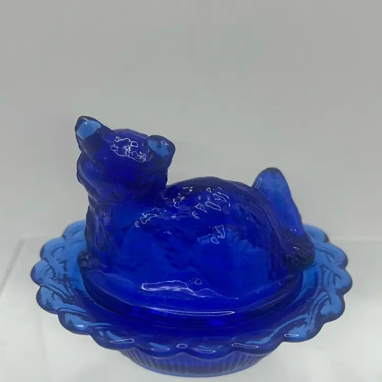 Translucent cat sitting on a woven glass basket, adorable and in mint condition!
