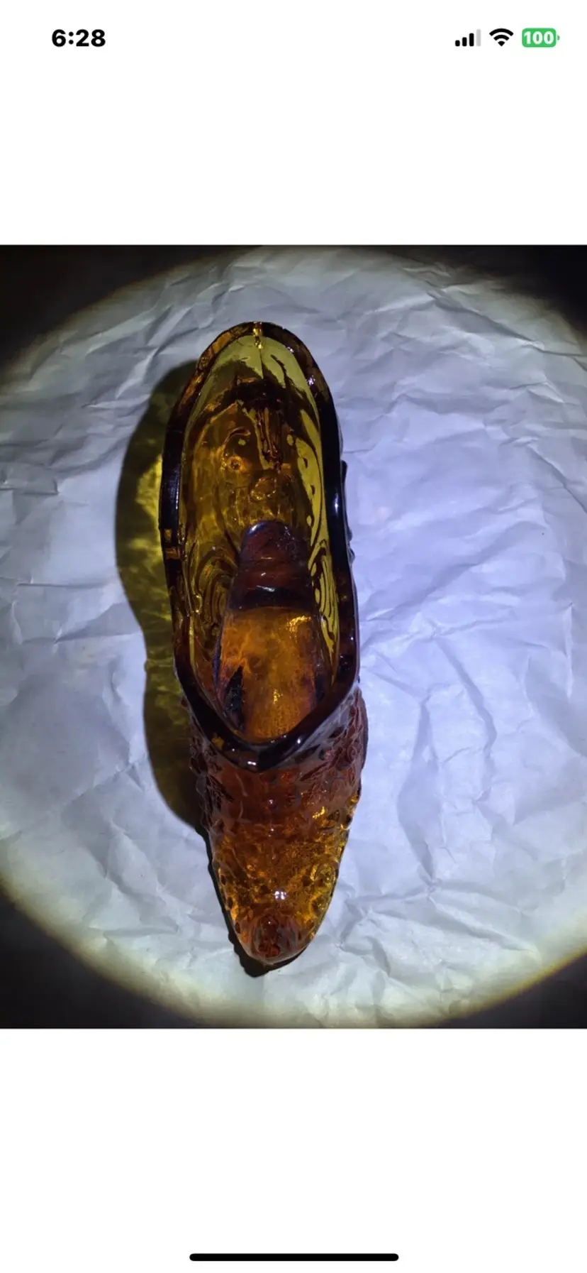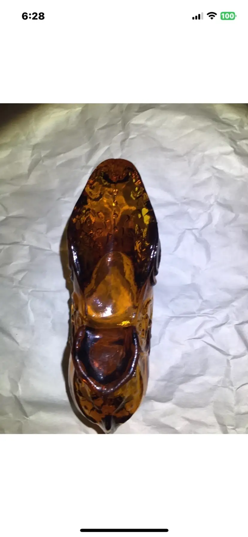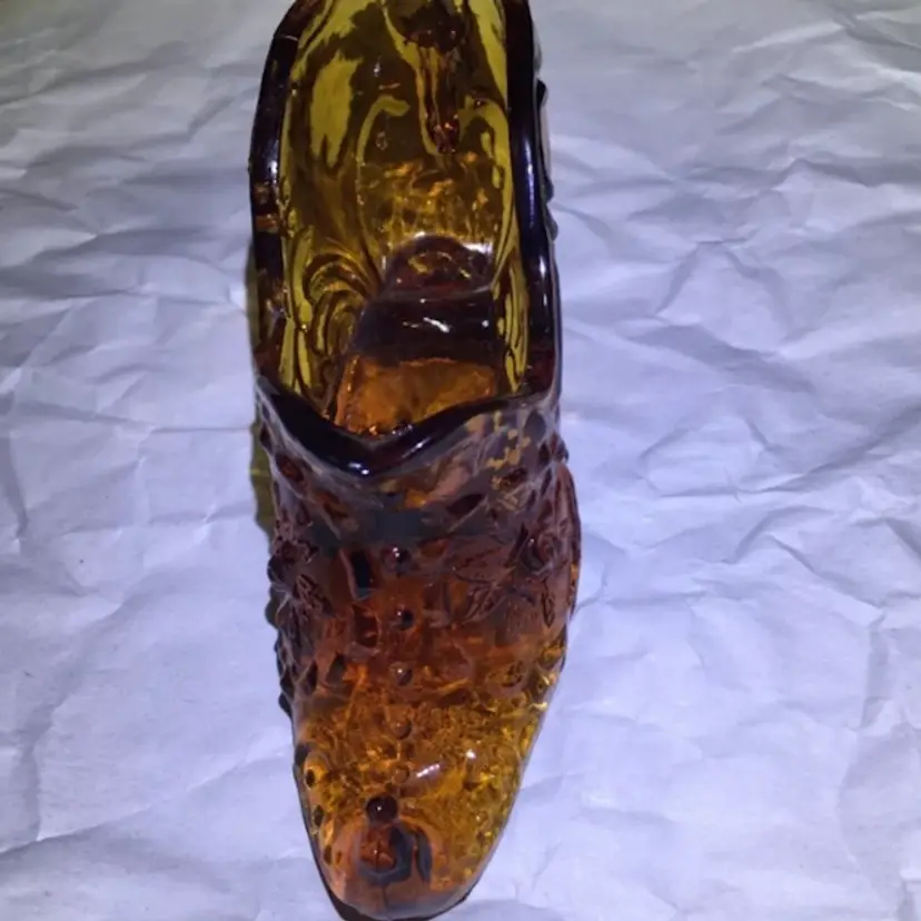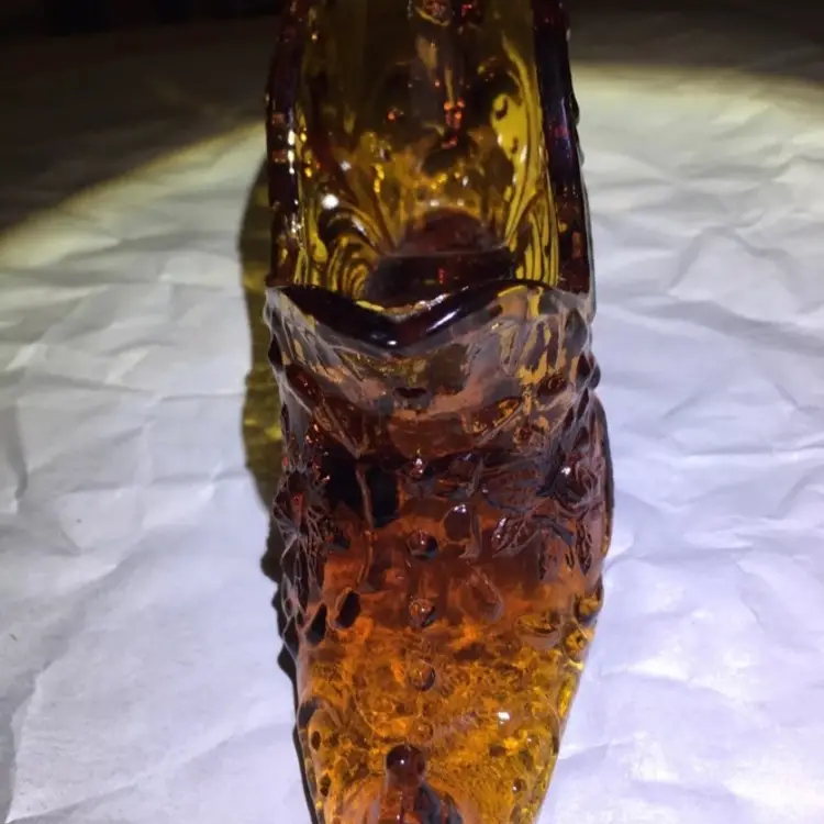 Add a touch of vintage charm to your home décor with this beautiful large dark honey gold amber art glass shoe from Mosser. Featuring a glossy finish and molded glass production technique, this slipper shoe is a licensed reproduction of the Victorian era. The shoe measures 6 inches in length, 3 inches in height, and 2 inches in width, making it the perfect size for any display. The shoe also boasts a stunning floral pattern of Victorian roses and a unique bumble bee toe. It is handmade with care and attention to detail in the United States. This beautiful piece is a must-have for any collector of decorative glassware. Makes great home decor. Great condition. No chips or cracks.