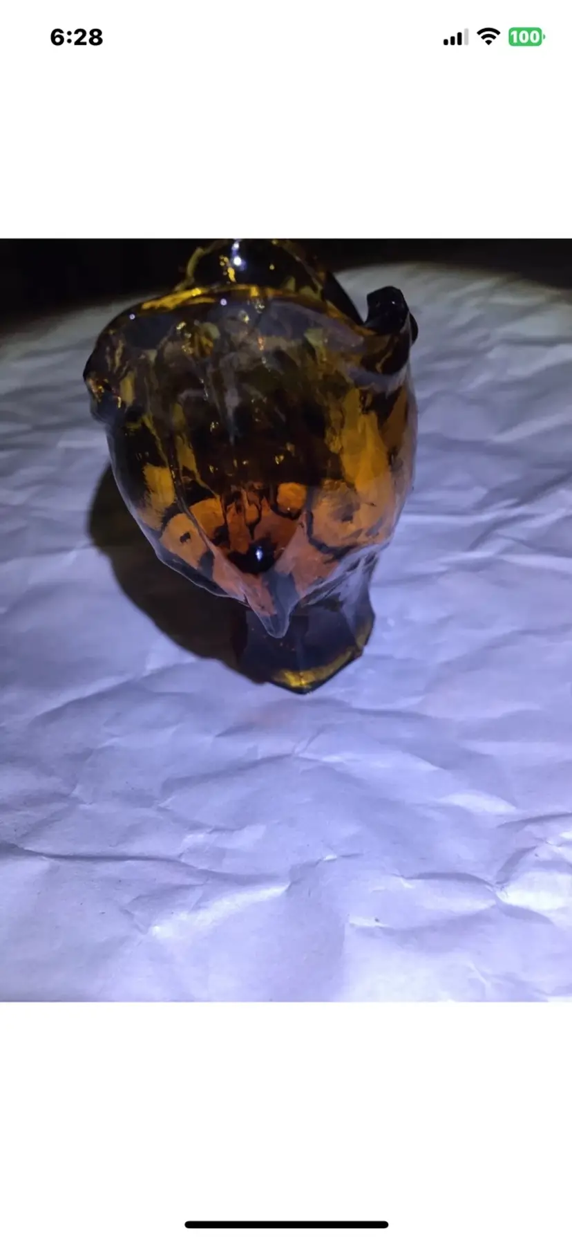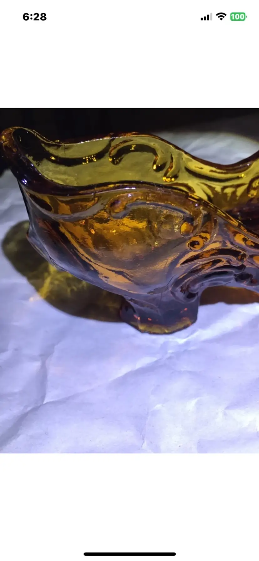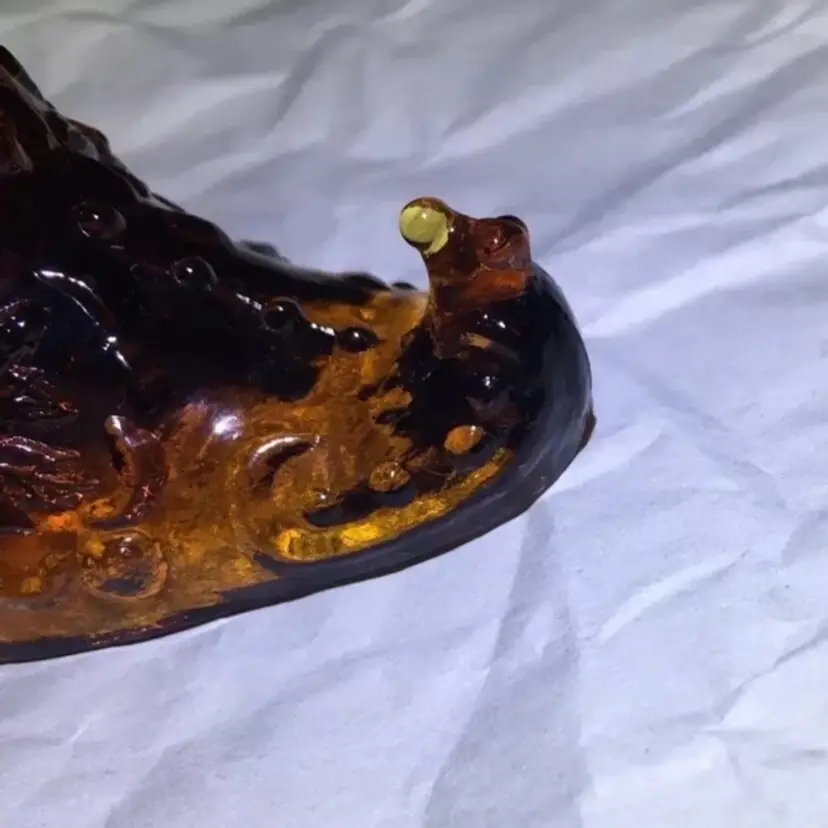 Add a touch of vintage charm to your home décor with this beautiful large dark honey gold amber art glass shoe from Mosser. Featuring a glossy finish and molded glass production technique, this slipper shoe is a licensed reproduction of the Victorian era. The shoe measures 6 inches in length, 3 inches in height, and 2 inches in width, making it the perfect size for any display. The shoe also boasts a stunning floral pattern of Victorian roses and a unique bumble bee toe. It is handmade with care and attention to detail in the United States. This beautiful piece is a must-have for any collector of decorative glassware. Makes great home decor. Great condition. No chips or cracks.