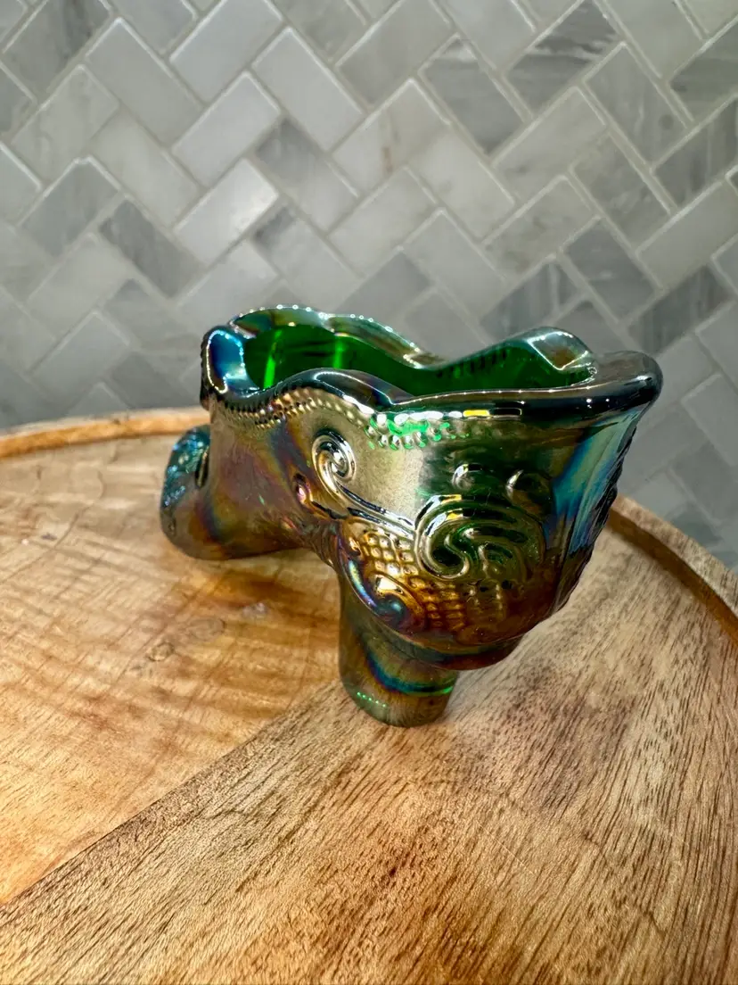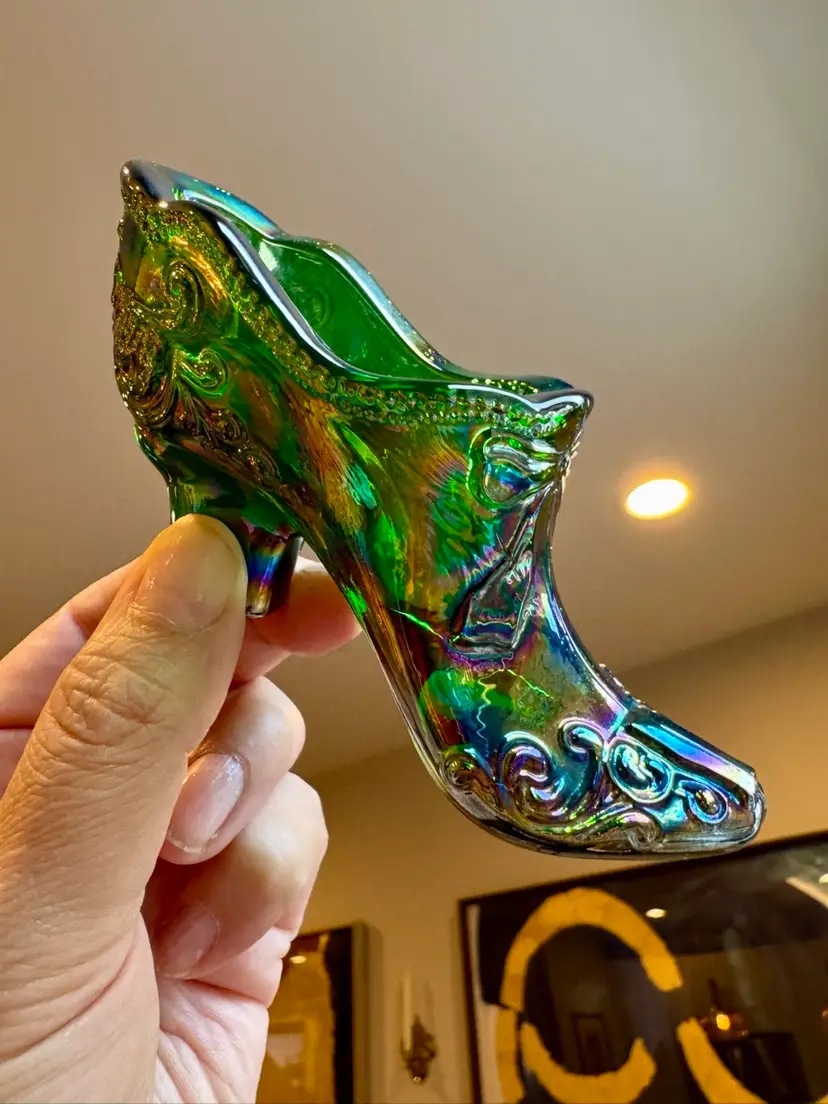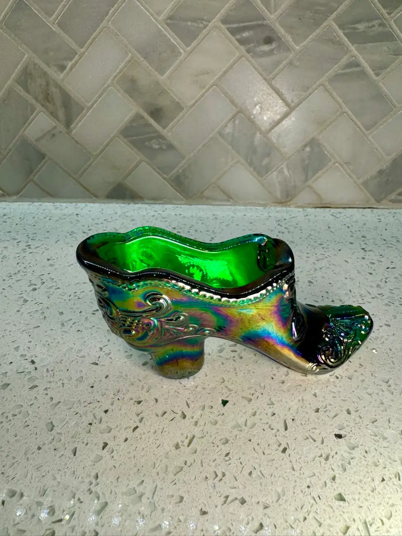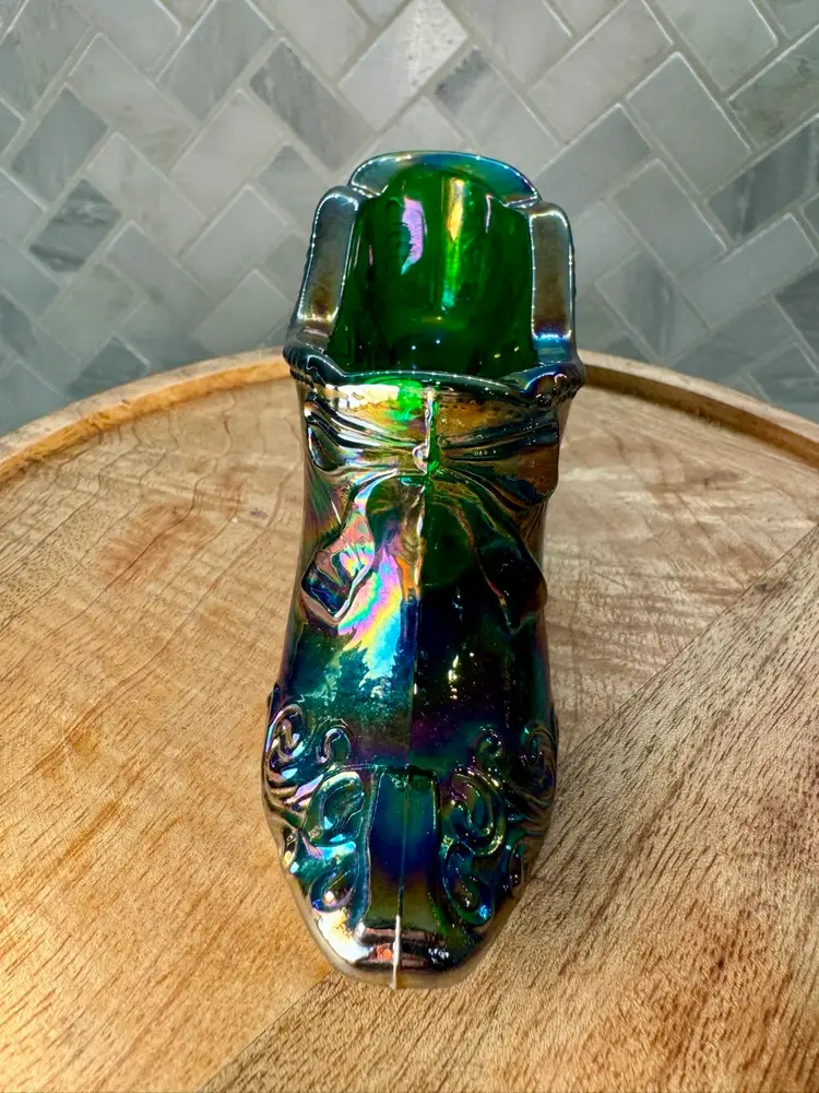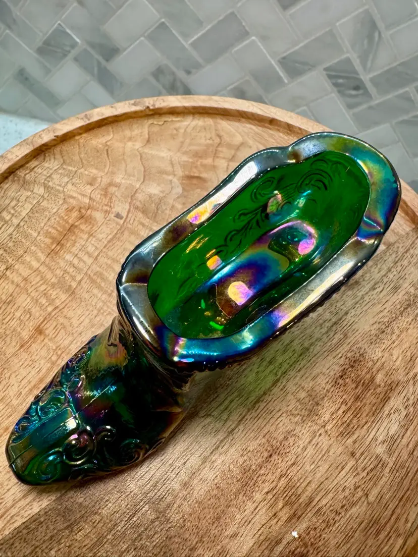 Mosser Hunter Green Bow Slipper Carnival Glass Shoe 4.5” w & 2.5” t