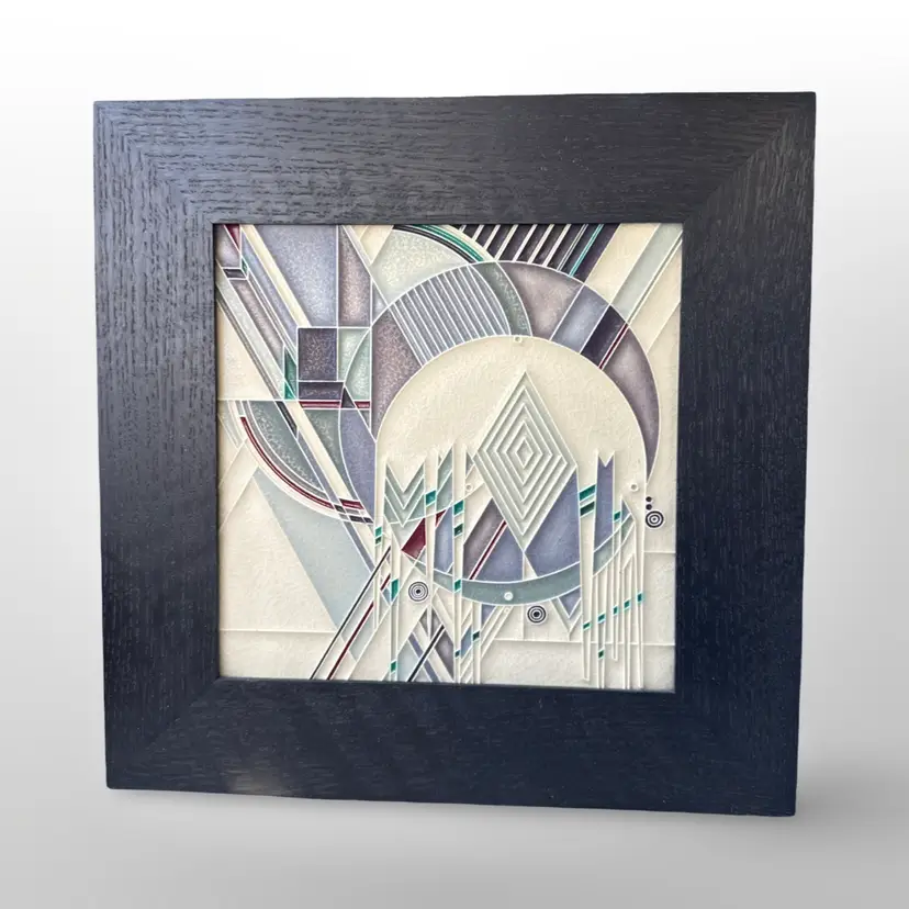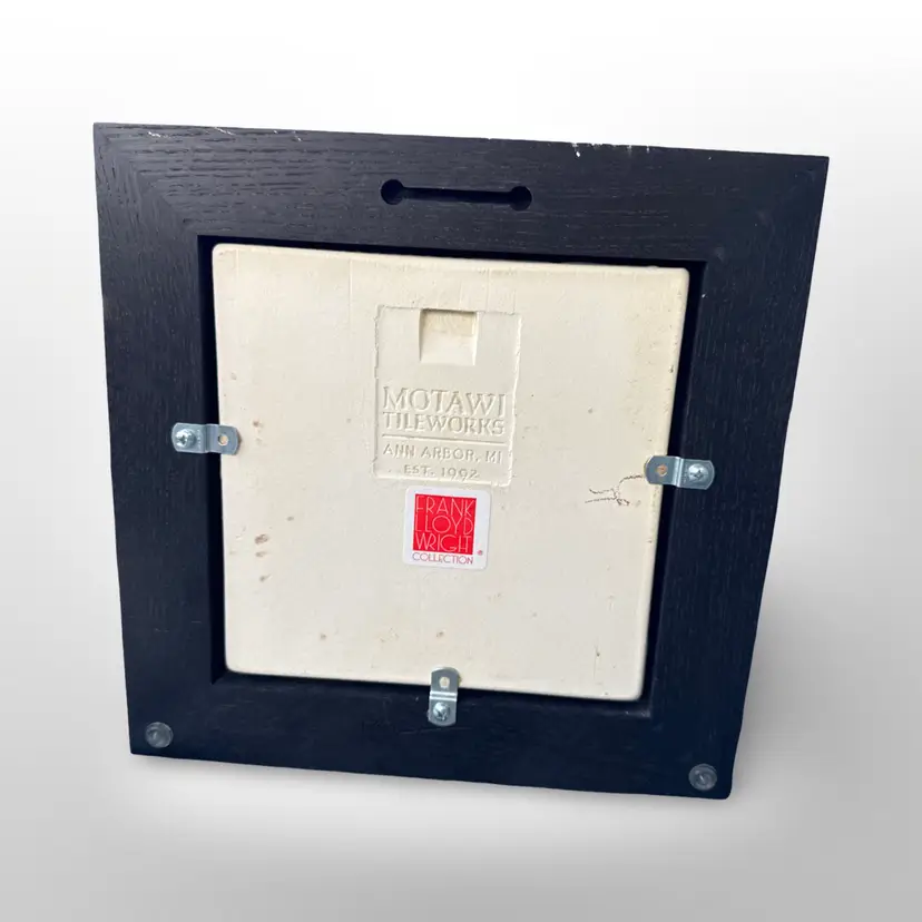 Amazing Frank Lloyd Wright Frozen Spheres tile by Motawi Tileworks, framed in an ebony stained oak frame. Great pre-owned condition with just a little bit of wear on the back edge of frame as seen in photos.