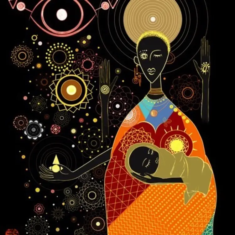 Embrace the divine essence of motherhood with this Celestial Motherhood art print. Featuring intricate cosmic patterns and a rich color palette, this piece radiates warmth and spiritual energy. Perfect for those who appreciate the beauty of maternal love and celestial elements.