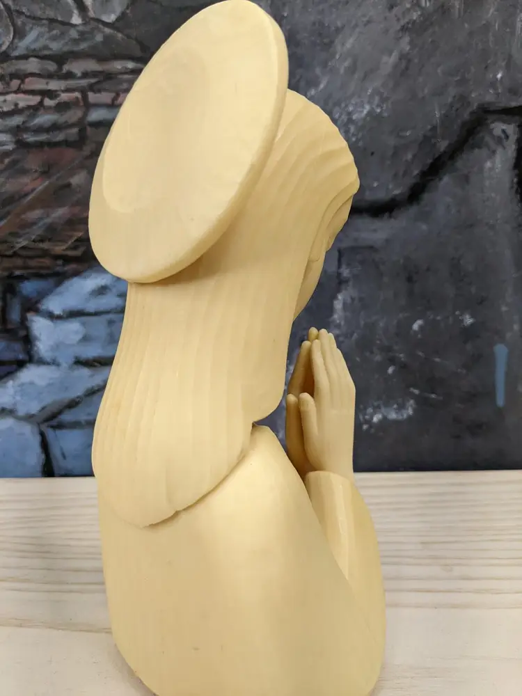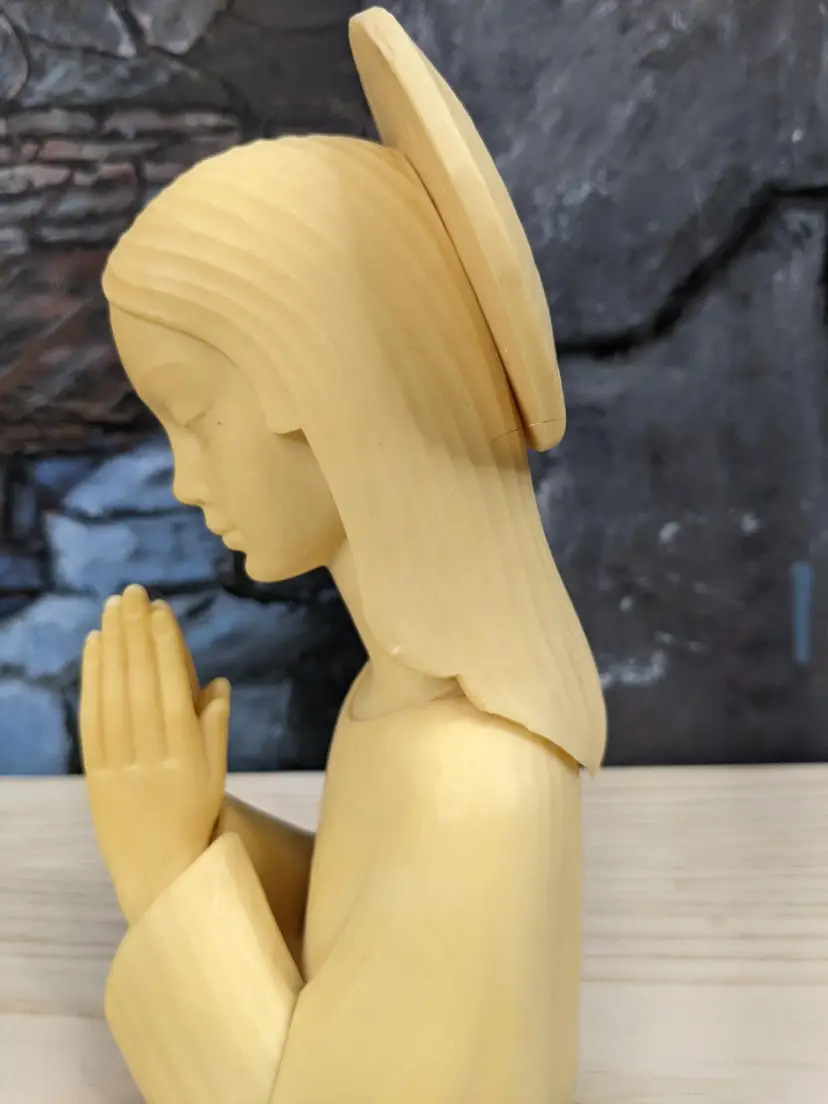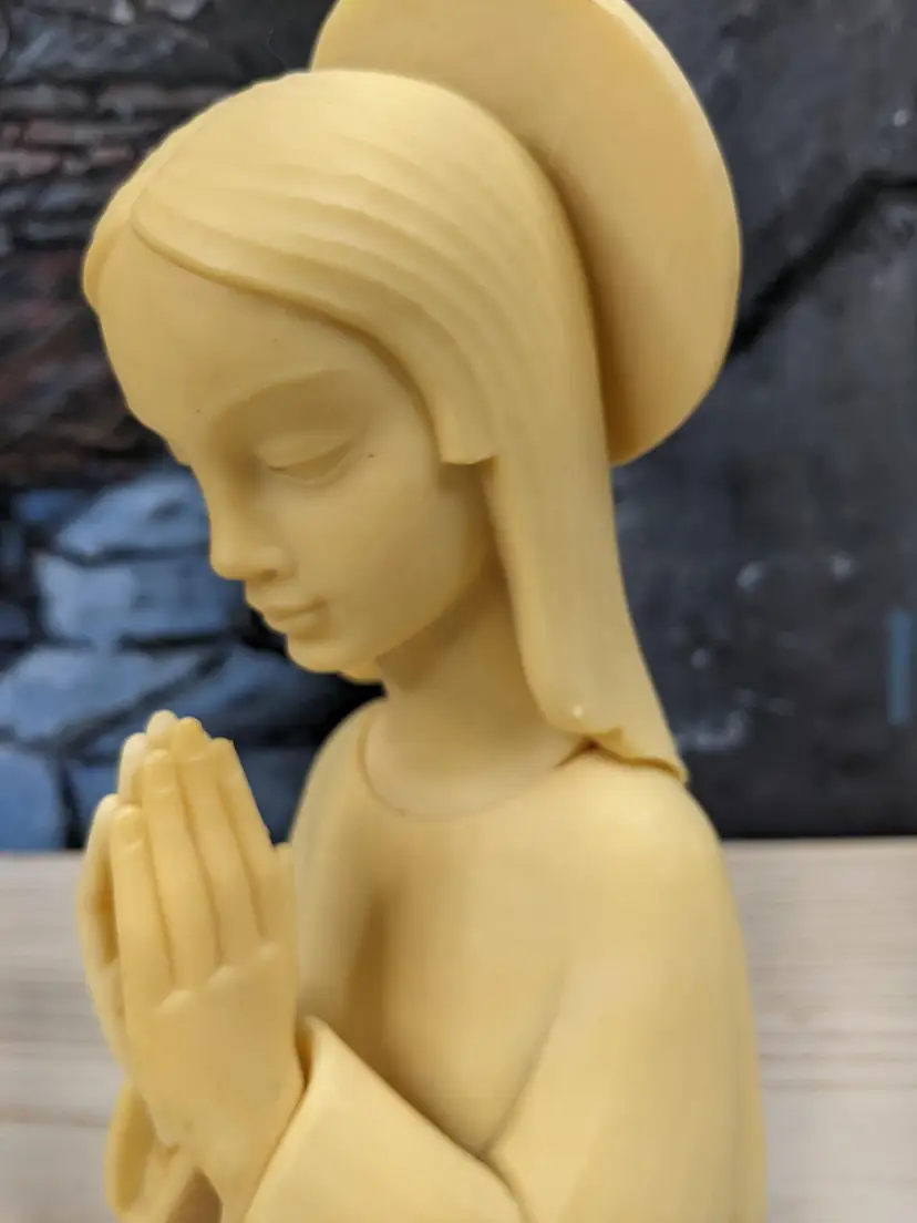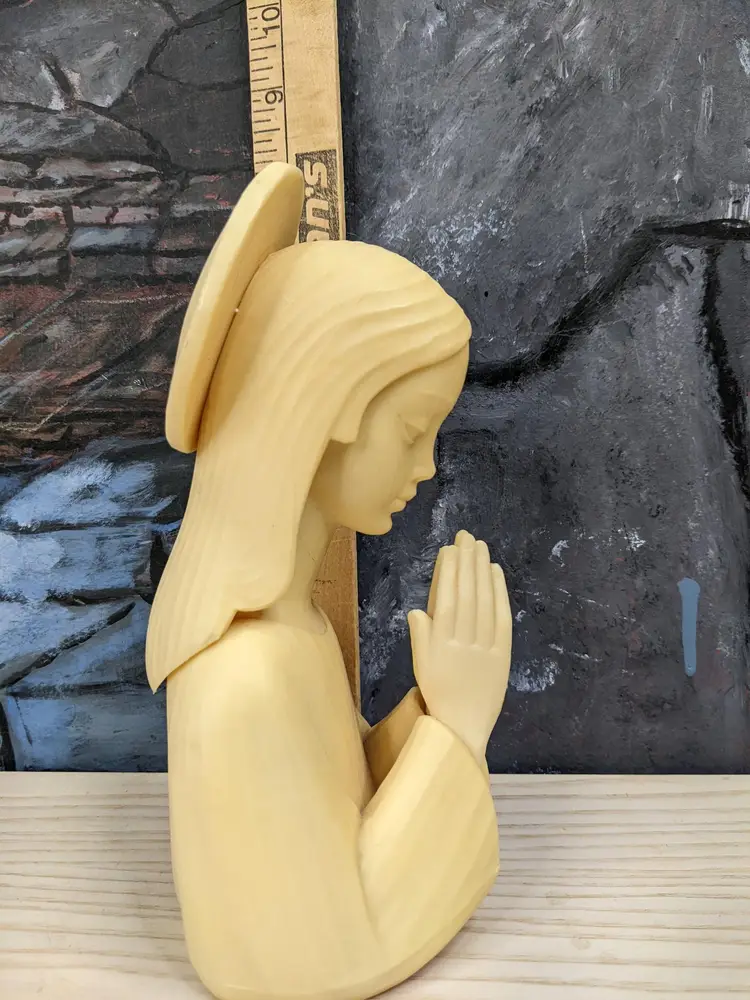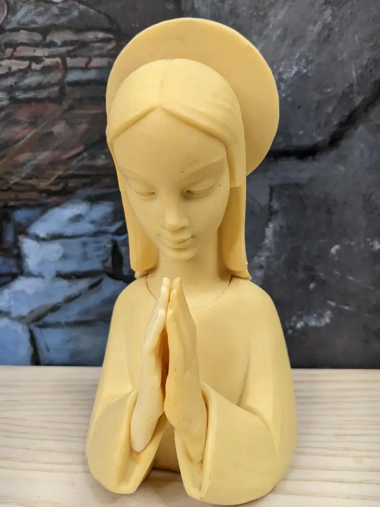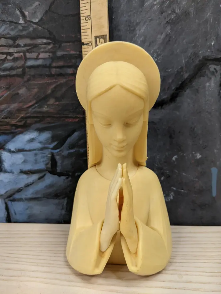other Of God Praying Carved Celluloid Statue Madonna Virgin Mary She is 7 1/2” tall and 4 in wide . Would make a nice Easter Gift .Vintage Very nice detail A Creamy beige color early plastic. Very good condition no chips or cracks The bottom felt is missing . Please check the photos for details. No weird smells.