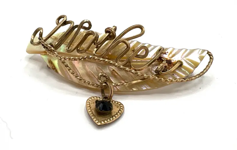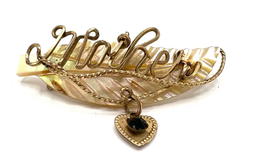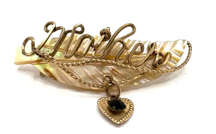 This vintage Victorian style brooch is made up of gold tone wire spelling out the wor MOTHER and backed with mother of pearl. Unsigned but extremely well made, this brooch was purchased at an estate sale of an elderly woman. Such a perfect and thoughtful gift for your Mom. Size: brooch - 2 long by 3/4 inches wide Condition: very good vintage - The clasp indicates the age and it is a bit bent but still works