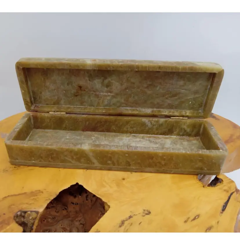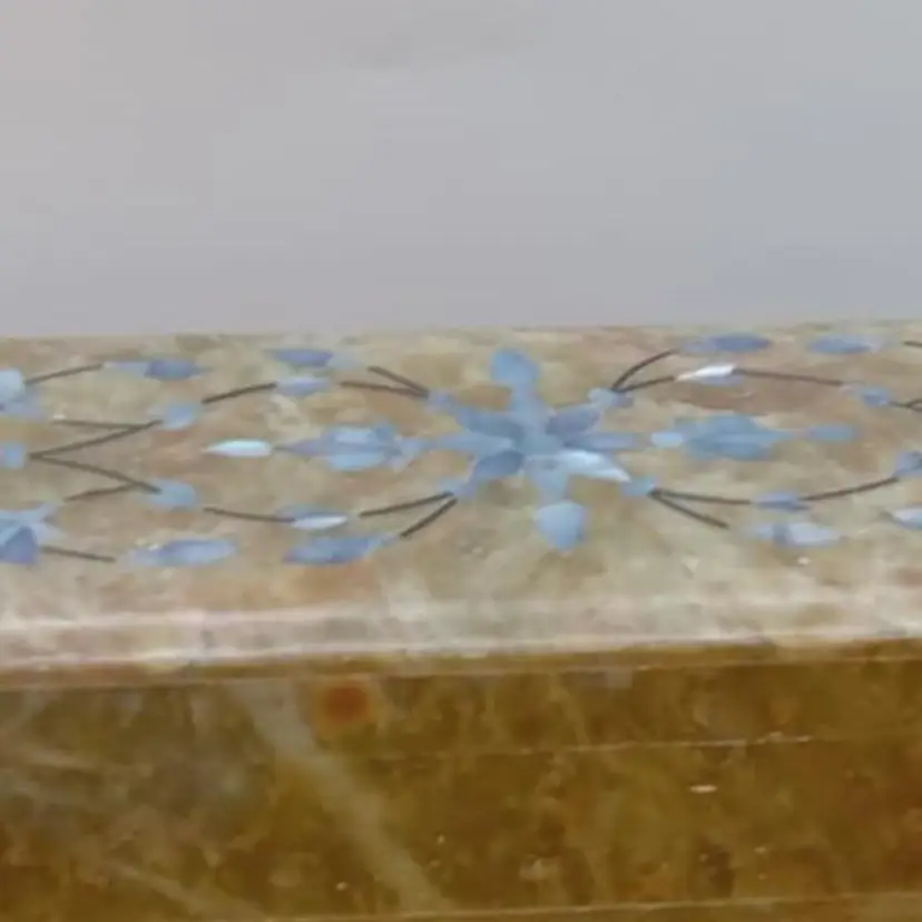 Here's a pretty soapstone box with inlaid mother of pearl. The inlay is flowers. The box is 8x 2.5x 1.5 inches and in great condition.