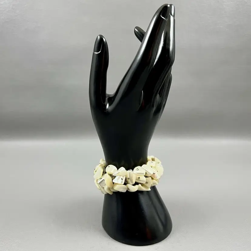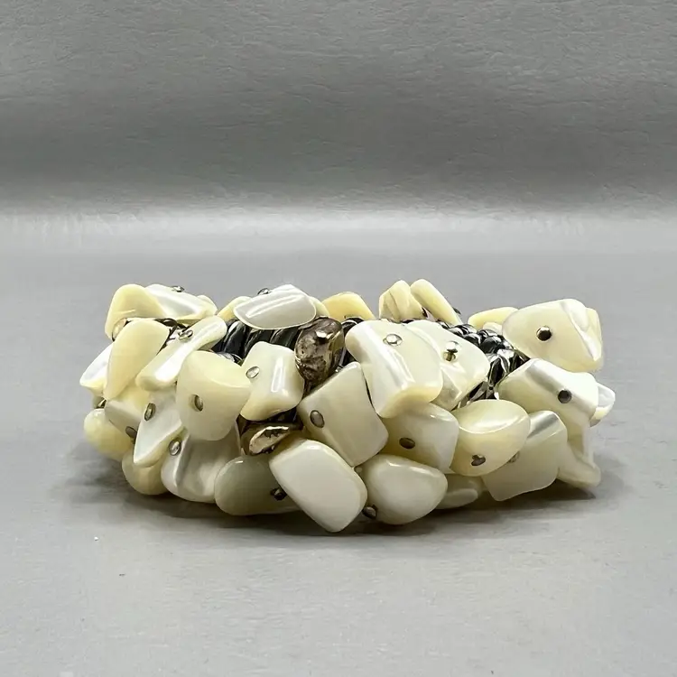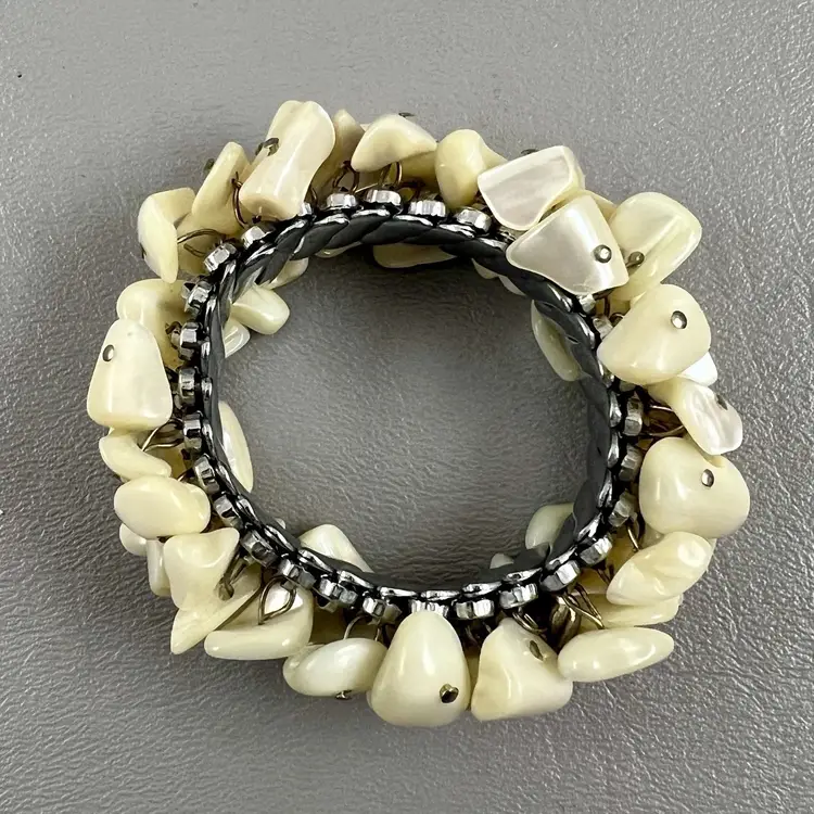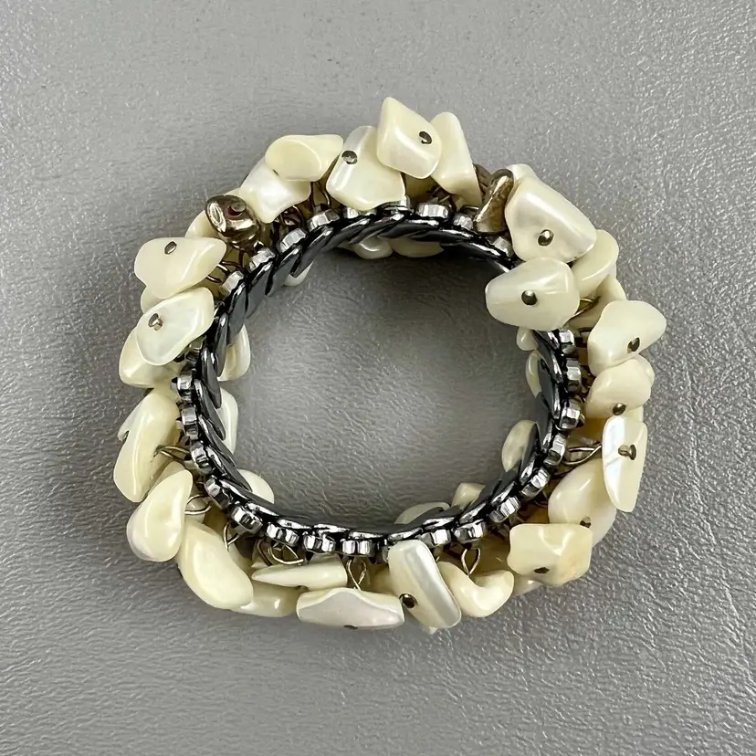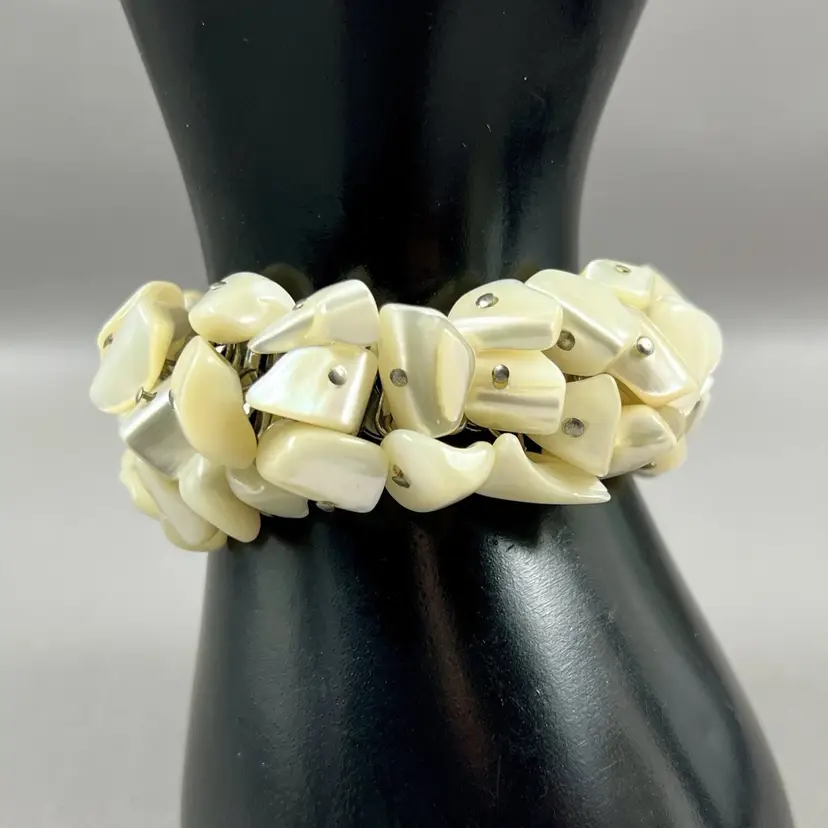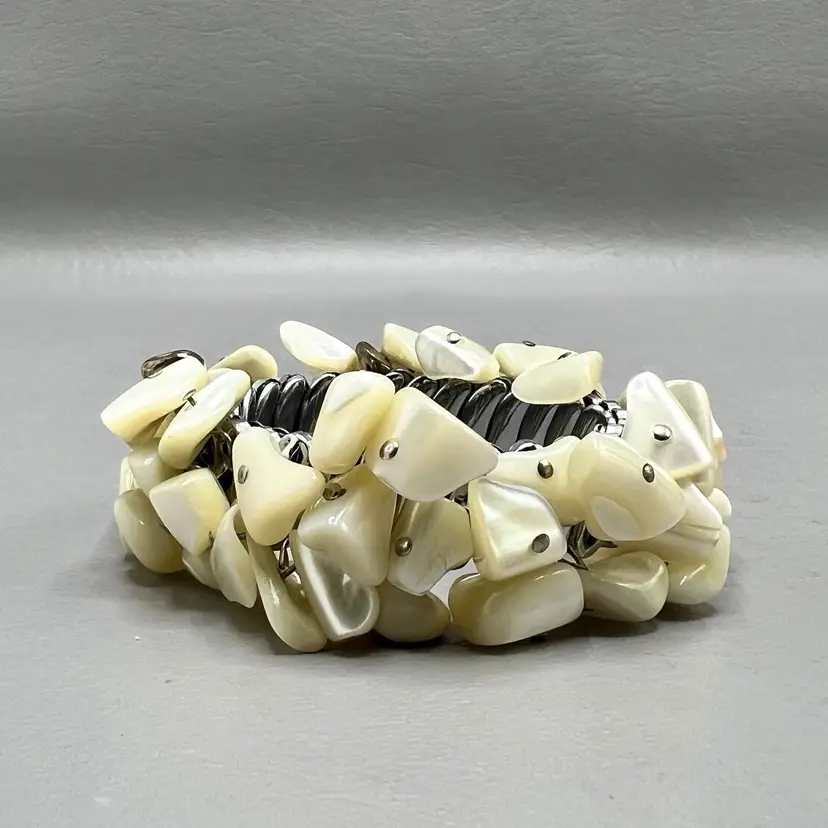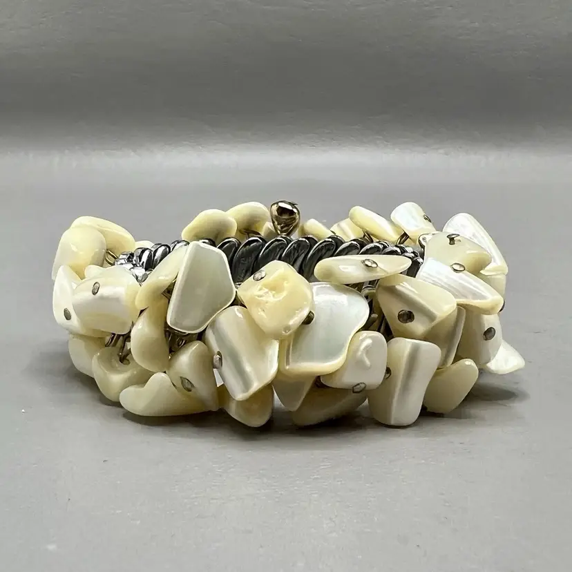 Mother Of Pearl MOP Beads Chunky Stretch Bracelet Mid Century Japan Silver Tone