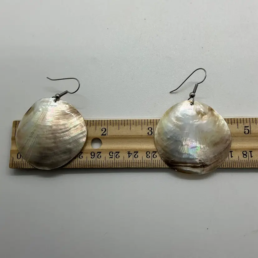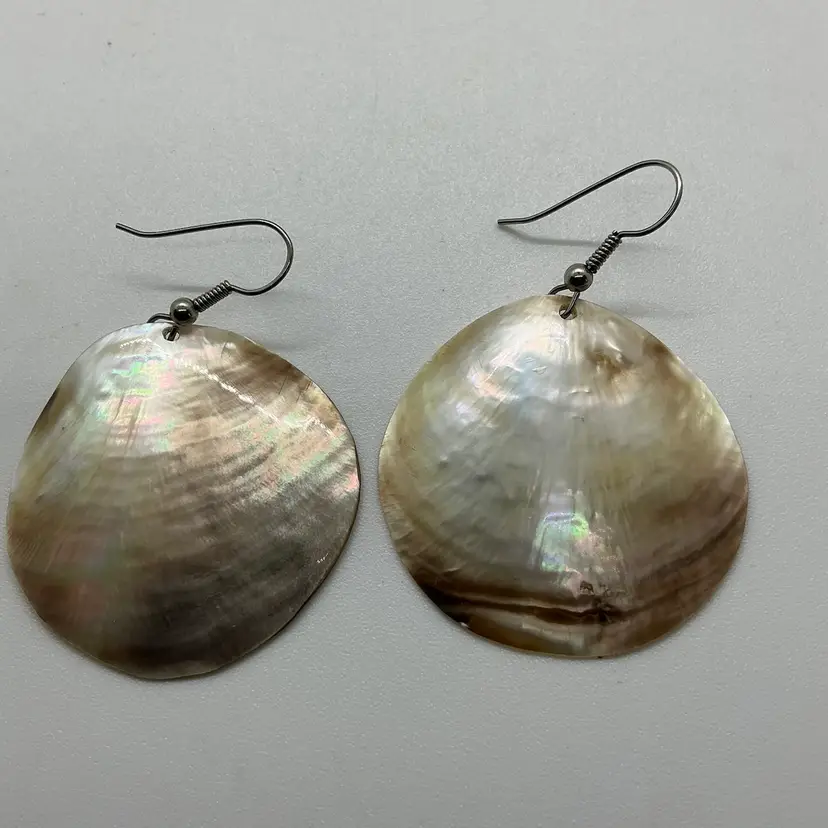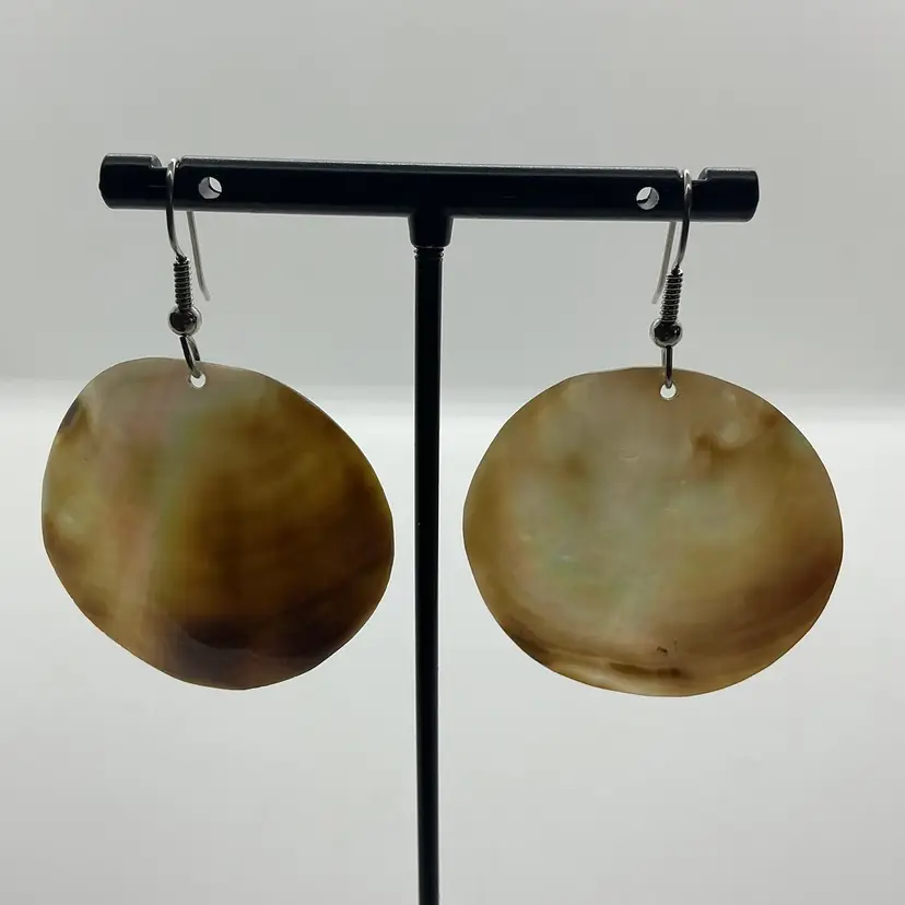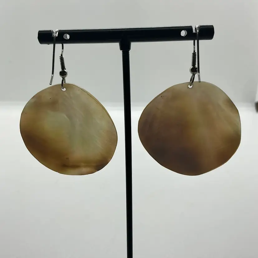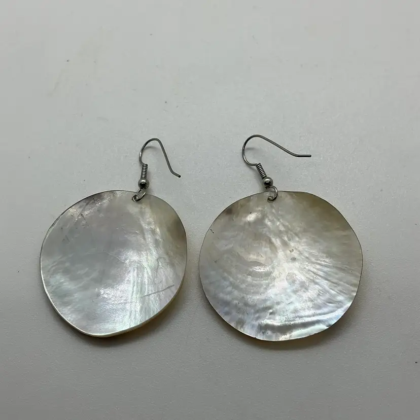 Mother of Pearl round seashell earrings feature a dangle/drop style. The iridescent finish on the shell adds a touch of elegance to the overall design. Wire pierced earrings. Natural shell. Comes from a non smoking home.