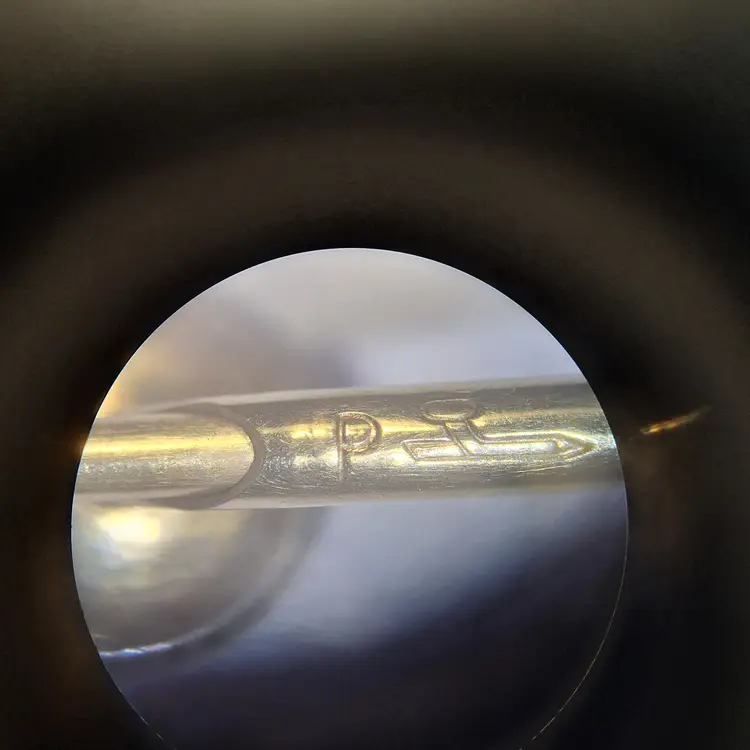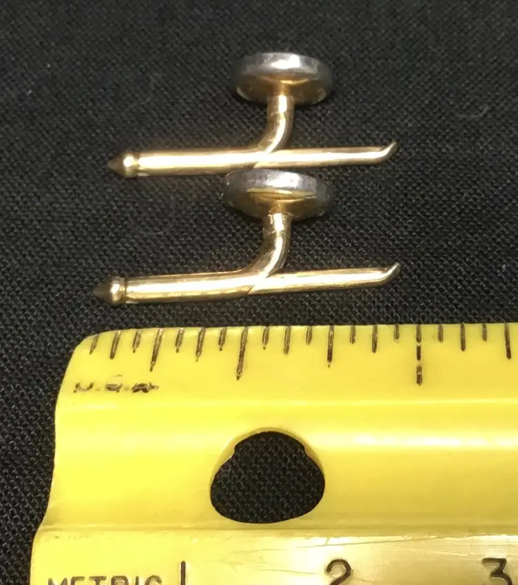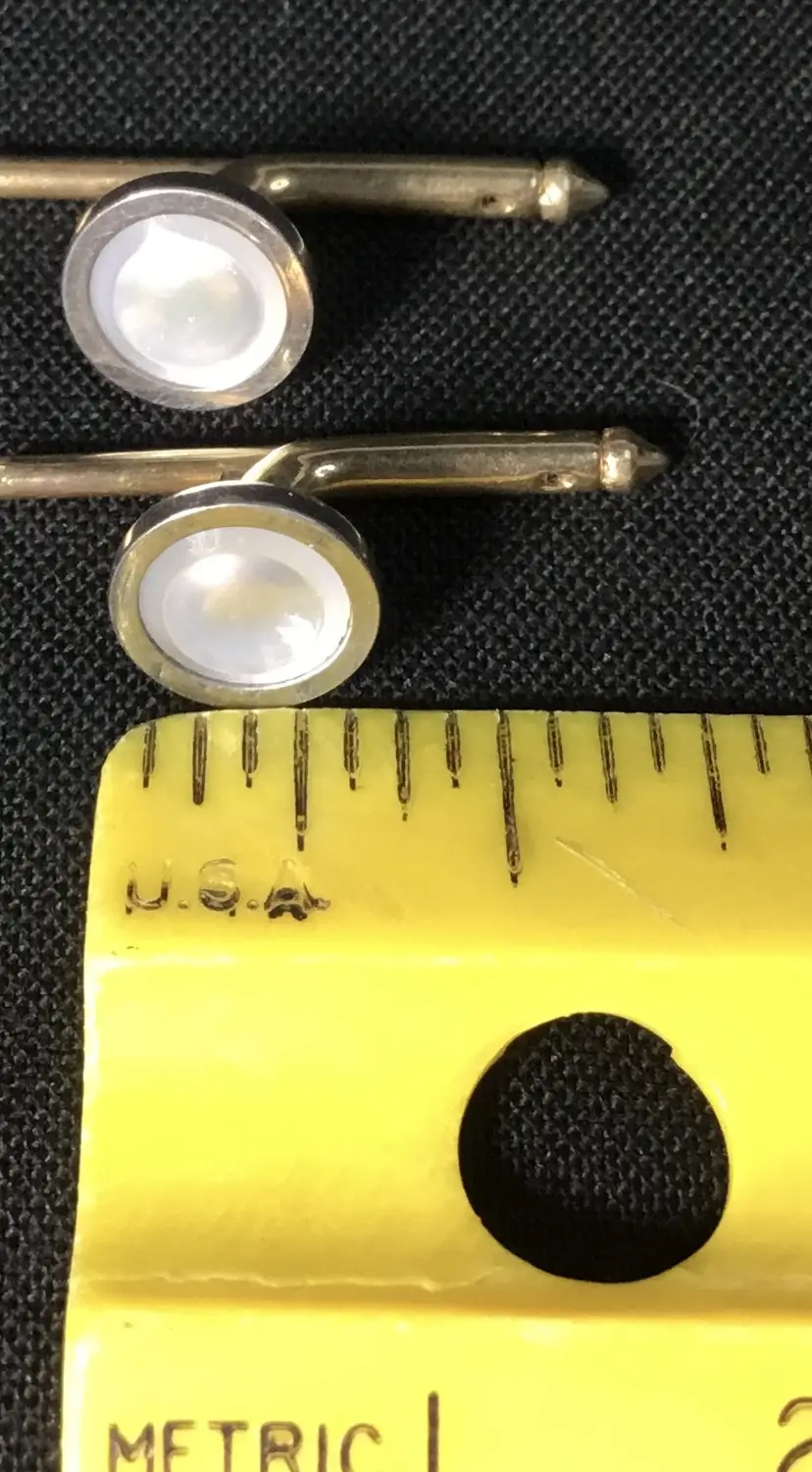 Round 3/8 inch mother of pearl shirt studs with gold tone metal backs and pins. 1 inch long spring back pins, vintage. Pin backs are marked with a capital P (possibly gold plated?) and an engraved drawing of the shirt stud itself. Set of 2. See photos. Very good condition, no damage, some wear on metal parts.