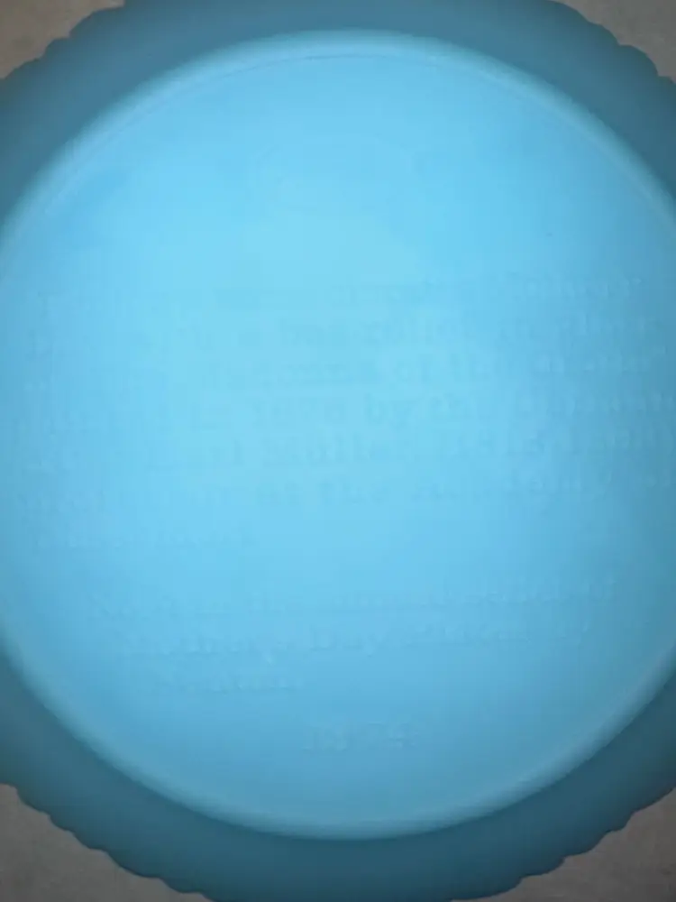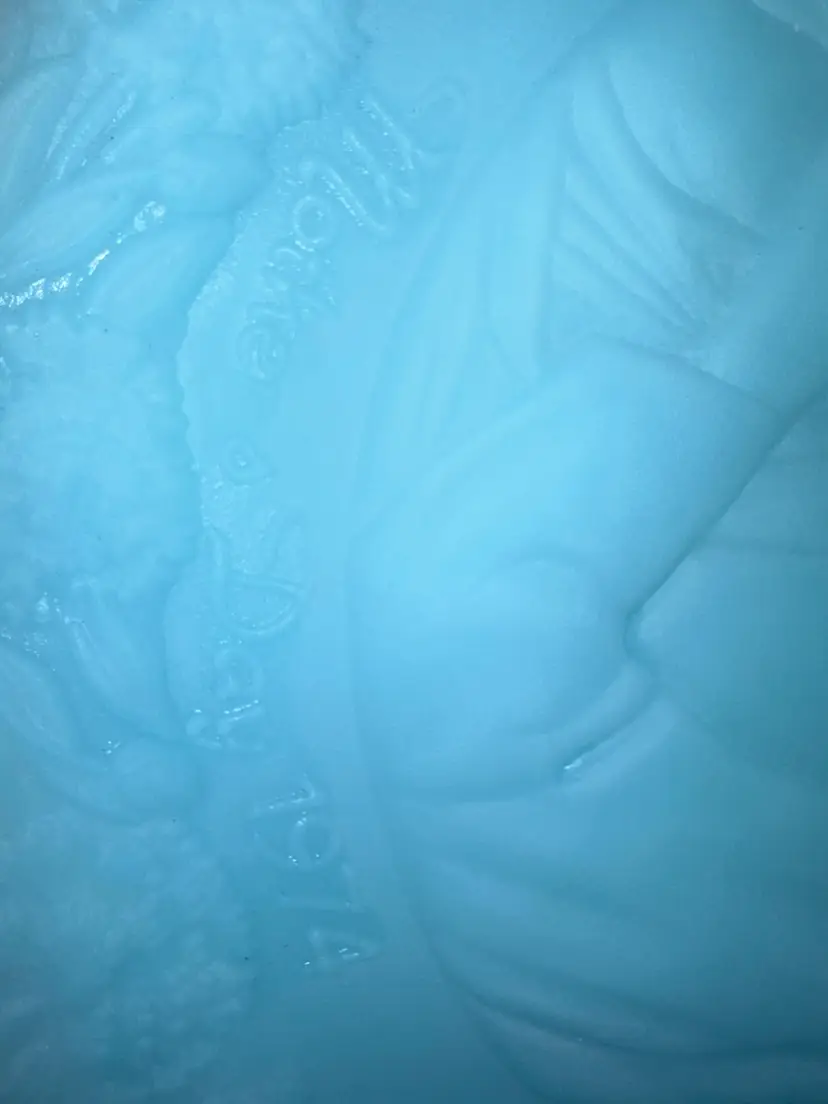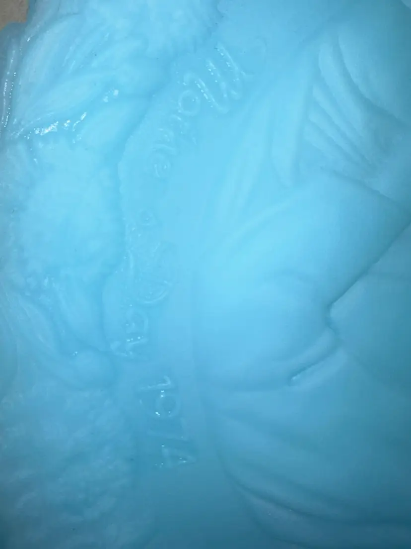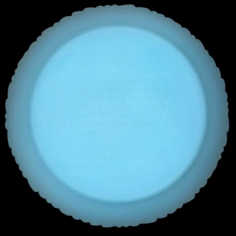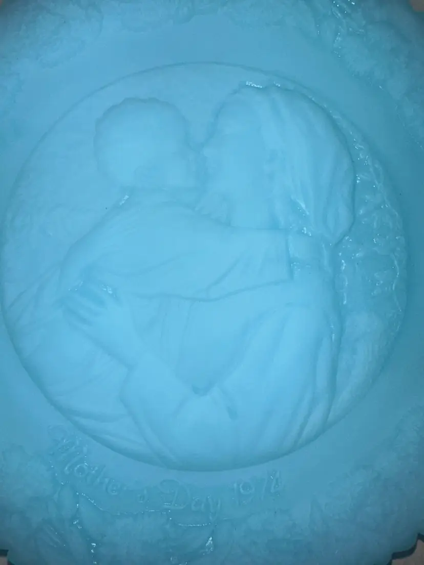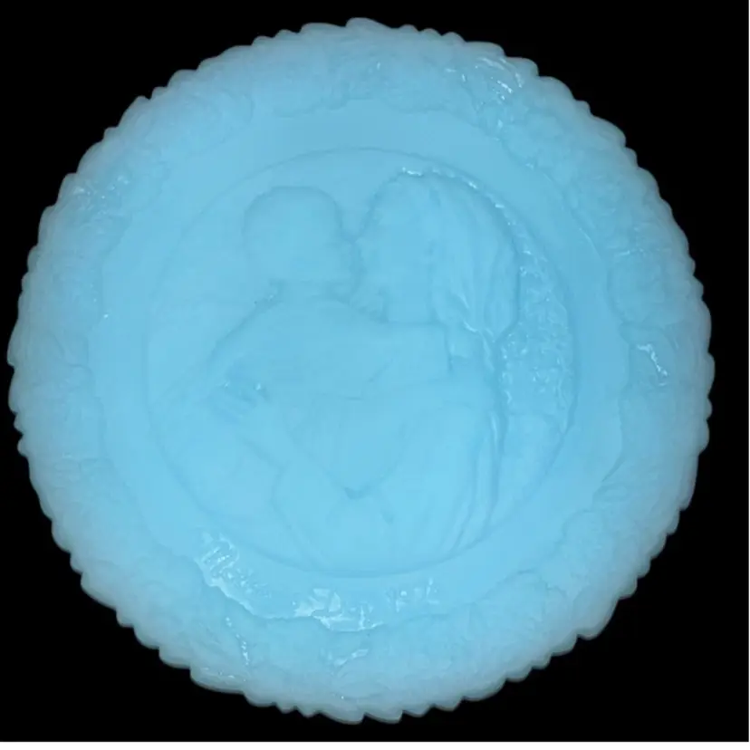 Mothers Day 1974 Fenton Blue Satin Glass 7.75” Decorative Plate Fenton commemorative Mother’s Day with a bas -relief in glass of “The Madonna of the Grotto” painted and 1876 by the German artist, Carl Muller (1818 to 1898), professor at the Academy of Dusseldorf. Number four in the annual series of Mother’s Day plates by Fenton – 1974 No issues