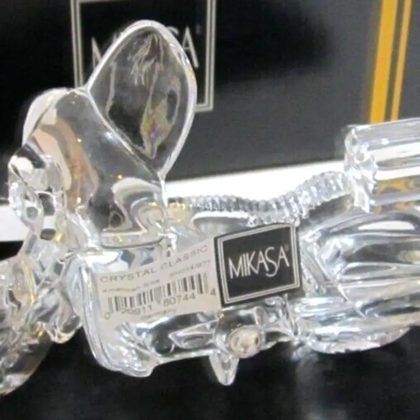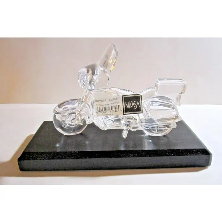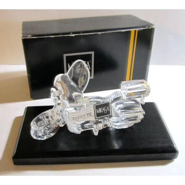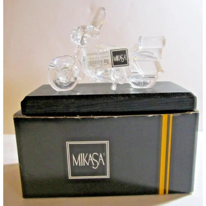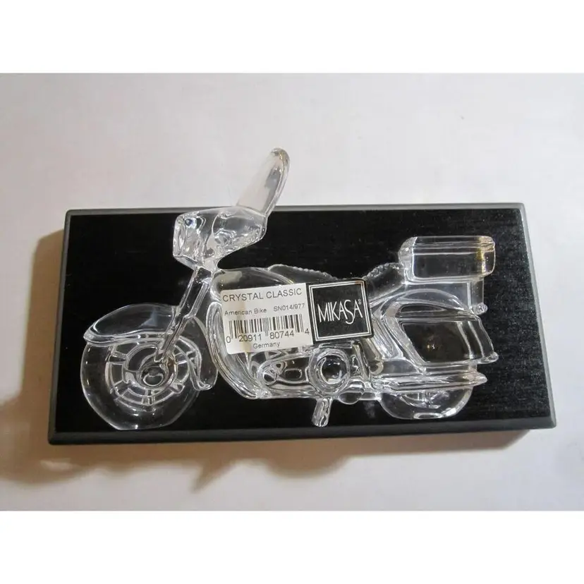 This is a NEW IN BOX, w/Orig Intact Label, Mikasa Lead Crystal Motorcycle, 'Crystal Classic' 'American Biker', with a Black Wooden Display Base. It is hard to find, especially NEW! It was made in #Germany. The bike measures: 5.5" long 3.75" high and the display base is 7.5" long. Perfect gift for the Motorcycle lover, #Harley guy or gal, or any biker who loves to ride.