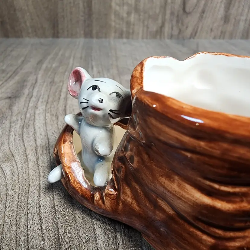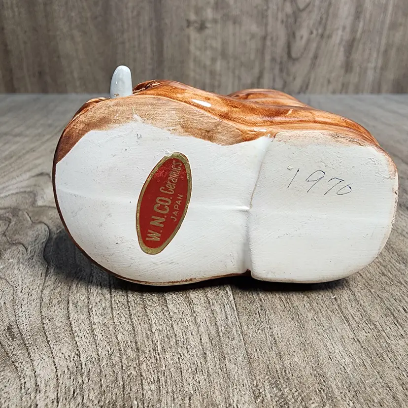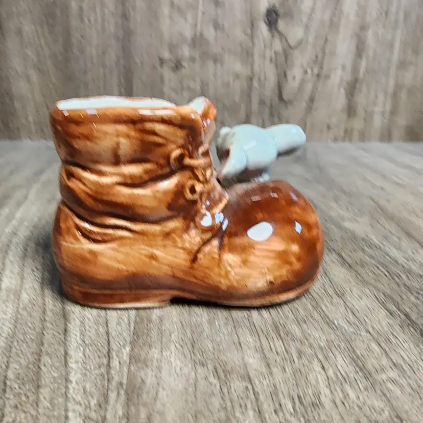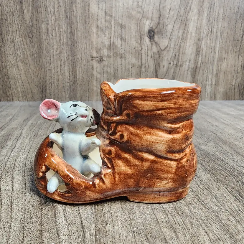 Small (under 4" long) planter boot with Mouse peeking out the toe. Sticker shows "W.N. CO. Ceramics" JAPAN. with 1970 written on the bottom. Looks like this may be a hobbiest painted piece. Super cute with no chips or cracks.