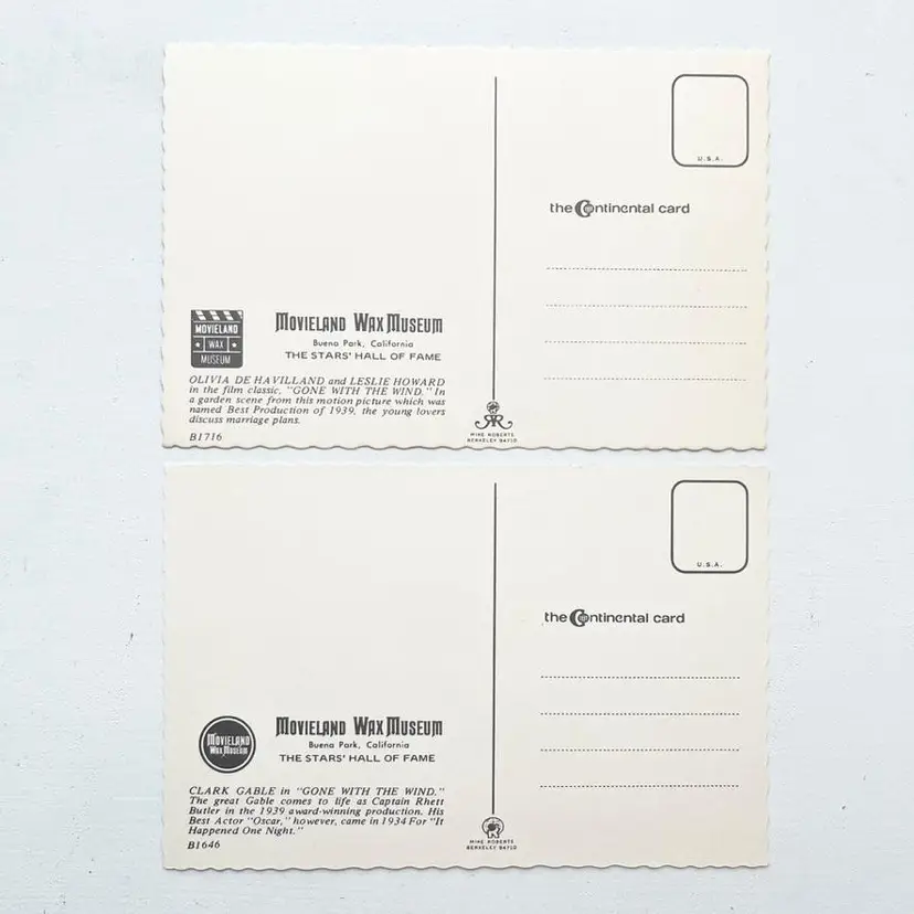 Movieland Wax Museum Souvenir Postcards Gone With The Wind 2 Unused Postcards Clark Gable (Rhett Butler) Olivia De Havilland (Scarlett O'Hara) Leslie Howard (Ashley Wilkes) Condition: Unused. Unposted. Good condition. Measures 6 inches x 4 inches Packaged in a plastic sleeve inside a rigid envelope Visit my store to see more vintage ephemera, advertising, novelties, gifts, estate sale and yard sale finds https://district.net/u/finderspickerspaper SKU B25