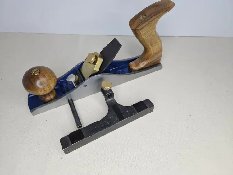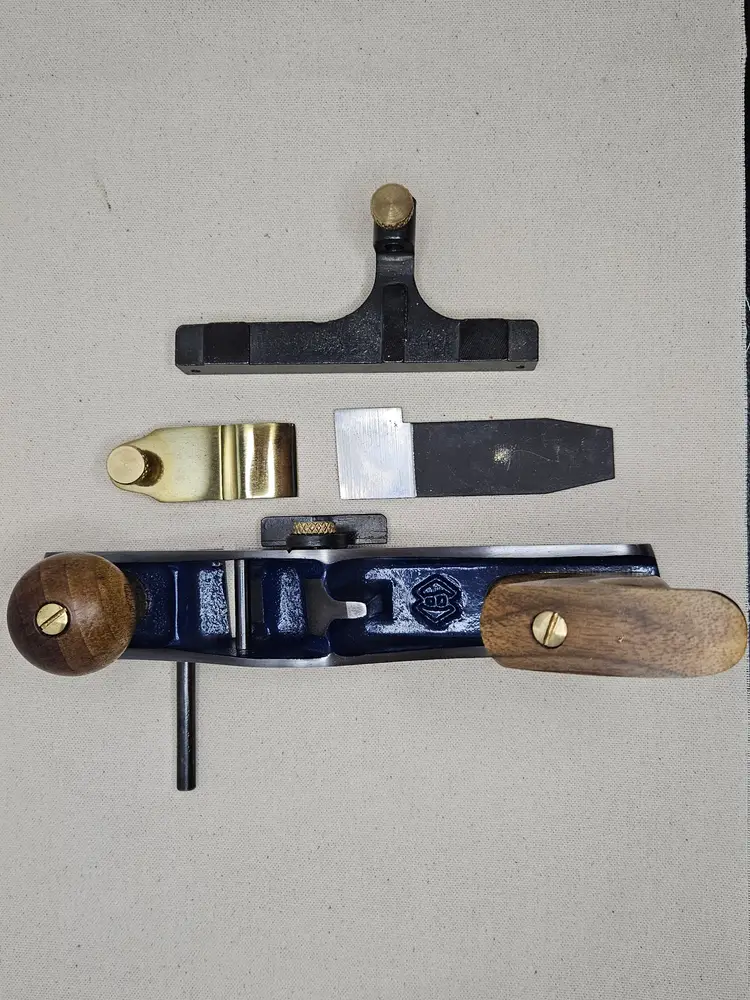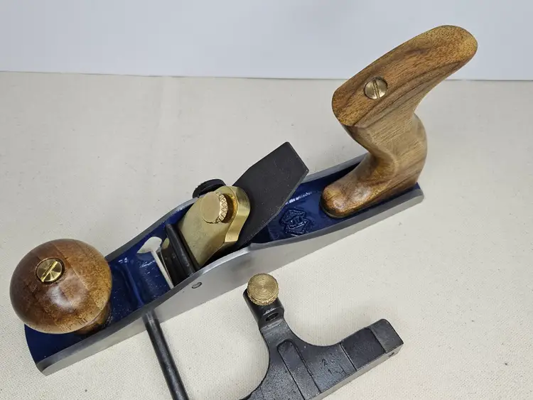 Reconditioned moving fillister plane, complete with adjustable depth stop and fence. I don't recognize the makers mark on this plane, but it has been nicely refurbished to excellent+ condition. Notice the brass accent pieces under the tote & knob and other brass features - nice!