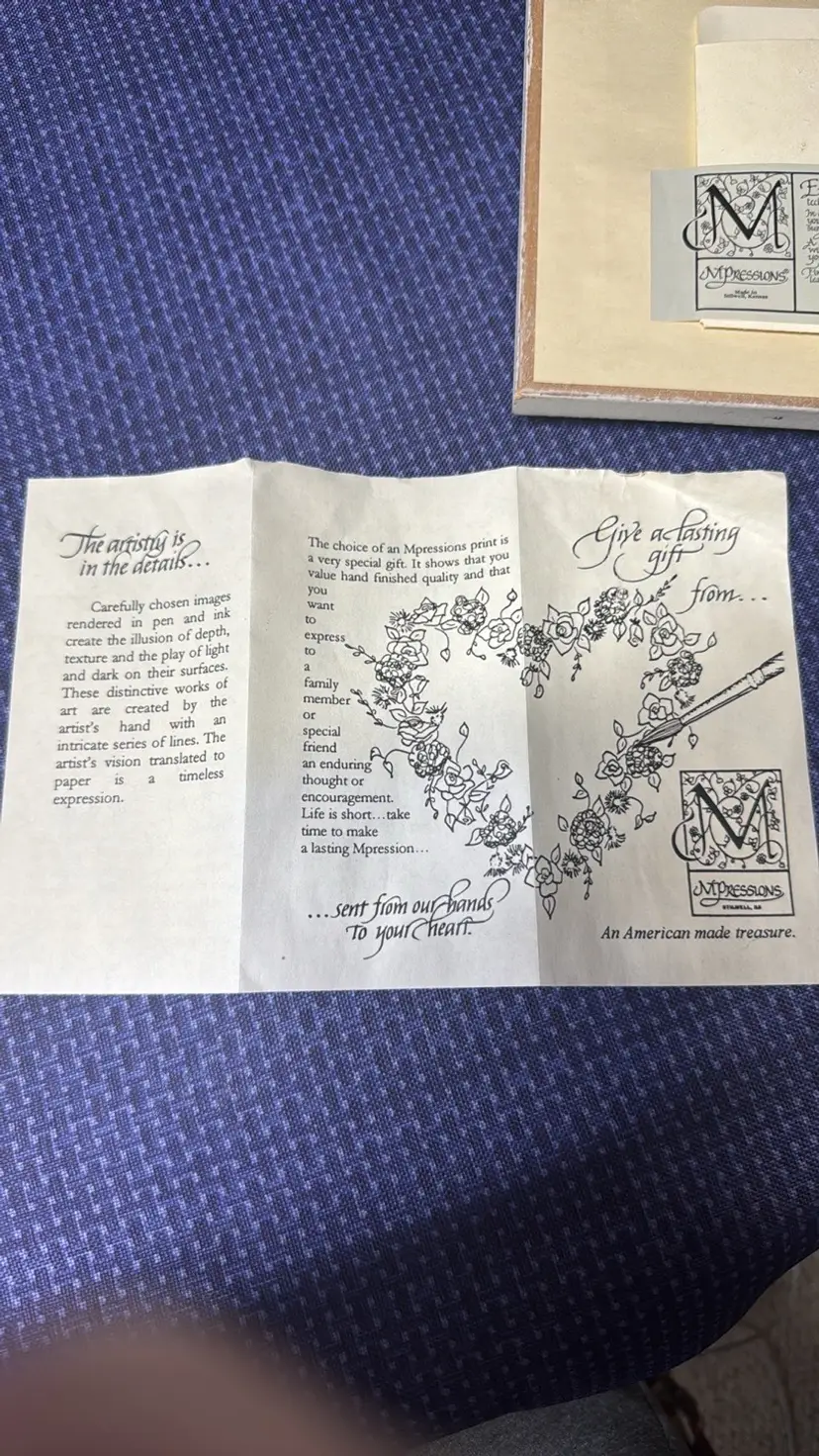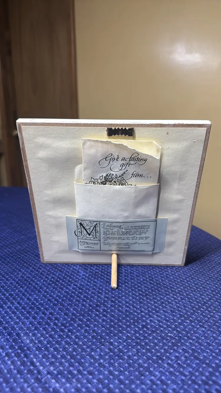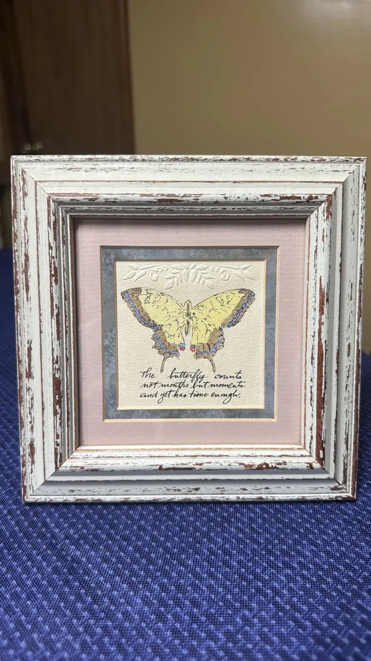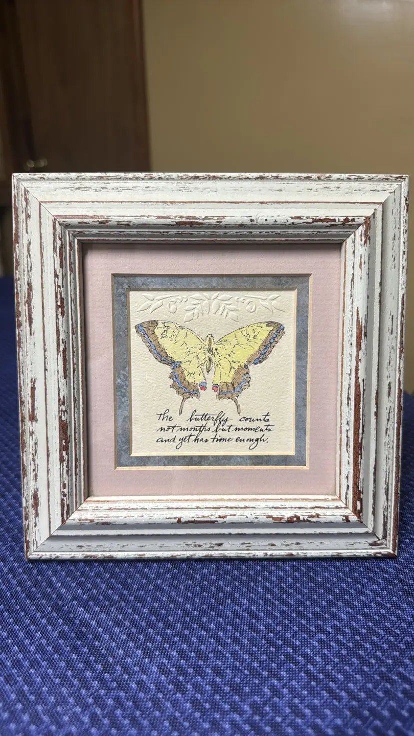 Mpressions Framed Embossed Print Hand Painted Bluebird Distressed Frame 7" Square Enhance your home with this charming rustic frame featuring a delicate butterfly design. The white and brown tones add a touch of elegance to any room. Beautiful handpainted and embossed and double matted in blue and pink in a cream color distressed frame Says: “The butterfly counts not months but moments and yet has time enough” Comes with original paperwork Made in Stilwell, Kansas Adorable and in like new condition (60361252)