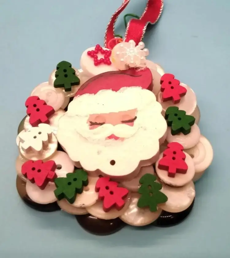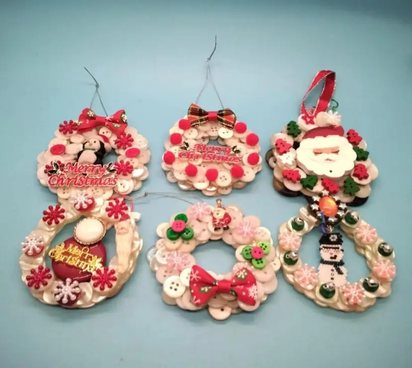 handmade Christmas button wreath ornaments. Each ornament is uniquely crafted with colorful buttons, ribbons, and holiday-themed embellishments, including Santa, snowmen, and 'Merry Christmas' messages. Perfect for hanging on your tree or gifting to loved ones. In excellent condition and ready to bring holiday cheer!