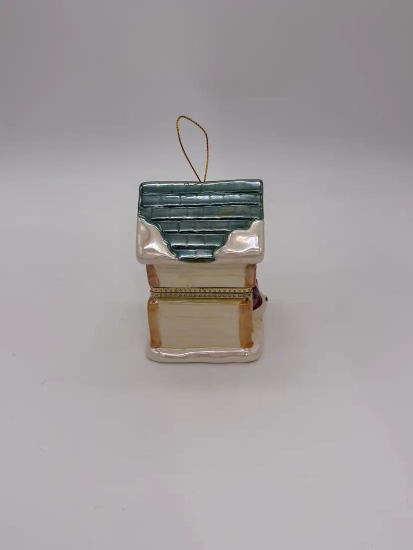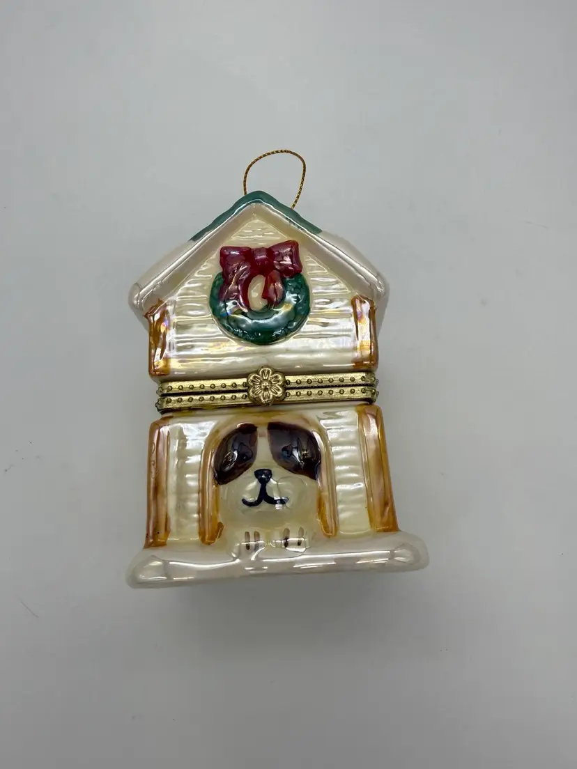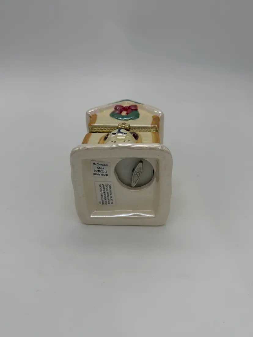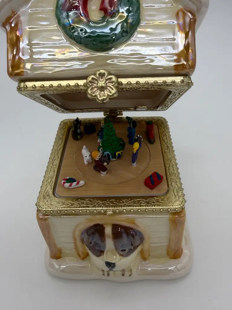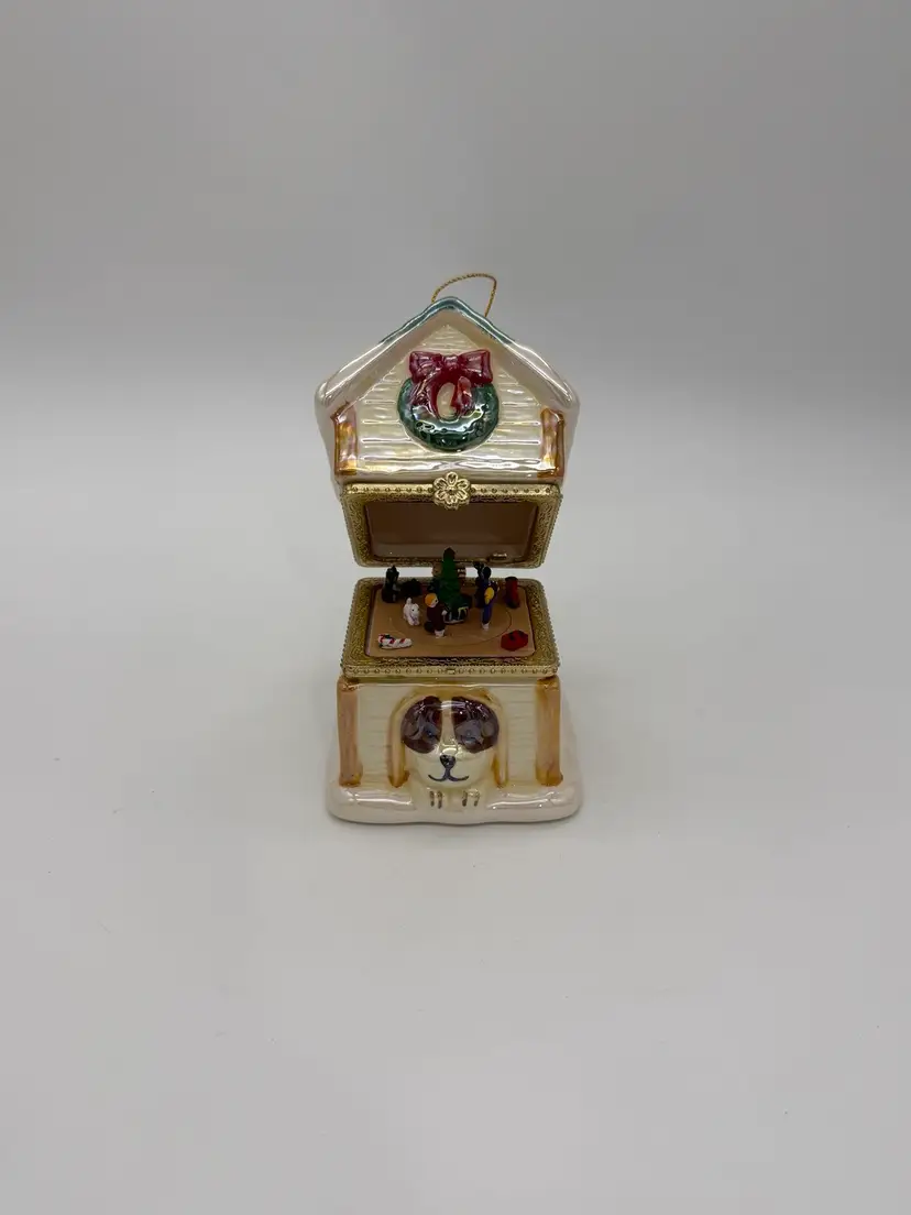 The Mr. Christmas 2012 "Tis The Season" Hinged Puppy Dog House Musical Ornament or shelf sitting figurine is approximately 4-1/8” high, X 3” wide, it weighs approximately 11.9 oz, and is a charming and festive collectible item perfect for the holiday season. Made with a mix of materials including a gold metal clasp & ceramic, this multicolored music box from Mr. Christmas features an iridescent accent with a glossy finish and plays a special tune to commemorate the joy of Christmas, while the figures inside rotate around the Christmas tree. Manufactured in 2012 in China, this unique ornament is a delightful addition to any holiday decor collection. Brand New without box.