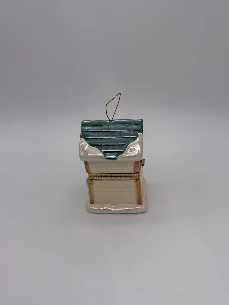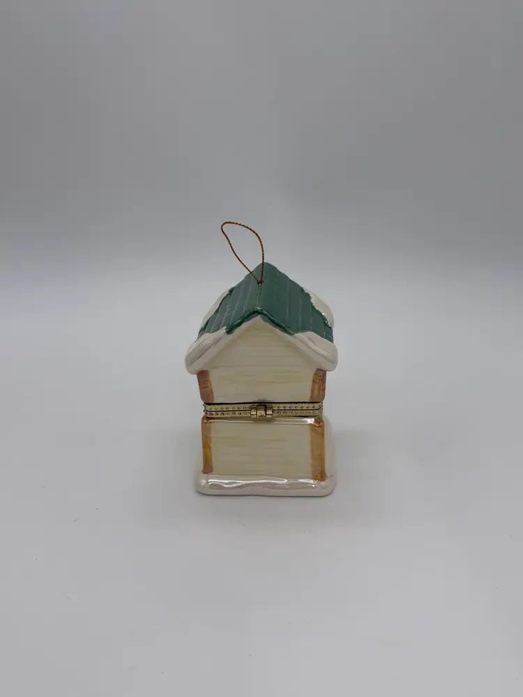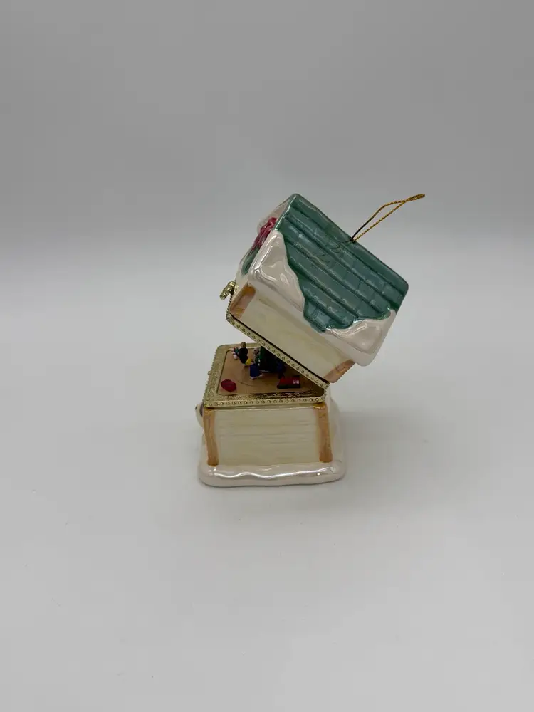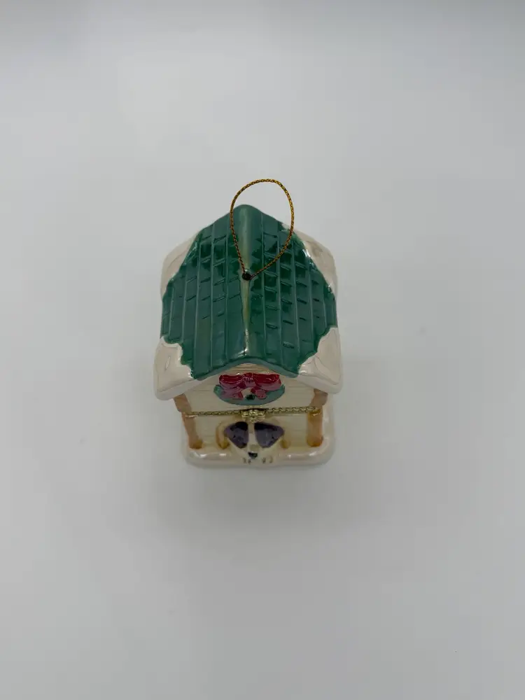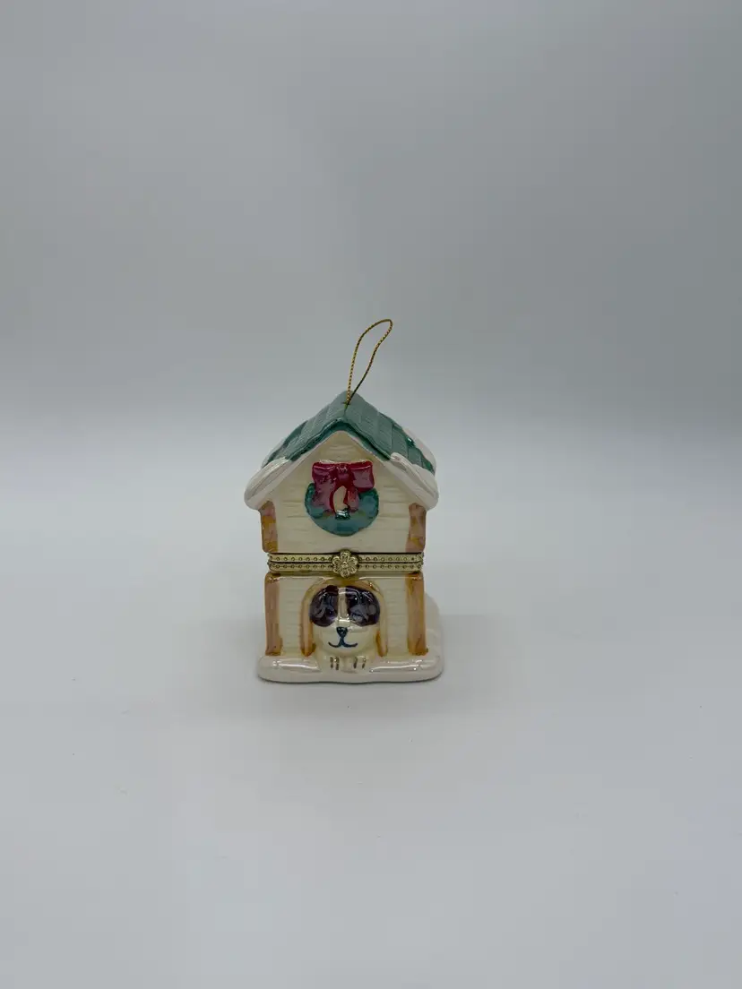 The Mr. Christmas 2012 "Tis The Season" Hinged Puppy Dog House Musical Ornament or shelf sitting figurine is approximately 4-1/8” high, X 3” wide, it weighs approximately 11.9 oz, and is a charming and festive collectible item perfect for the holiday season. Made with a mix of materials including a gold metal clasp & ceramic, this multicolored music box from Mr. Christmas features an iridescent accent with a glossy finish and plays a special tune to commemorate the joy of Christmas, while the figures inside rotate around the Christmas tree. Manufactured in 2012 in China, this unique ornament is a delightful addition to any holiday decor collection. Brand New without box.