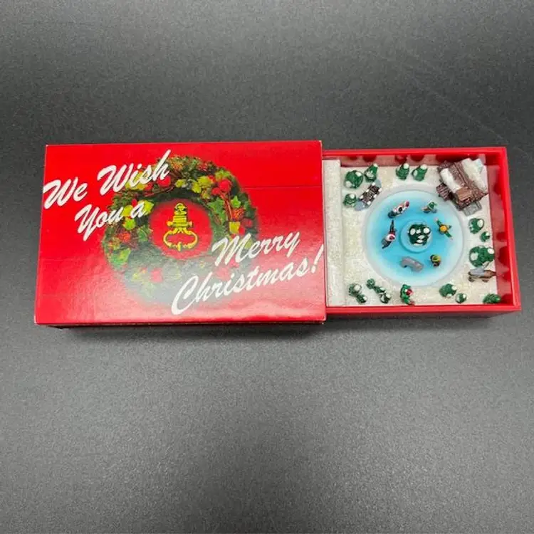 Charming miniature Christmas scene featuring an ice skating rink with tiny skaters and festive decorations. Perfect for adding a nostalgic touch to your holiday decor.