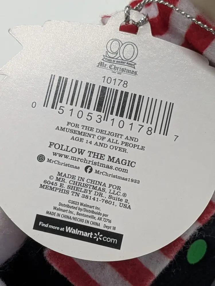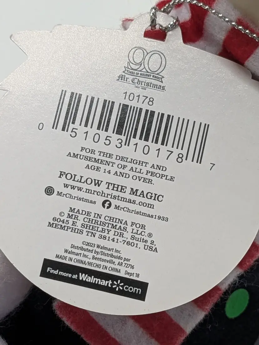 Cute! Good condition. New old stock. Mr. Christmas 2023. Measures 14" outstretched and 8" sitting. ENS