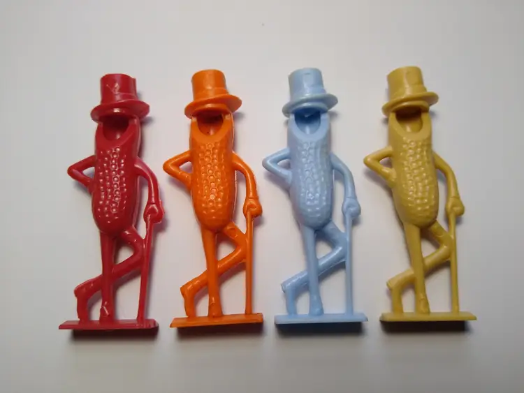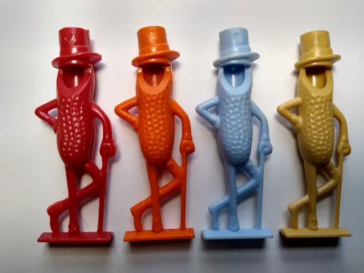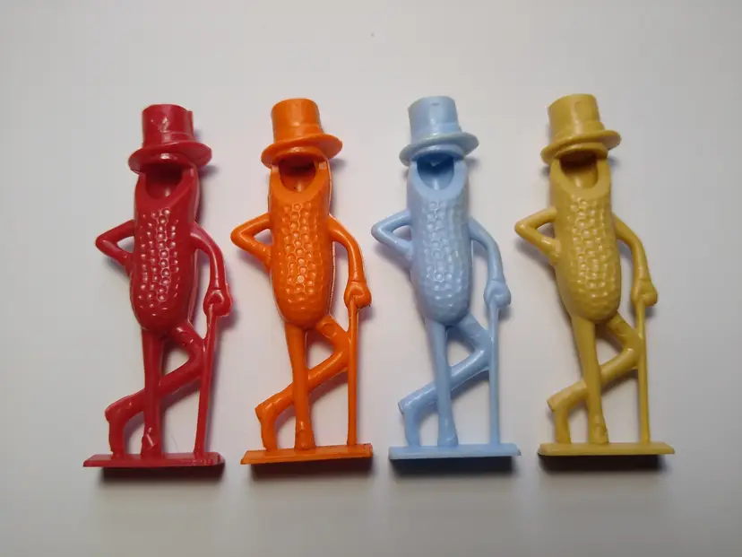 (1) Red color vintage 1950's Planters Mr. Peanut hard plastic whistle. Size is 2.5". (1) Orange color vintage 1950's Planters Mr. Peanut hard plastic whistle. Size is 2.5". (1) Blue color vintage 1950's Planters Mr. Peanut hard plastic whistle. Size is 2.5". (1) Tan color vintage 1950's Planters Mr. Peanut hard plastic whistle. Size is 2.5".