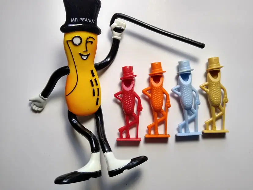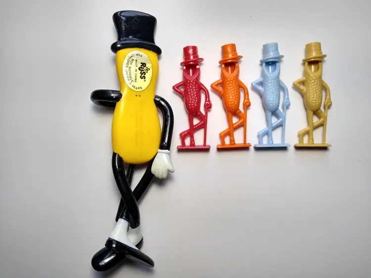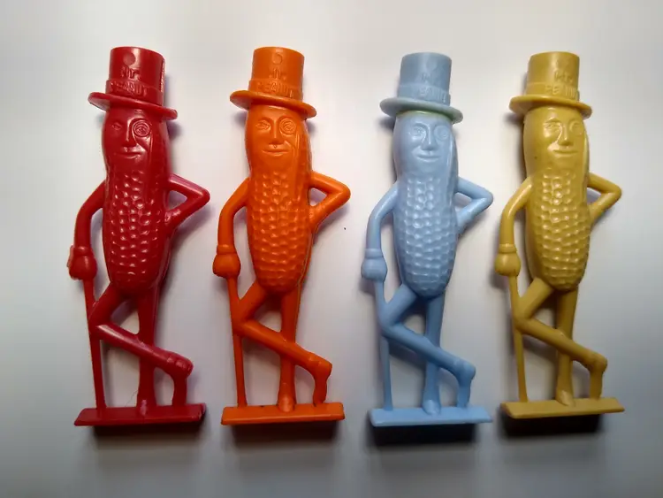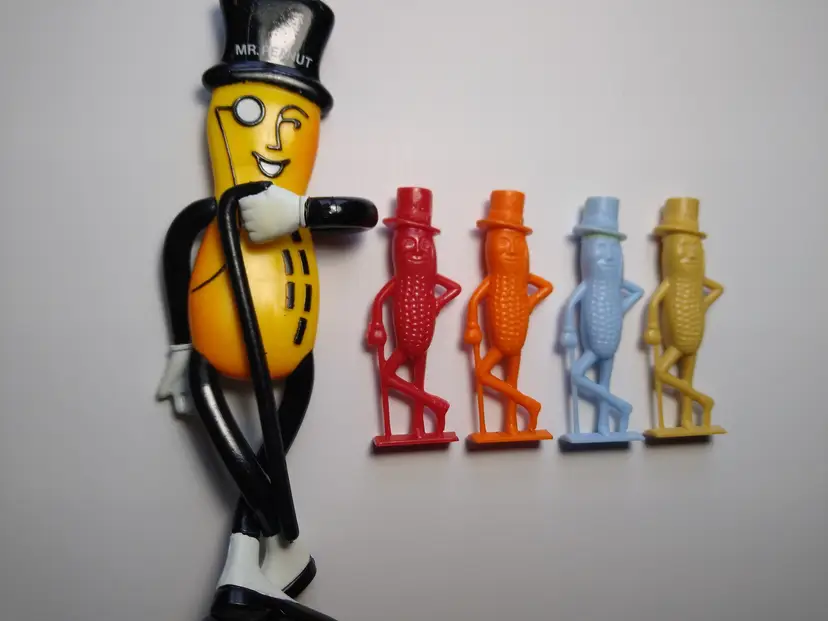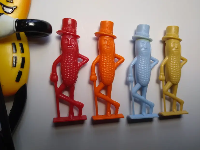 (1) Rubber bendy doll made by Russ dated 1991 with the original label on back. Size is 6" tall. (1) Red color vintage 1950's Planters Mr. Peanut hard plastic whistle. Size is 2.5". (1) Orange color vintage 1950's Planters Mr. Peanut hard plastic whistle. Size is 2.5". (1) Blue color vintage 1950's Planters Mr. Peanut hard plastic whistle. Size is 2.5". (1) Tan color vintage 1950's Planters Mr. Peanut hard plastic whistle. Size is 2.5".