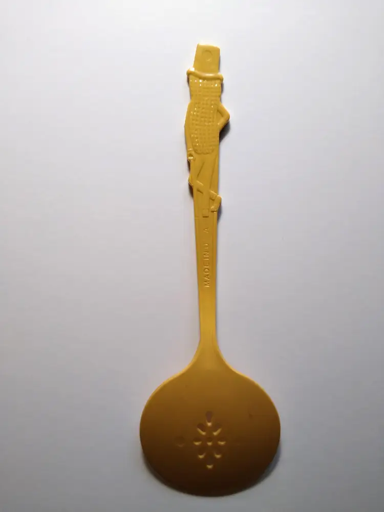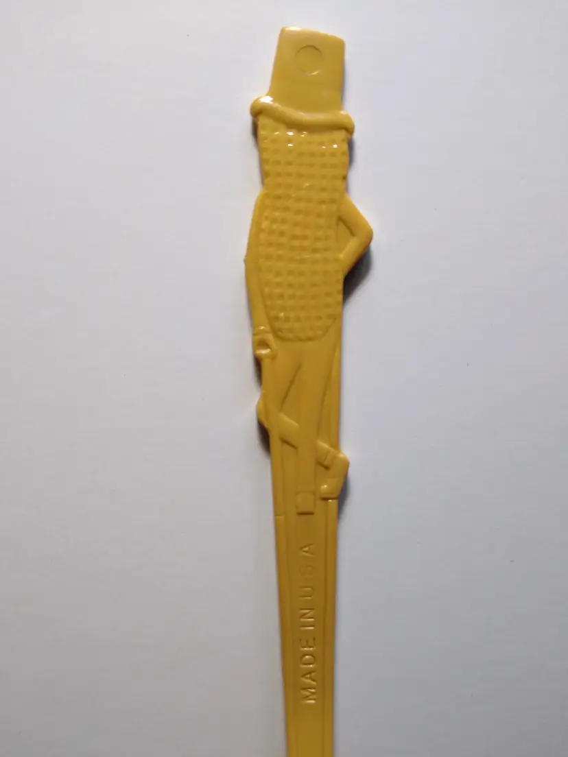 Original Planters Peanut tan color promo figure plastic serving slotted spoon. Vintage item found in old storage. Has some minor wear scuffs. Size is 5.5". Super gift for Mom or Dad.