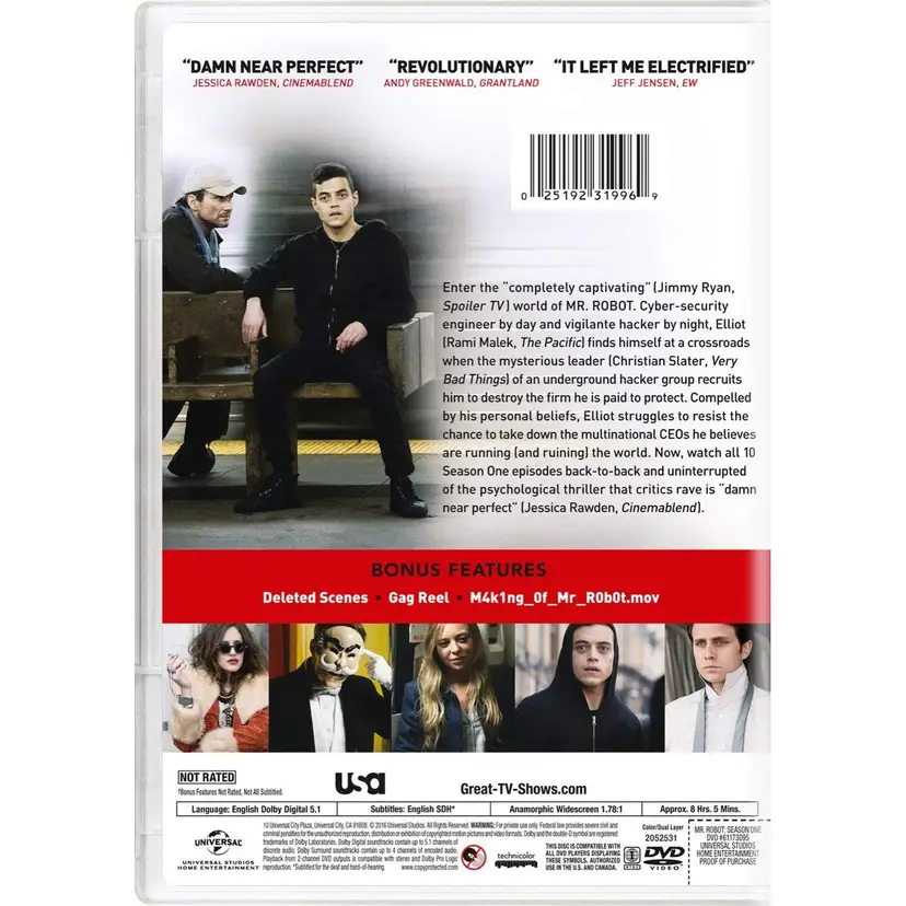 Enter the "completely captivating" (Jimmy Ryan, Spoiler TV) world of Mr. Robot. Cyber-security engineer by day and vigilante hacker by night, Elliot (Rami Malek, The Pacific) finds himself at a crossroads when the mysterious leader (Christian Slater, Very Bad Things) of an underground hacker group recruits him to destroy the firm he is paid to protect. Compelled by his personal beliefs, Elliot struggles to resist the chance to take down the multinational CEOs he believes are running (and ruining) the world. Now, watch all 10 Season One episodes back-to-back and uninterrupted of the psychological thriller that critics rave is "damn near perfect" (Jessica Rawden, Cinemablend).