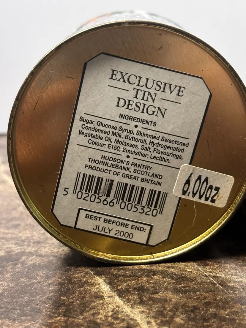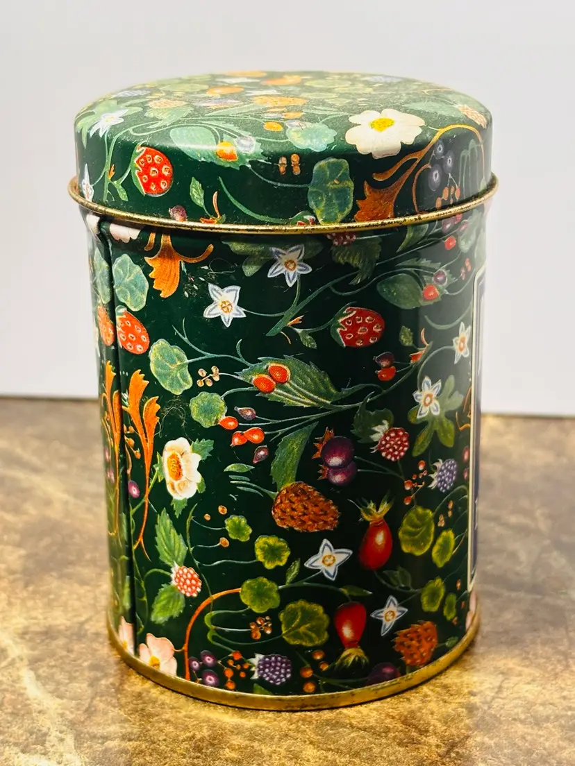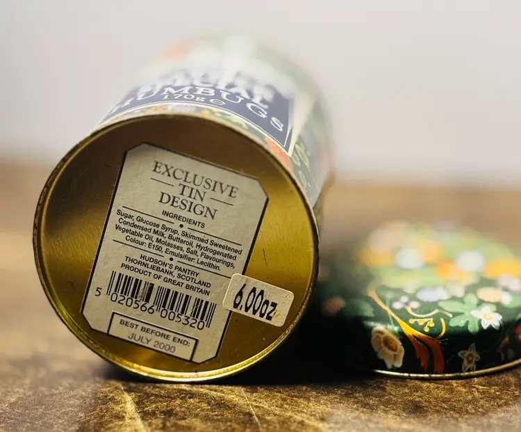 Mrs Bridges “Rather Special Humbugs,” which are a type of traditional Scottish boiled candy. The tin itself has a distinctive dark green floral design. Note in pictures a scratch on front label. The tin is part of the Mrs Bridges brand of fine foods, known for various preserves, confectioneries, and teas. 4” x 3”