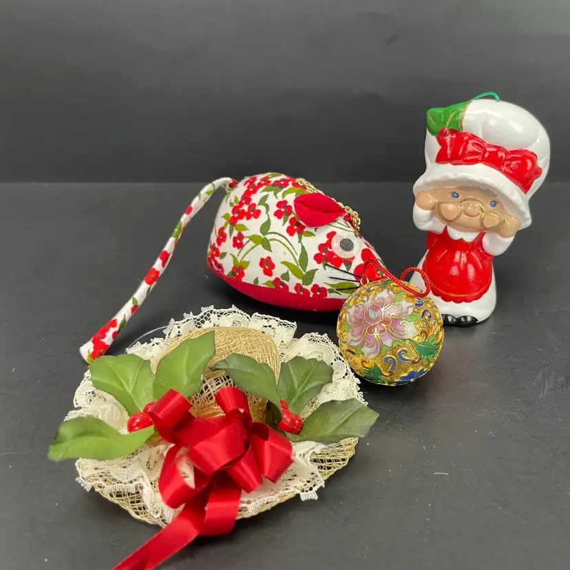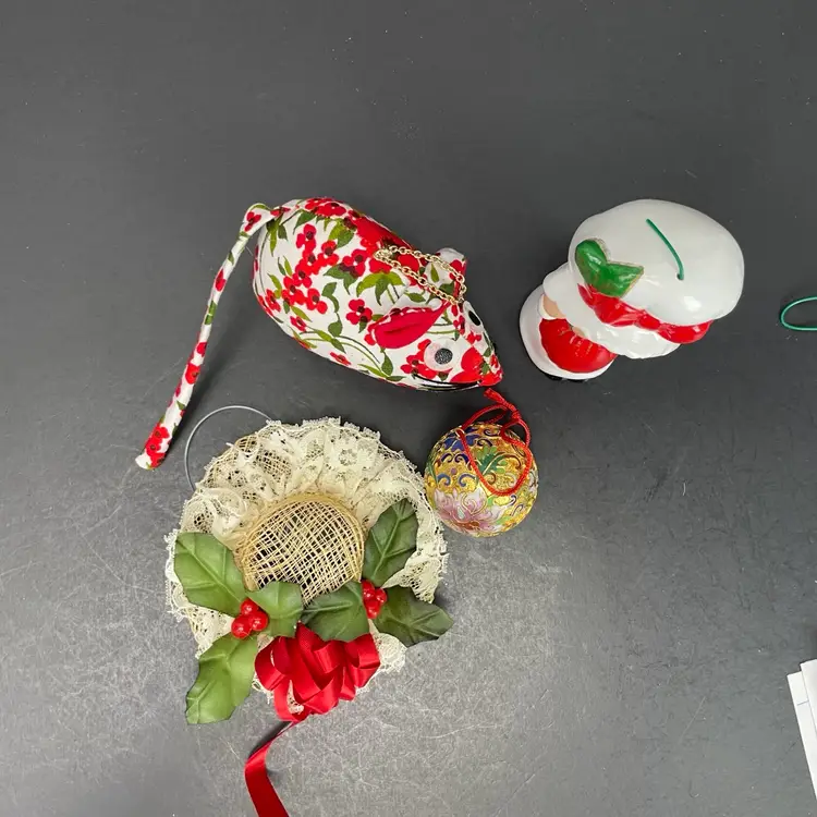 Mrs Claus Mouse Hat Orb 4 Christmas Ornaments Holiday Seasonal Decor Vintage Approximate measurements: Mrs Claus- 4in x 2.25in x 1.75in, Mouse- 2.5in x 4in x 2in, Hat 4in x 4in x 1in, Orb- 1.5in Condition: pre owned. No noticeable flaws. See photos. EbEtPoMeNn