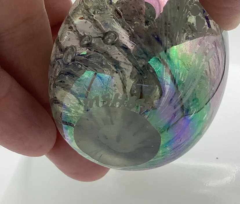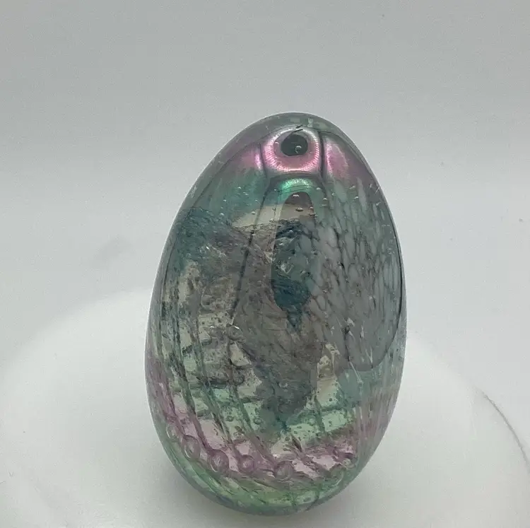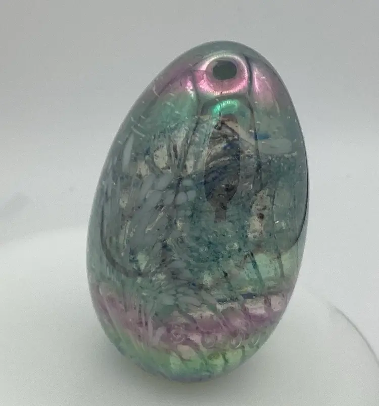 This egg shaped iridescent pink, green and white art glass paperweight measures 2.5 inches high. Made with ash from the historic Mount Saint Helens volcano eruption in 1980, it is signed MSH 1985.