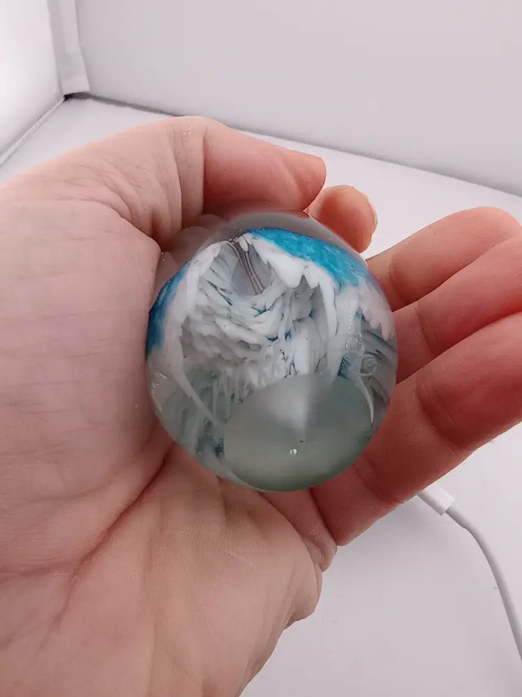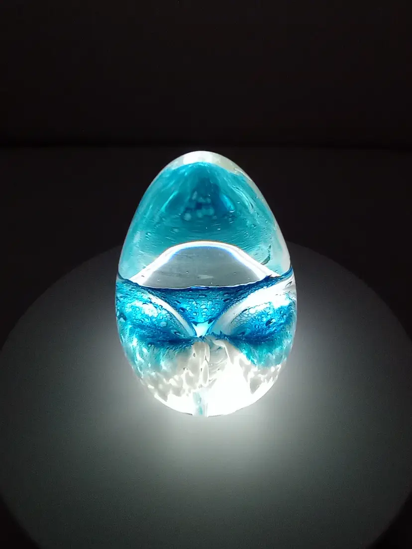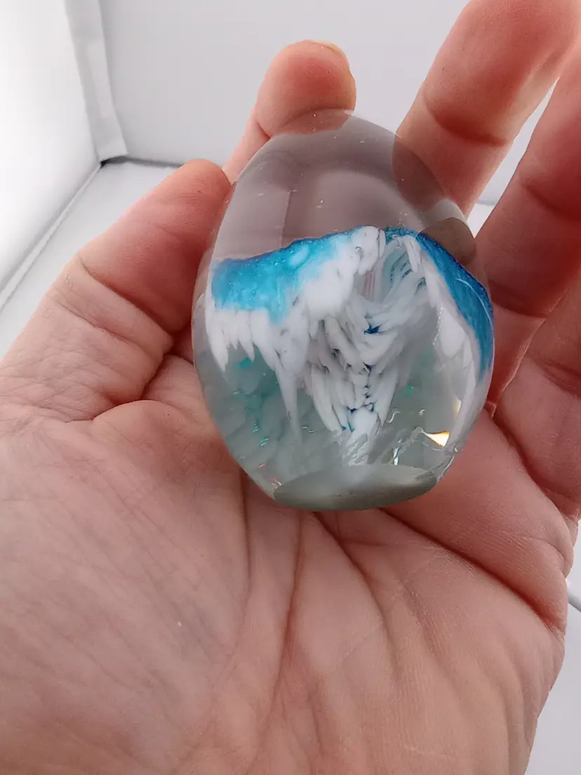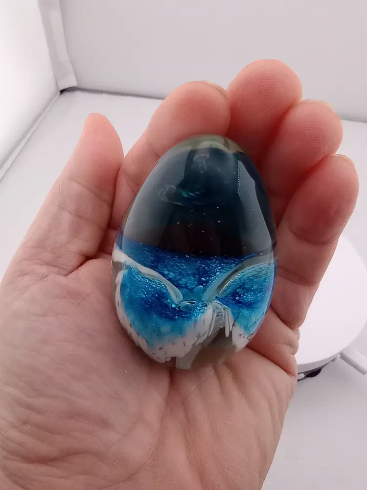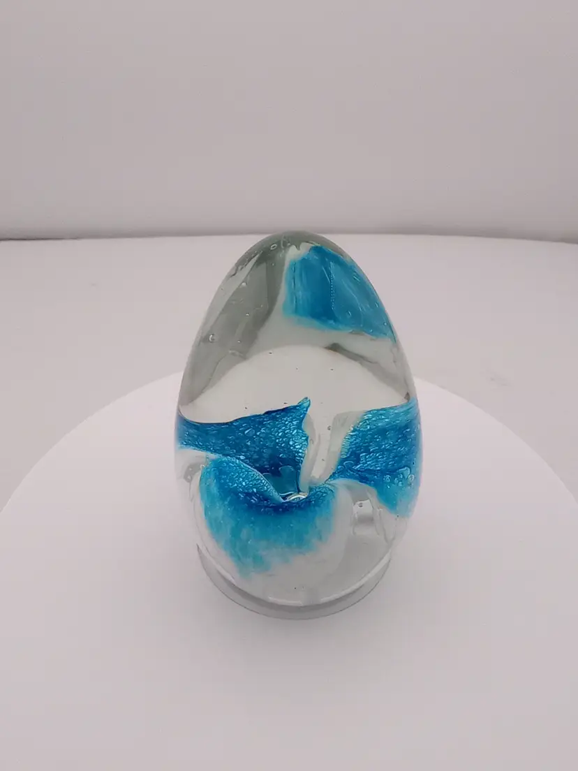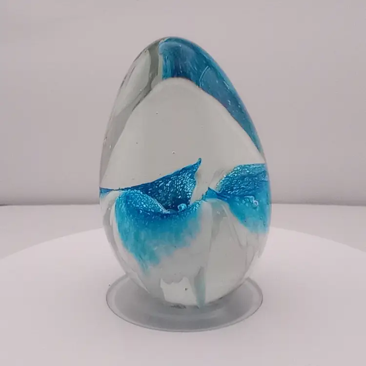 It's a lovely little egg-shaped Mt. St. Helens paperweight with a blue and white flower. It's vintage (1990), signed, and in excellent condition with no noted flaws.