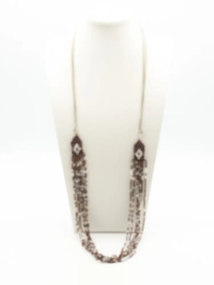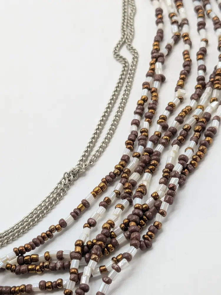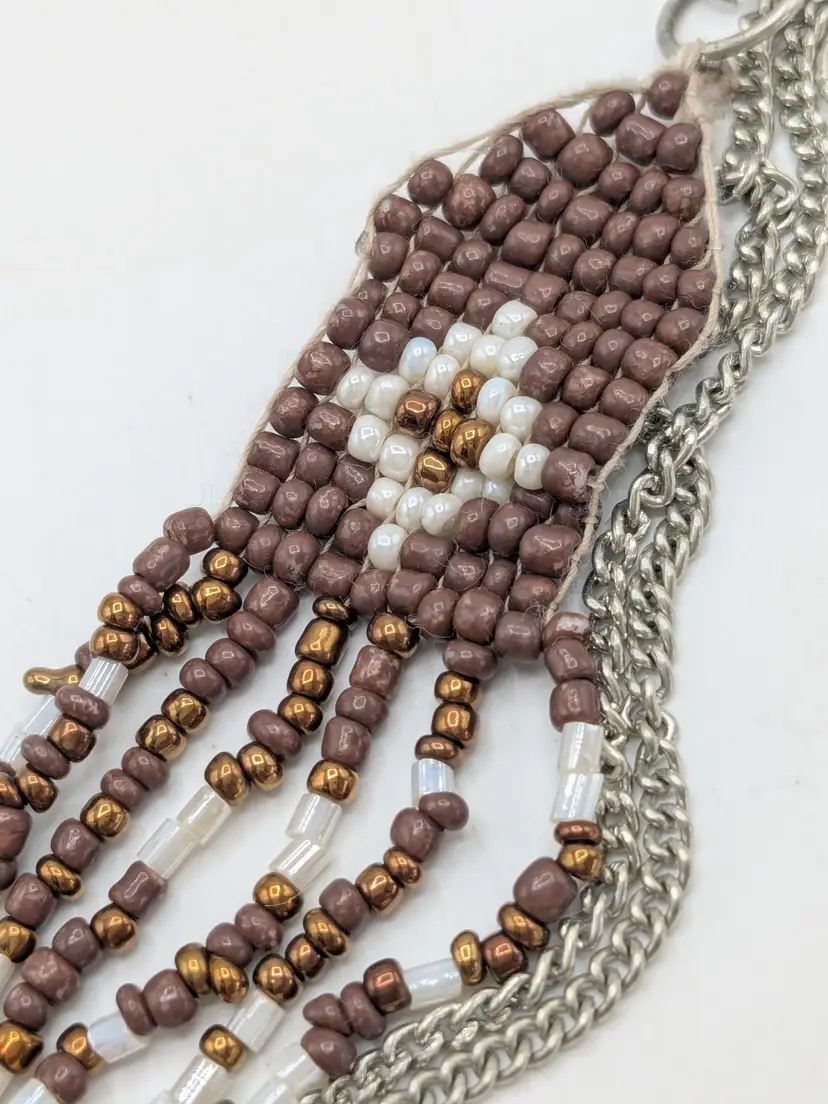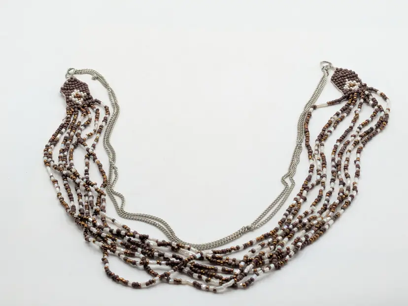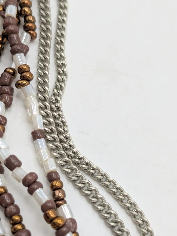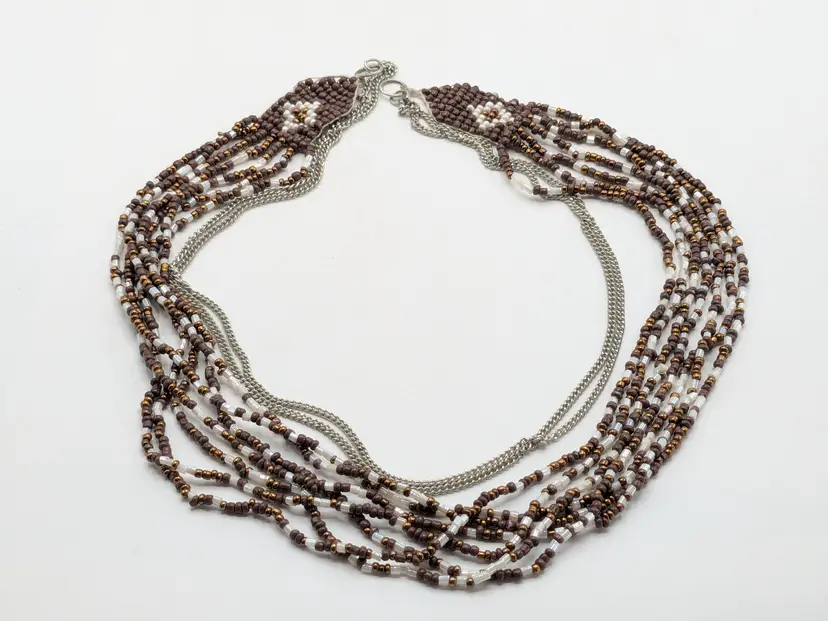 Good condition. Seven strands of brown, copper and white seed beads on a double silver tone chain. Native American style, Mudd necklace. Measures 36". EN3