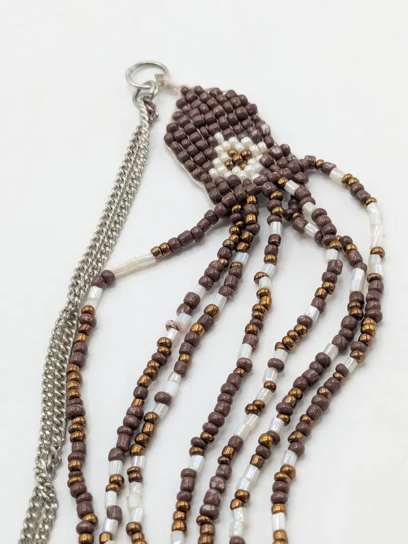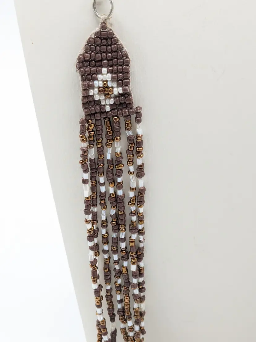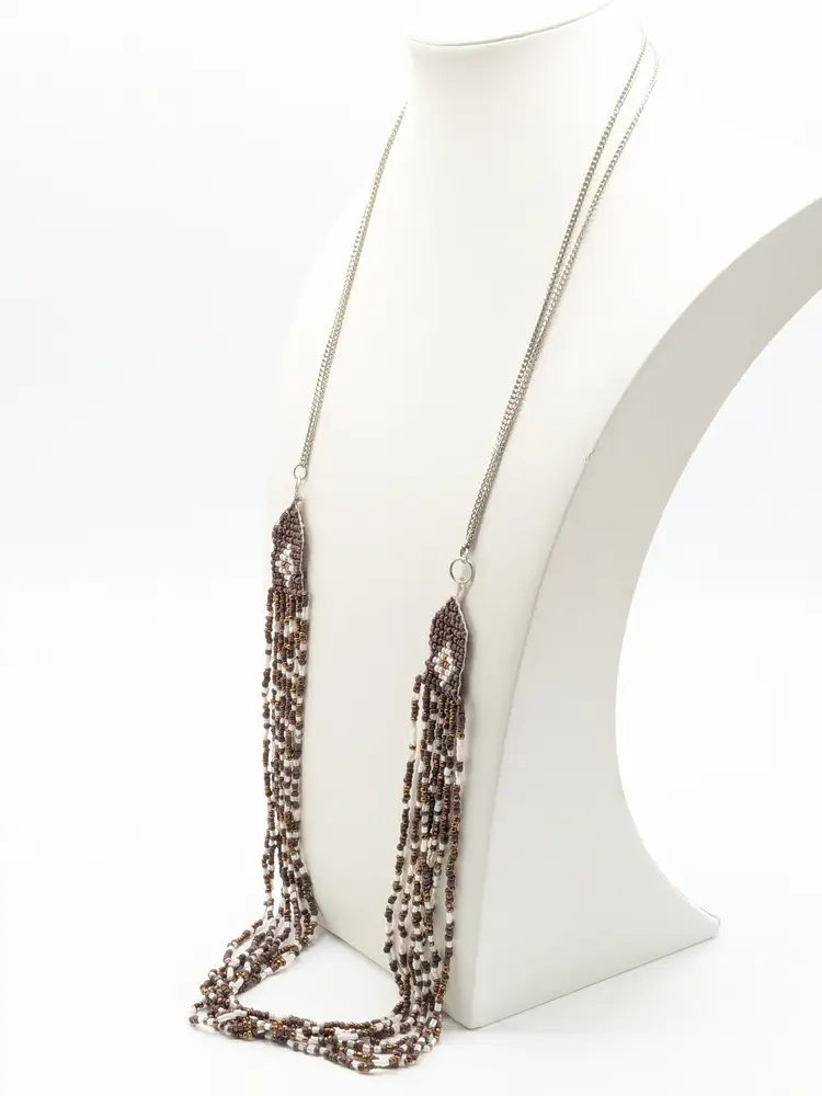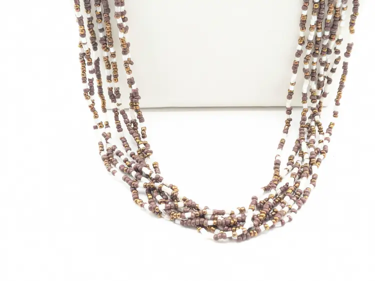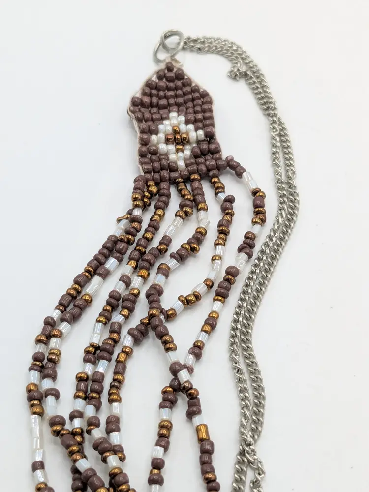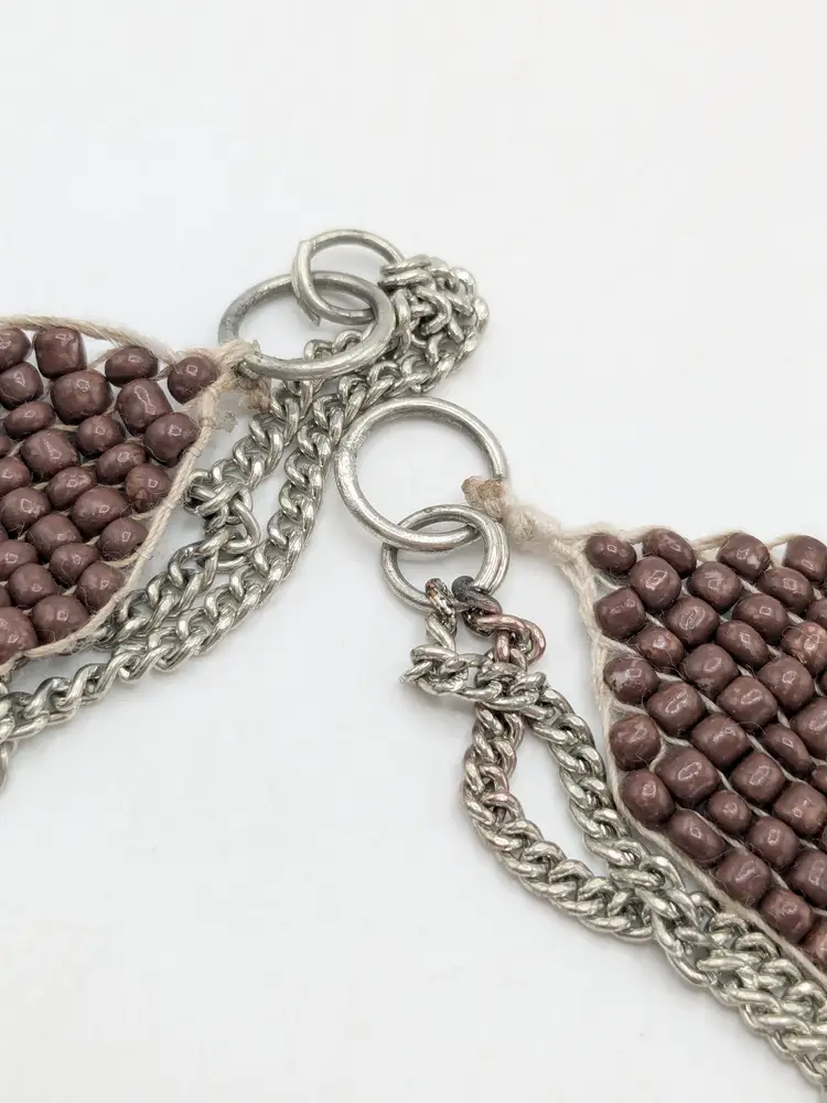 Good condition. Seven strands of brown, copper and white seed beads on a double silver tone chain. Native American style, Mudd necklace. Measures 36". EN3