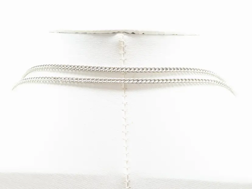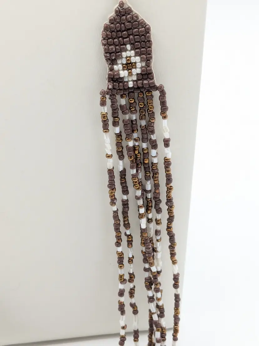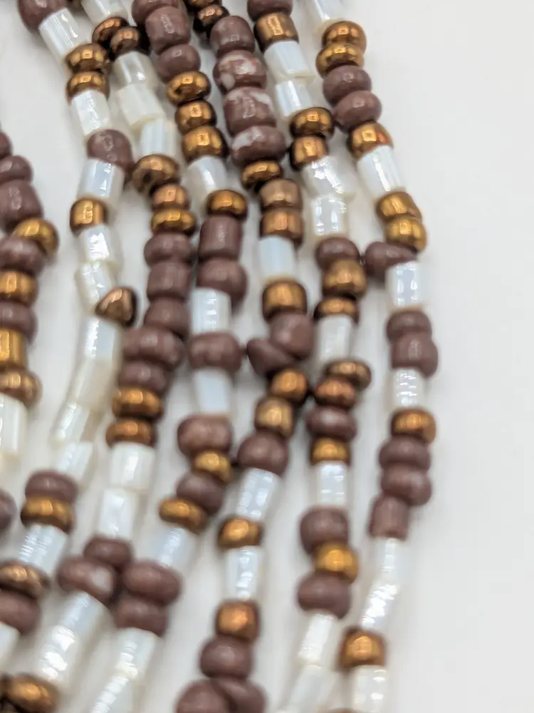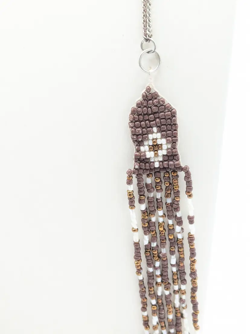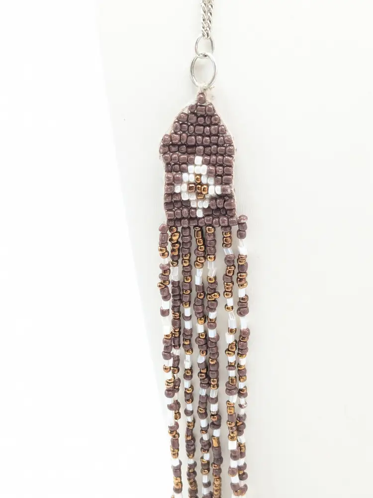Good condition. Seven strands of brown, copper and white seed beads on a double silver tone chain. Native American style, Mudd necklace. Measures 36". EN3