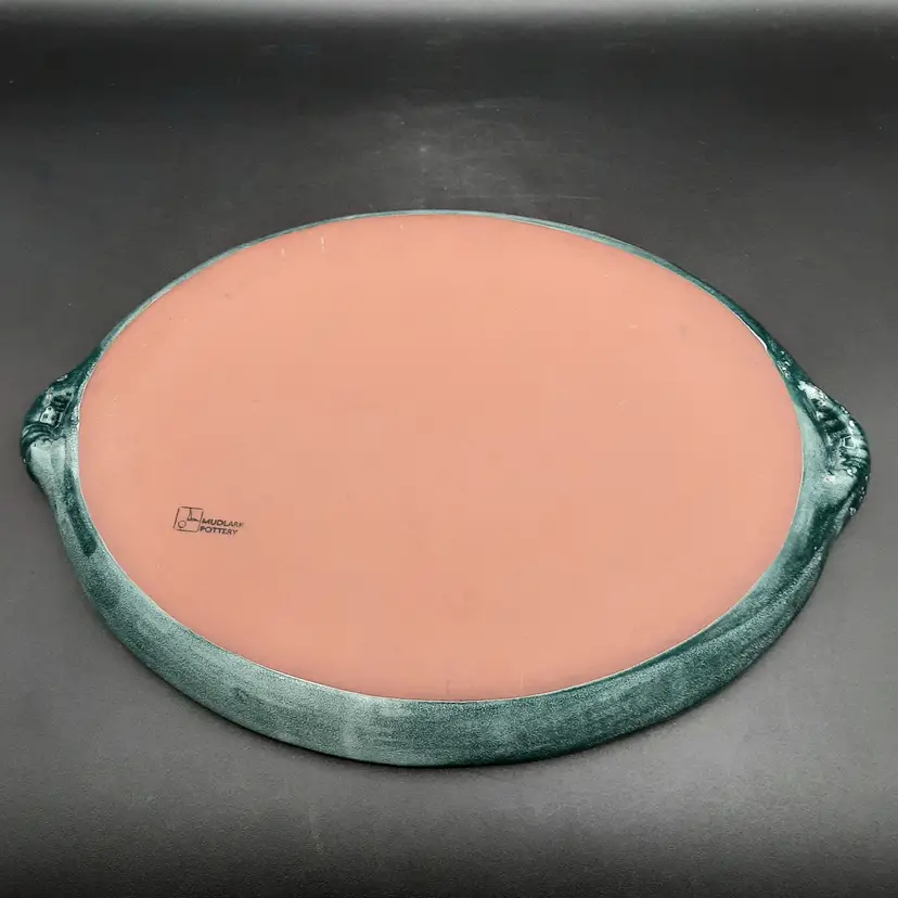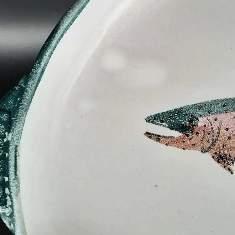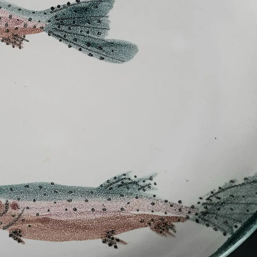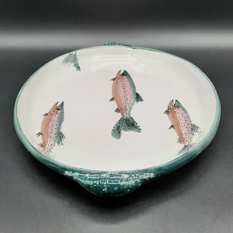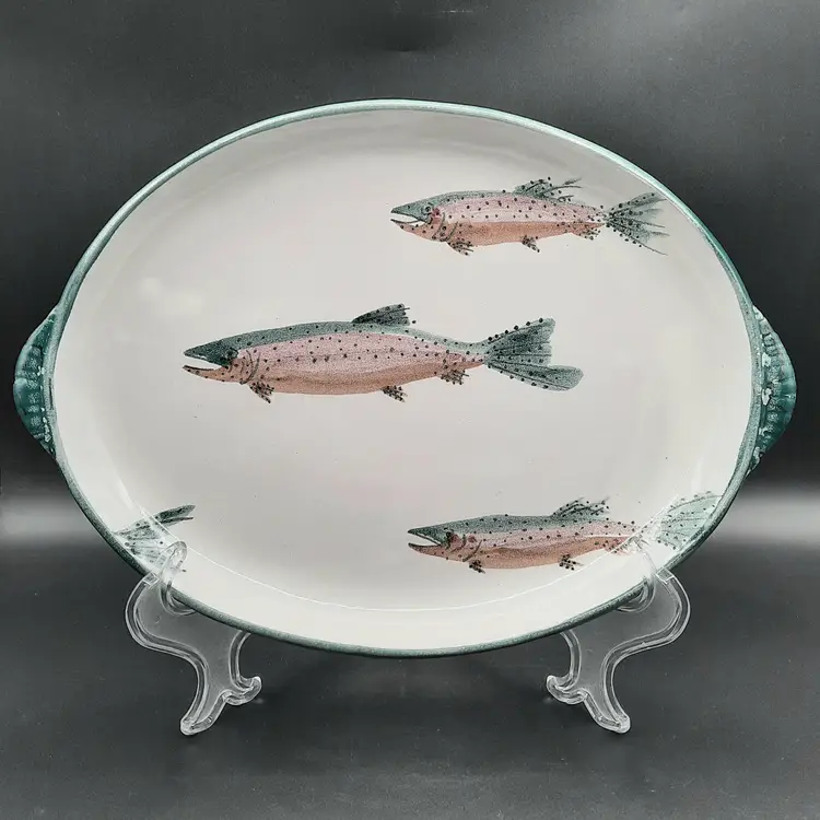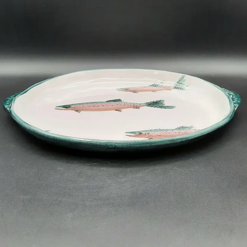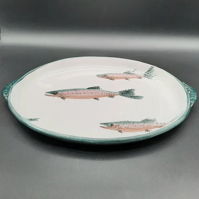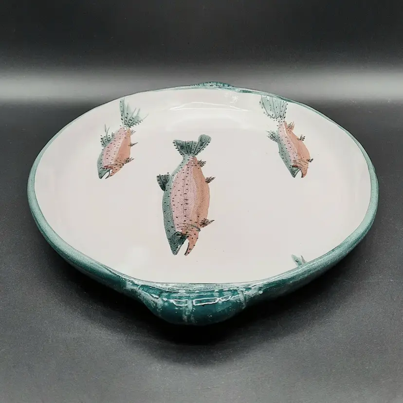Fantastic fish tray is 13 3/4" to outside handles x 9 3/4" x 1 1/4"H, very good condition with some spots/uneven color in finish that are design flaws I also have a smaller dish in this same design listed!