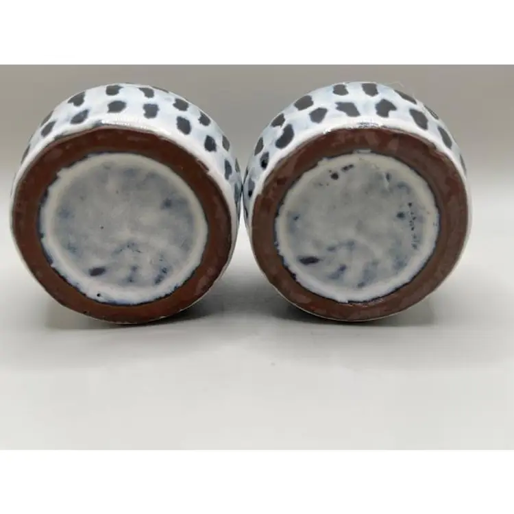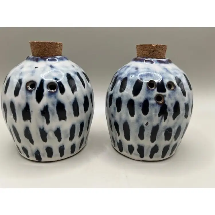Enhance your kitchen decor with this charming pair of stoneware salt and pepper shakers. Featuring a striking blue and white pattern and cork stoppers, these bottles are perfect for sprucing up your kitchen or table area. A stylish and functional addition to any home.