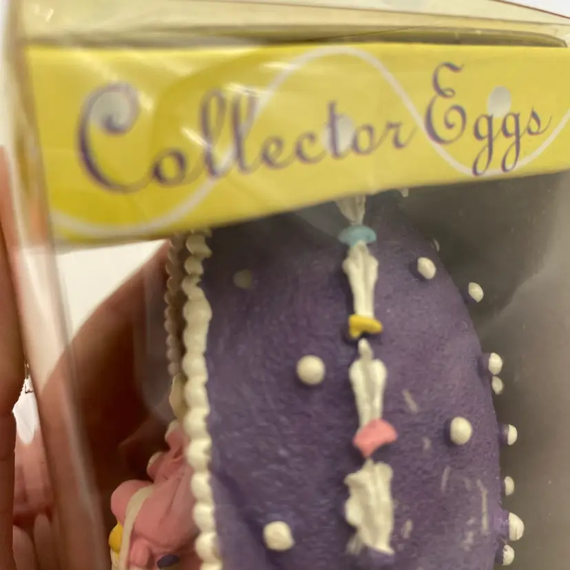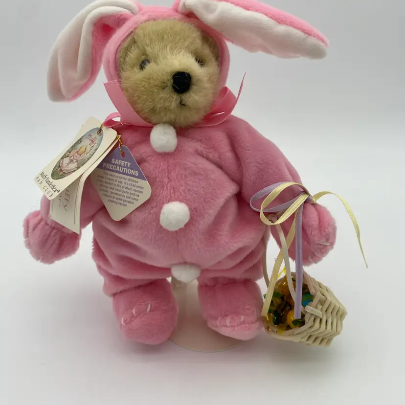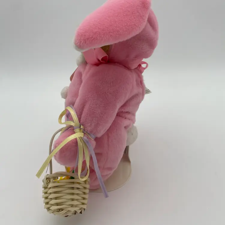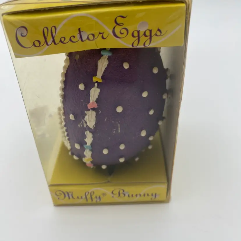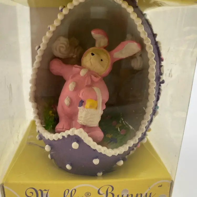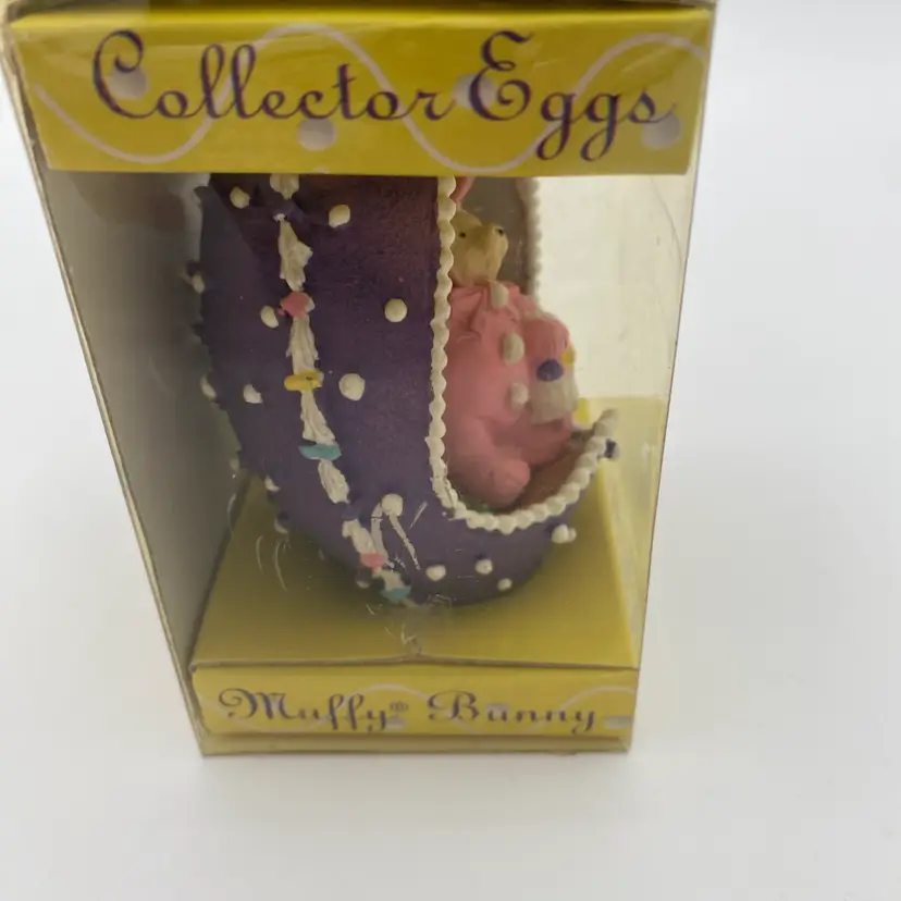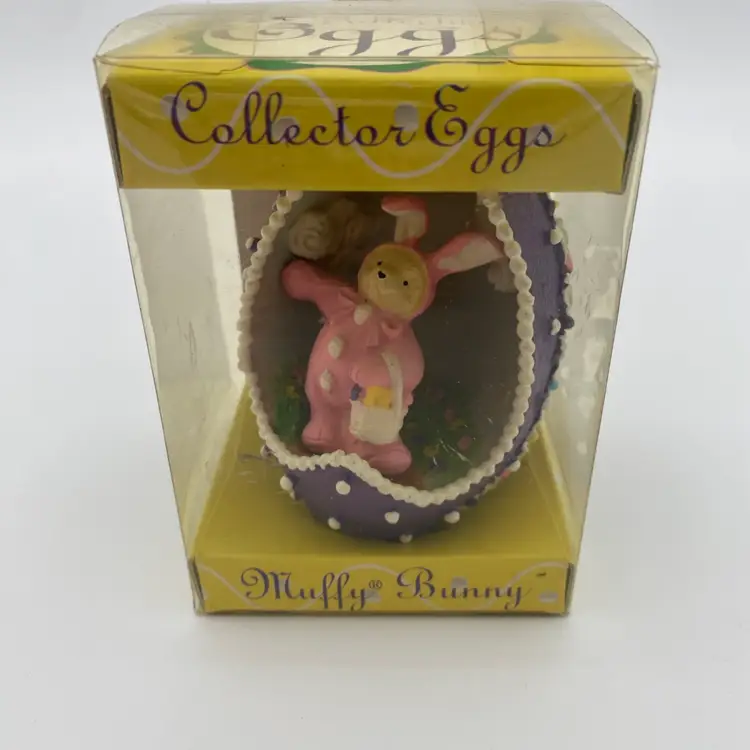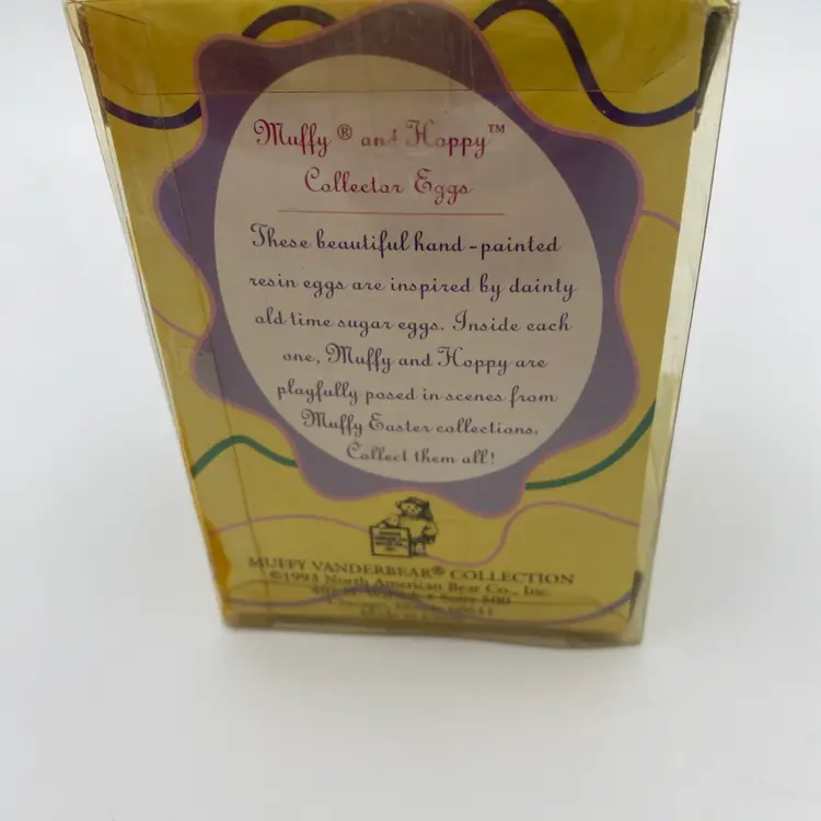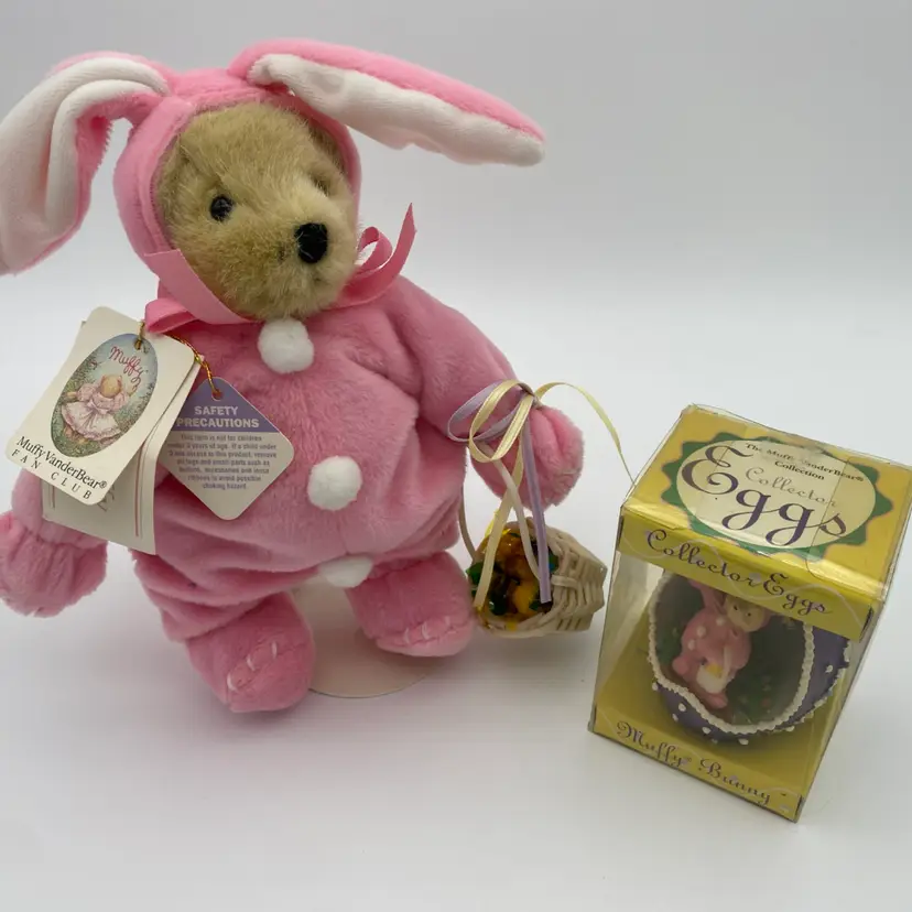 You are purchasing a pair of Muffy Bunny Items by North American Bear Company and their 1993 Muffy VanderBear Collection. This Listing includes one 8" Plush Bear w/ Bunny Costume, Easter Basket, Stand and Original Tags. As well as one Collector Egg w/ Original Box. These Items are in overall great condition. Bear still has original tags, no rips, holes or stains. Egg still has the box, just see final image to show one of the small white balls on the right-side exterior is broken off.