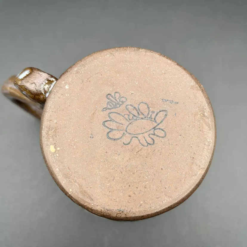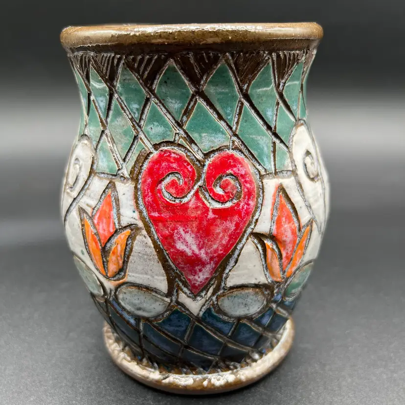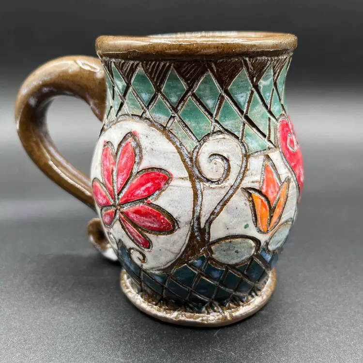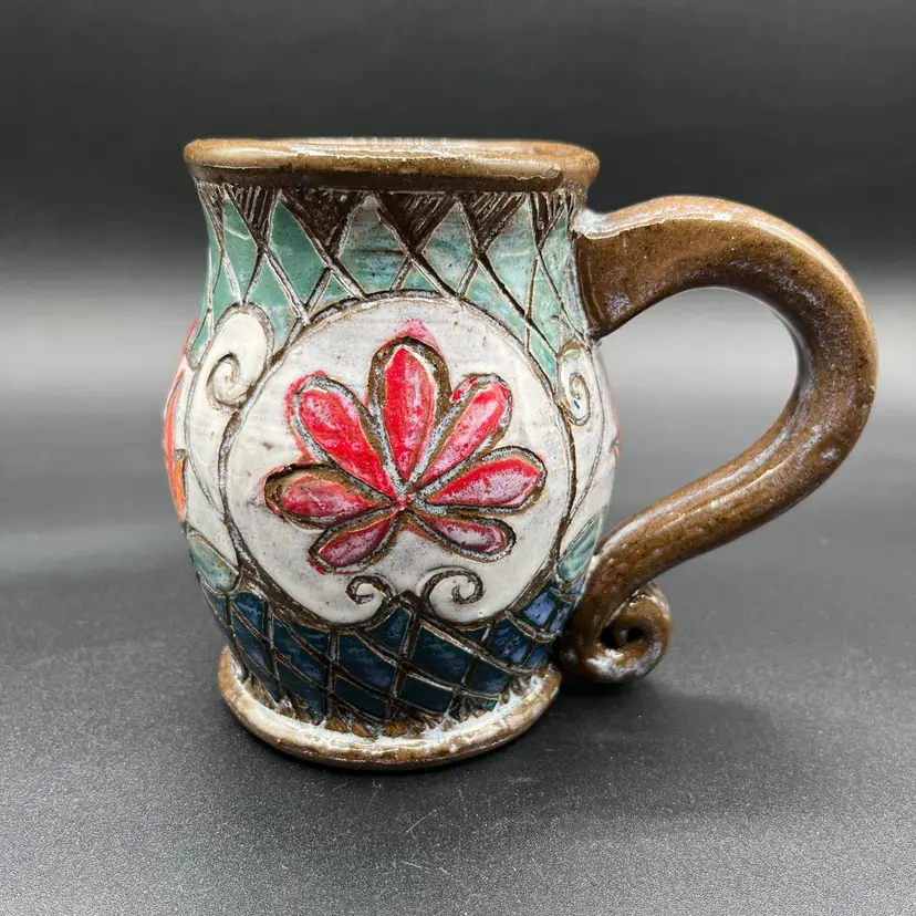 This studio mug is handmade by Deb Mulligan from Mulligan Pottery. Her shop is located in Leitchfield, Kentucky. Her designs have a Celtic feel to them. The mug features an intricate design pattern with red and orange flowers, as well as a red heart. The background colors are blue and green. Deb's stamp, featuring a flower and a hovering bee, is located on the bottom. There are no chips or cracks, and it is in excellent condition. Measurements: 4 1/2" tall, 3" wide at top, 4" at middle of mug.