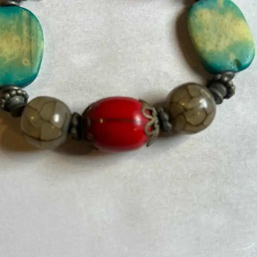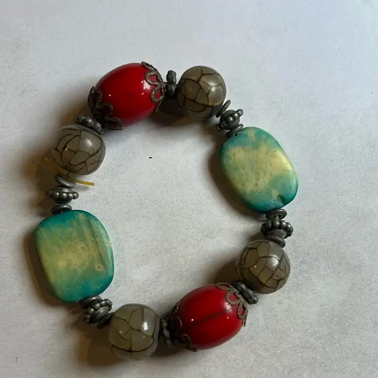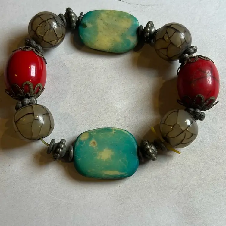 Got this chunky beaded stretch bracelet up for grabs. It's got a cool mix of red, turquoise, and grey patterned beads with some silver-tone spacers in between. It's pretty lightweight and easy to just slide on. Good for adding a bit of color to an outfit without being too much. Shows a little wear but still looks great.