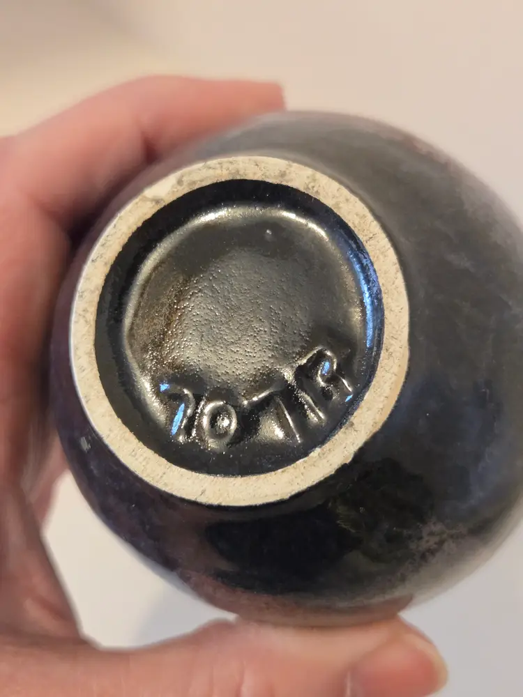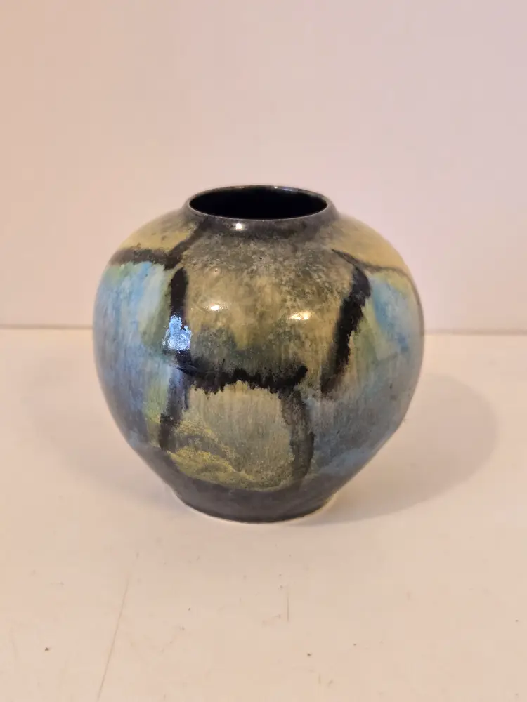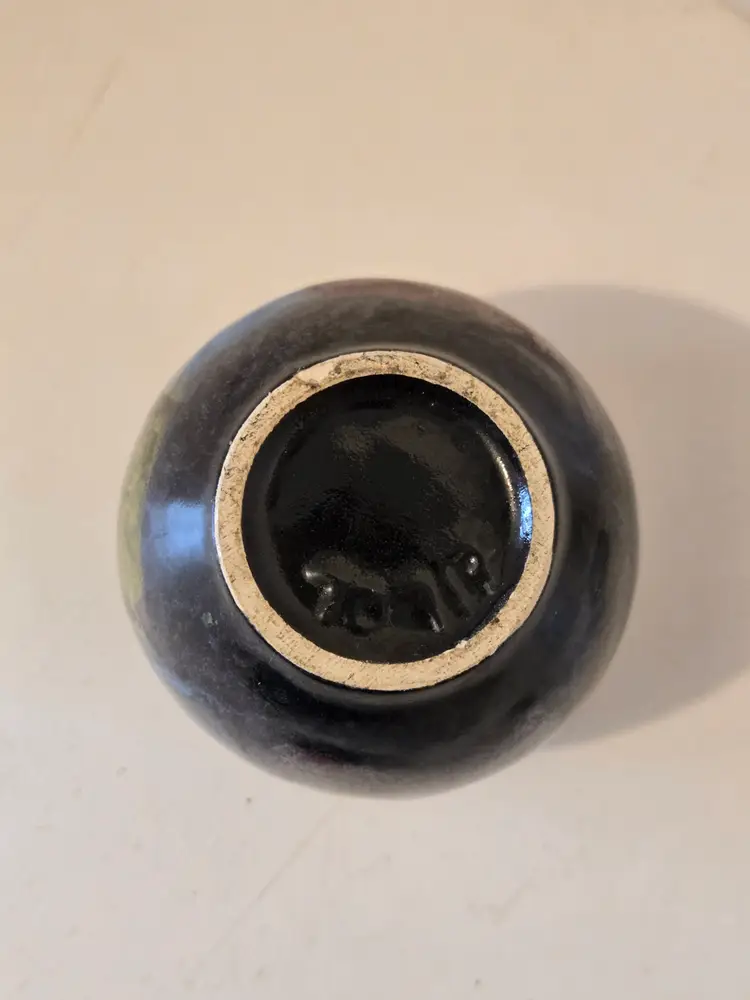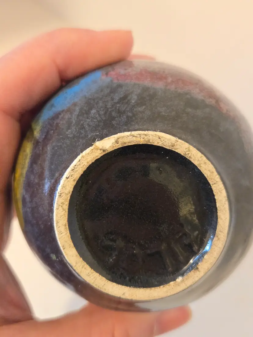 This pretty little Pot looks like stained glass but it is Ceramic, I believe from Germany. It measures approximately 2.75×2.75 inches and is in good used condition. There is one tiny chip on the base, please see the last photo.